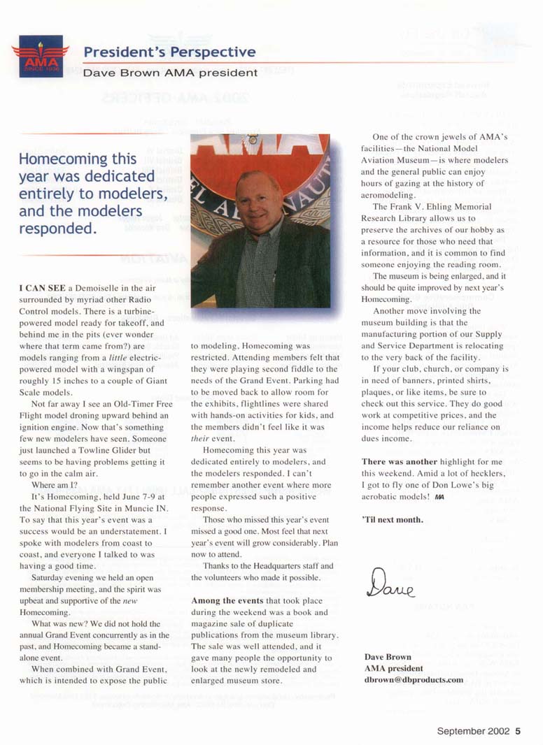 Homecoming this year was dedicated entirely to modelers, and the modelers responded. I CAN SEE a Demoiselle in the air surrounded by myriad other Radio Control models. There is a turbine-powered model ready for takeoff, and behind me in the pits (ever wonder where that term came from?) are models ranging from a little electric-powered model with a wingspan of roughly 15 inches to a couple of Giant Scale models. Not far away I see an Old-Timer Free Flight model droning upward behind an ignition engine. Now that's something few new modelers have seen. Someone just launched a Towline Glider but seems to be having problems getting it to go in the calm air. Where am I? It's Homecoming, held June 7-9 at the National Flying Site in Muncie IN. To say that this year's event was a success would be an understatement. I spoke with modelers from coast to coast, and everyone I talked to was having a good time. Saturday evening we held an open membership meeting, and the spirit was upbeat and supportive of the new Homecoming. What was new? We did not hold the annual Grand Event concurrently as in the past, and Homecoming became a standalone event. When combined with Grand Event, which is intended to expose the public to modeling. Homecoming was restricted. Attending members felt that they were playing second fiddle to the needs of the Grand Event. Parking had to be moved back to allow room for the exhibits, flightlines were shared with hands-on activities for kids, and the members didn't feel like it was their event. Homecoming this year was dedicated entirely to modelers, and the modelers responded. I can't remember another event where more people expressed such a positive response. Those who missed this year's event missed a good one. Most feel that next year's event will grow considerably. Plan now to attend. Thanks to the Headquarters staff and the volunteers who made it possible. Among the events that took place during the weekend was a book and magazine sale of duplicate publications from the museum library. The sale was well attended, and it gave many people the opportunity to look at the newly remodeled and enlarged museum store. One of the crown jewels of AMA's facilities — the National Model Aviation Museum — is where modelers and the general public can enjoy hours of gazing at the history of aeromodeling. The Frank V. Ehling Memorial Research Library allows us to preserve the archives of our hobby as a resource for those who need that information, and it is common to find someone enjoying the reading room. The museum is being enlarged, and it should be quite improved by next year's Homecoming. Another move involving the museum building is that the manufacturing portion of our Supply and Service Department is relocating to the very back of the facility. If your club, church, or company is in need of banners, printed shirts, plaques, or like items, be sure to check out this service. They do good work at competitive prices, and the income helps reduce our reliance on dues income. , " , There was another highlight for me this weekend. Amid a lot of hecklers, I got to fly one of Don Lowe's big aerobatic models! AM 'Til next month. :: Dave Brown AMA president dbrown@dbproducts.com
