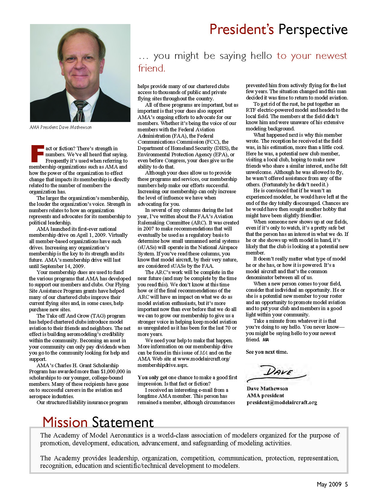 The Academy of Model Aeronautics is a world-class association of modelers organized for the purpose of