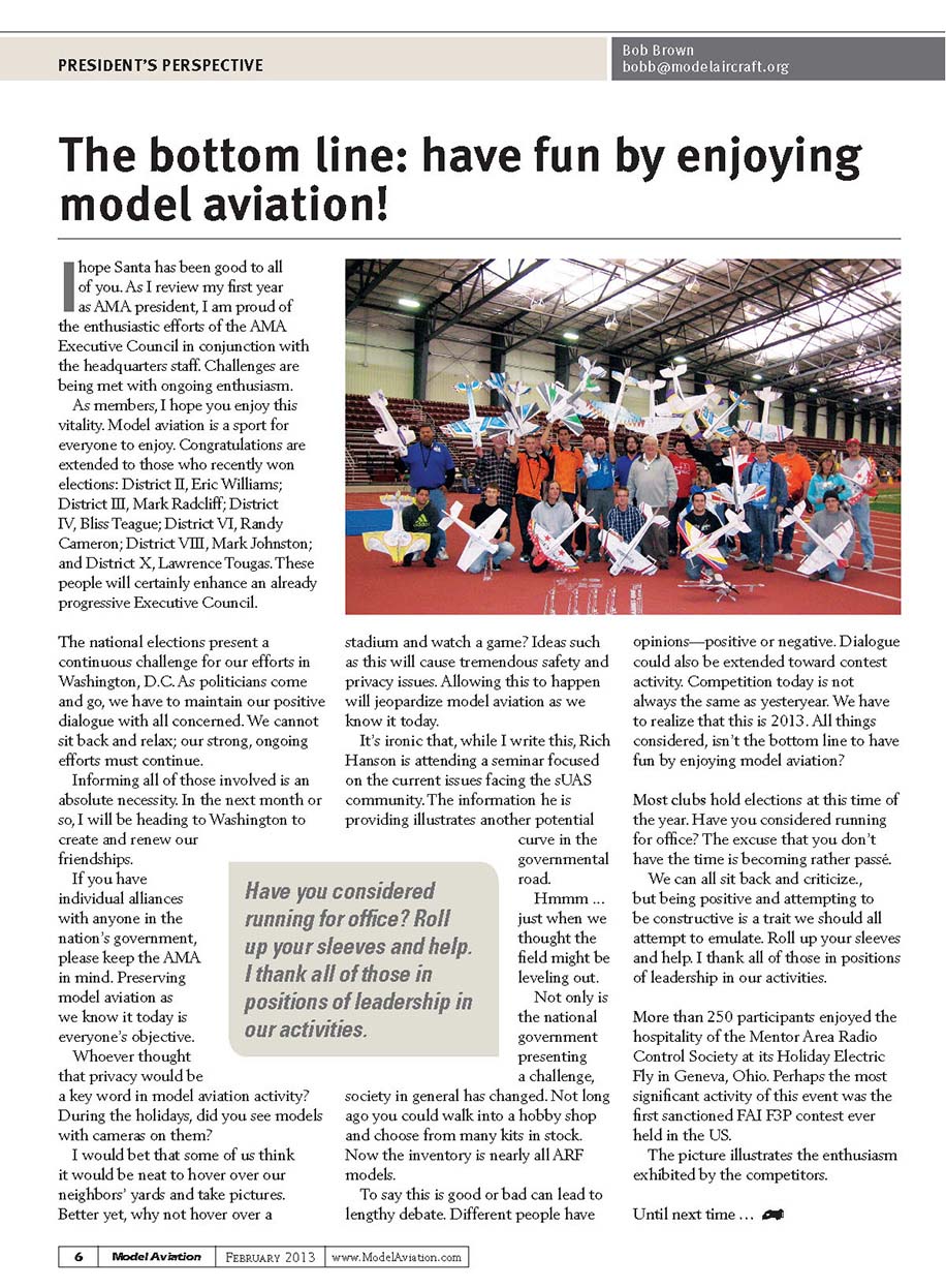 I hope Santa has been good to all of you. As I review my first year as AMA president, I am proud of the enthusiastic efforts of the AMA Executive Council in conjunction with the headquarters staff. Challenges are being met with ongoing enthusiasm. As members, I hope you enjoy this vitality. Model aviation is a sport for everyone to enjoy. Congratulations are extended to those who recently won elections: District II, Eric Williams; District III, Mark Radcliff; District IV, Bliss Teague; District VI, Randy Cameron; District VIII, Mark Johnston; and District X, Lawrence Tougas. These people will certainly enhance an already progressive Executive Council. The national elections present a continuous challenge for our efforts in Washington, D.C. As politicians come and go, we have to maintain our positive dialogue with all concerned. We cannot sit back and relax; our strong, ongoing efforts must continue. Informing all of those involved is an absolute necessity. In the next month or so, I will be heading to Washington to create and renew our friendships. If you have individual alliances with anyone in the nation’s government, please keep the AMA in mind. Preserving model aviation as we know it today is everyone’s objective. Whoever thought that privacy would be a key word in model aviation activity? During the holidays, did you see models with cameras on them? I would bet that some of us think it would be neat to hover over our neighbors’ yards and take pictures. Better yet, why not hover over a stadium and watch a game? Ideas such as this will cause tremendous safety and privacy issues. Allowing this to happen will jeopardize model aviation as we know it today. It’s ironic that, while I write this, Rich Hanson is attending a seminar focused on the current issues facing the sUAS community. The information he is providing illustrates another potential curve in the governmental road. Hmmm ... just when we thought the field might be leveling out. Not only is the national government presenting a challenge, society in general has changed. Not long ago you could walk into a hobby shop and choose from many kits in stock. Now the inventory is nearly all ARF models. To say this is good or bad can lead to lengthy debate. Different people have opinions—positive or negative. Dialogue could also be extended toward contest activity. Competition today is not always the same as yesteryear. We have to realize that this is 2013. All things considered, isn’t the bottom line to have fun by enjoying model aviation? Most clubs hold elections at this time of the year. Have you considered running for office? The excuse that you don’t have the time is becoming rather passé. We can all sit back and criticize., but being positive and attempting to be constructive is a trait we should all attempt to emulate. Roll up your sleeves and help. I thank all of those in positions of leadership in our activities. More than 250 participants enjoyed the hospitality of the Mentor Area Radio Control Society at its Holiday Electric Fly in Geneva, Ohio. Perhaps the most significant activity of this event was the first sanctioned FAI F3P contest ever held in the US. The picture illustrates the enthusiasm exhibited by the competitors. Until next time