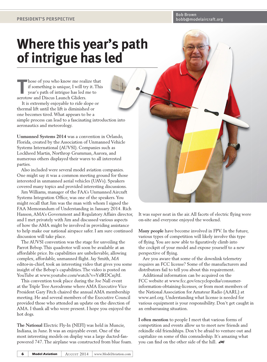Jim Williams, Manager of the FAA’s Unmanned Aircraft Systems Integration Office was one of the speakers. You might recall, Jim was the man with whom I signed the FAA Memorandum of Understanding in January 2014. Rich Hanson, AMA’s Government and Regulatory Affairs director, and I met privately with Jim and discussed various aspects of how the AMA might be involved in providing assistance to help make our national airspace safer. I am sure continued discussion will take place.