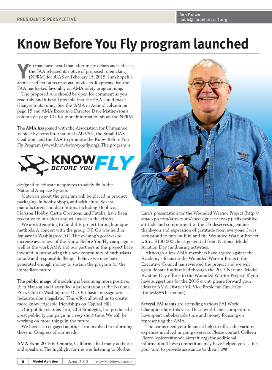 The AMA has joined with the Association for Unmanned Vehicle Systems International, the Small UAS Coalition, and the FAA to promote the Know Before You Fly Program (knowbeforeyoufly.org). The program is designed to educate a neophyte to safely fly in the National Airspace System.