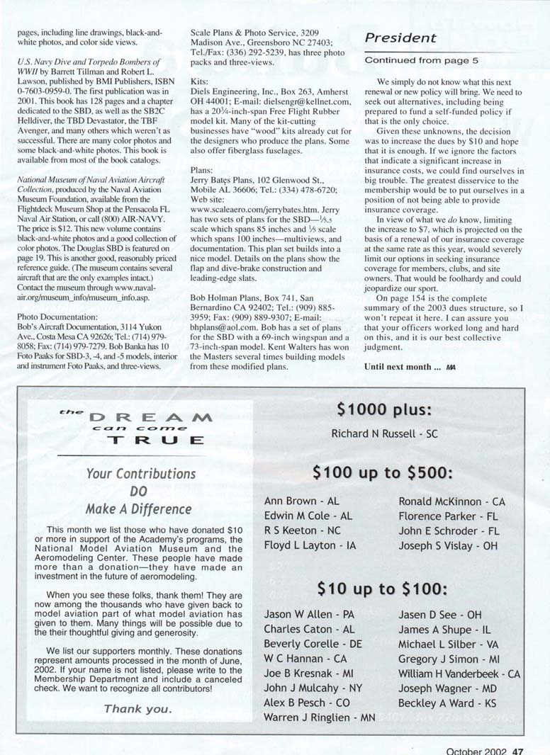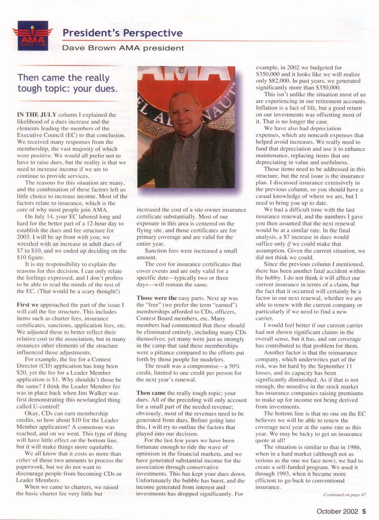 IN THE JULY column 1 explained the likelihood of a dues increase and the elements leading the members of the Executive Council (EC) to that conclusion. We received many responses from the membership, the vast majority of which were positive. We would all prefer not to have to raise dues, but the reality is that we need to increase income if we are to continue to provide services. The reasons for this situation are many, and the combination of these factors left us little choice to increase income. Most of the factors relate to insurance, which is the core of why most people join AMA. On July 14, your EC labored long and hard for the better part of a 12-hour day to establish the dues and fee structure for 2003. I will be up front with you; we wrestled with an increase in adult dues of $7 to $10. and we ended up deciding on the $10 figure. It is my responsibility to explain the reasons for this decision. I can only relate the feelings expressed, and I don't profess to be able to read the minds of the rest of the EC. (That would be a scary thought!) First we approached the part of the issue I will call the fee structure. This includes items such as charter fees, insurance certificates, sanctions, application fees. etc. We adjusted these to better reflect their relative cost to the association, but in many instances other elements of the structure influenced those adjustments. For example, the fee for a Contest Director (CD) application has long been $20, yet the fee for a Leader Member application is $1. Why shouldn't those be the same? I think the Leader Member fee was in place back when Jim Walker was first demonstrating this newfangled thing called U-control! Okay, CDs can earn membership credits, so how about $10 for the Leader Member application? A consensus was reached, and on we went. This type of thing will have little effect on the bottom line, but it will make things more equitable. We all know that it costs us more than either of those two amounts to process the paperwork, but we do not want to discourage people from becoming CDs or Leader Members. When we came to charters, we raised the basic charter fee very little but increased the cost of a site-owner insurance certificate substantially. Most of our exposure in this area is centered on the flying site, and those certificates are for primary coverage and are valid for the entire year. Sanction fees were increased a small amount. The cost for insurance certificates that cover events and are only valid for a specific date—typically two or three days—will remain the same. Those were the easy parts. Next up was the "free" (we prefer the term "earned") memberships afforded to CDs. officers. Contest Board members, etc. Many members had commented that these should be eliminated entirely, including many CDs themselves; yet many were just as strongly in the camp that said these memberships were a pittance compared to the efforts put forth by those people for modelers. The result was a compromise—a 50% credit, limited to one credit per person for the next year's renewal. Then came the really tough topic: your dues. All of the preceding will only account for a small part of the needed revenue; obviously, most of the revenues need to be generated from dues. Before going into this, I will try to outline the factors that played into our decision. For the last few years we have been fortunate enough to ride the wave of optimism in the financial markets, and we have generated substantial income for the association through conservative investments. This has kept your dues down. Unfortunately the bubble has burst, and the income generated from interest and investments has dropped significantly. For example, in 2002 we budgeted for $350.000 and it looks like we will realize only $82.000. In past years, we generated significantly more than $350.000. This isn't unlike the situation most of us are experiencing in our retirement accounts. Inflation is a fact of life, but a good return on our investments was offsetting most of it. That is no longer the case. We have also had depreciation expenses, which are noncash expenses that helped avoid increases. We really need to fund that depreciation and use it to enhance maintenance, replacing items that are depreciating in value and usefulness. Those items need to be addressed in this structure, but the real issue is the insurance plan. I discussed insurance extensively in the previous column, so you should have a casual knowledge of where we are, but I need to bring you up to date. We had a difficult time with the last insurance renewal, and the numbers I gave you then assumed that the next renewal would be at a similar rate. In the final analysis, a $7 increase in dues would suffice only if we could make that assumption. Given the current situation, we did not think we could. Since the previous column I mentioned, there has been another fatal accident within the hobby. I do not think it will affect our current insurance in terms of a claim, but the fact that it occurred will certainly be a factor in our next renewal, whether we are able to renew with the current company or particularly if we need to find a new carrier. I would feel better if our current carrier had not shown significant claims in the overall sense, but it has. and our coverage has contributed to that problem for them. Another factor is that the reinsurance company, which underwrites part of the risk, was hit hard by the September 1 I losses, and its capacity has been significantly diminished. As if that is not enough, the nosedive in the stock market has insurance companies raising premiums to make up for income not being derived from investments. The bottom line is that no one on the EC believes we will be able to renew the coverage next year at the same rate as this year. We may be lucky to get an insurance quote at all! The situation is similar to that in 1986. when in a hard market (although not as serious as the one we face no