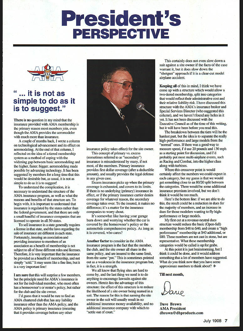 Presidents PERSPECTIVE F7f simple to suggest no question mind insurance provided AMA membership primaiy reason members join though AMA provides aeromodeler much insurance couple months back wrote column technological advancement its effect aeromodeling end column reflected idea tiered membership system method coping widening gap between basic aeromodeling higher faster bigger aeromodeling made possible advancing technology has suggested members long time would desirable usual simple to suggest understand complication necessary understand structure AIvIA insurance program well what reasons benefits structure begin important understand insurance regulated states rather federal government small handful insurance companies licensed operate 50 states sell insurance state generally requires license state laws regarding sale insurance different state Foitunately insunng association providing insurance members association benefit membership subject different rules licenses Therefore very important insurance provided benefit membership simply sold may seem like fine line very important line am sure will surprise few members principle need AMAs insurance individual member often has homeowners renters policy rather club site owner Id guess would rare find AIvIA chartered club has liability insurance other AMA policy AIvIA policy primary insurance meaning provides coverage before other insurance policy takes effect site owner concept primary vs excess sometimes referred secondary insurance misunderstood members Primary insurance provides first dollar coverage after deductible amount usually provides legal defense given case Excess insurance picks up primary coverage exhausted covers its limits no underlying primary insurance effect primary insurance carrier denies coverage whatever reason secondary coverage takes over insured makes no difference its matter insurance companies worry about Its somewhat like having garage bum down worrying whether car covered homeowners policy automobile comprehensive policy As long covered cares Another factor consider AMA insurance program fact member club site owner share same policy insured same limit same pot sometimes pointed out weakness insurance program fact strength know flying sites hard come last thing need anything encoumge lawsuits against site owners Herein lies advantage structure effect sinicture reduce likelihood site owner being named suit reason naming site owner suit will usually result no additional insurance money availability no additional insurance company settle out court certainly does slow down suit against site owner factsof case warrant it does slow down shotgun approach clear-cut model airplane accident Keeping mind think have come up structure would allow two-tiered membership split categories would reflect administrative cost relative liability risk have discussed structure AMAs insurance broker Special Services Director suggested column havent found holes yet has discussed Executive Council time writing will have before read breakdown between tiers will hardest part idea sepamte really high-performance large models normal ones good way measure speed Id use 20 pounds 130 mph starting point discussion Id probably put multi-airplane events such Racing Combat higher class along turbines crossover point would certainly affect numbers could expect category guess would get something close 80/20 split between categories would some additional insurance premium involved dont think would too much Heres bottom line able result could reduction dues majority members increase dues modelers wanting fly highperformance large models first cut revenue-neutral dues structure would reduce basic Open-full membership $48 $40 create high performance membership $40 additional $80 numbers cast stone representative What membership categories would called up grabs point just brainstorming think could done would address something lot members have suggested What think now have some approximate numbers think about next month 9OJ1W Dave Brown AMA President dbrown@dbproductscom July1998 7