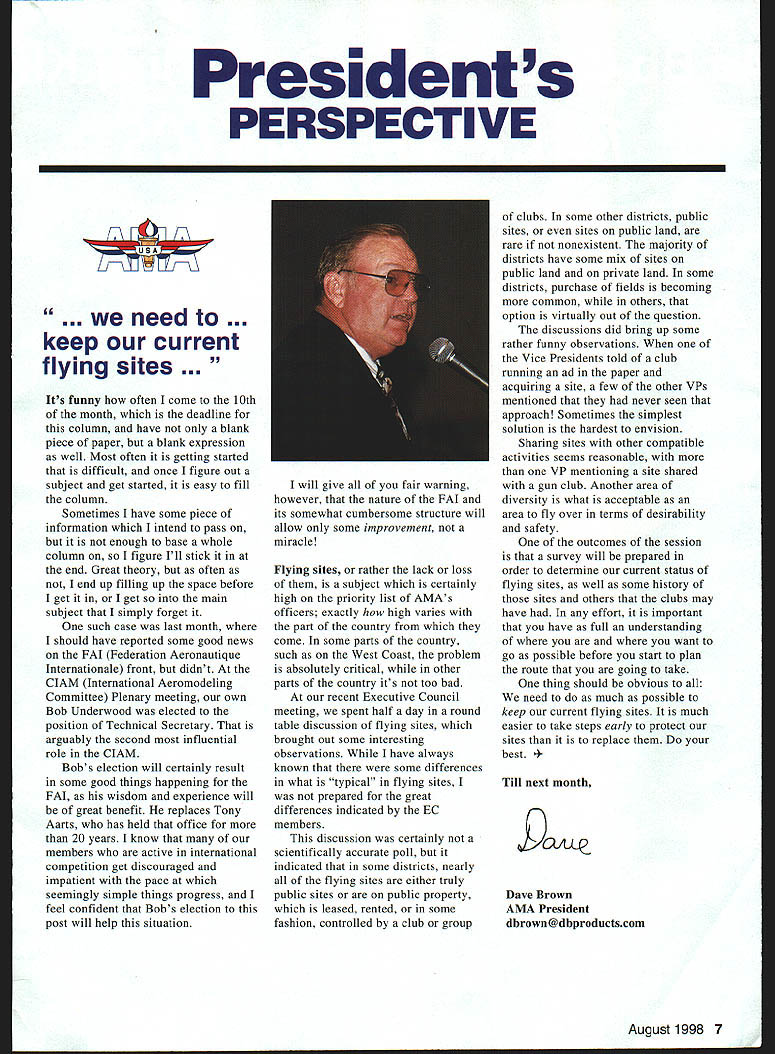 President s PERSPECTIVE /7F7/Y .we need keep current flying sites. Its funny often come 10th month deadline column have blank piece paper blank expression well Most often getting started difficult once figure out subject get started easy fill column Sometimes have some piece information intend pass enough base whole column figure Ill stick end Great theory often end up filling up space before get get main subject simply forget such case last month should have reported some good news FAT Federation Aeronautique Internationale front didnt ClAM International Aeromodeling Committee Plenary meeting own Bob Underwood elected position Technical Secretary arguably second influential role ClAM Bobs election will certainly result some good things happening FAT wisdom experience will great benefit replaces Tony Aarts has held office 20 years know members active international competition get discouraged impatient pace seemingly simple things progress feel confident Bobs election post will help situation will give fair warning however nature FAT its somewhat cumbersome structure will allow some improvement miracle Flying sites rather lack loss subject certainly high priority list AMAs officers exactly high varies part country come some parts country such West Coast problem absolutely critical other parts country its too bad recent Executive Council meeting spent half day round table discussion flying sites brought out some interesting observations have always known some differences what typical flying sites prepared great differences indicated EC members discussion certainly scientifically accurate poil indicated some districts nearly flying sites either truly public sites public property leased rented some fashion controlled club group clubs some other districts public sites sites public land rare nonexistent majority districts have some mix sites public land private land some districts purchase fields becoming common others option virtually out question discussions did bring up some rather funny observations Vice Presidents told club running ad paper acquiring site few other VPs mentioned never seen approach Sometimes simplest solution hardest envision Sharing sites other compatible activities seems reasonable VP mentioning site shared gun club Another area diversity what acceptable area fly over terms desirability safety outcomes session survey will prepared order determine current status flying sites well some history sites others clubs may have effort important have full understanding you want go possible before start plan route going take thing should obvious need much possible keep current flying sites much easier take steps early protect sites replace best next month Dave Brown AMA President dbrown@dbproductscom August1998 7