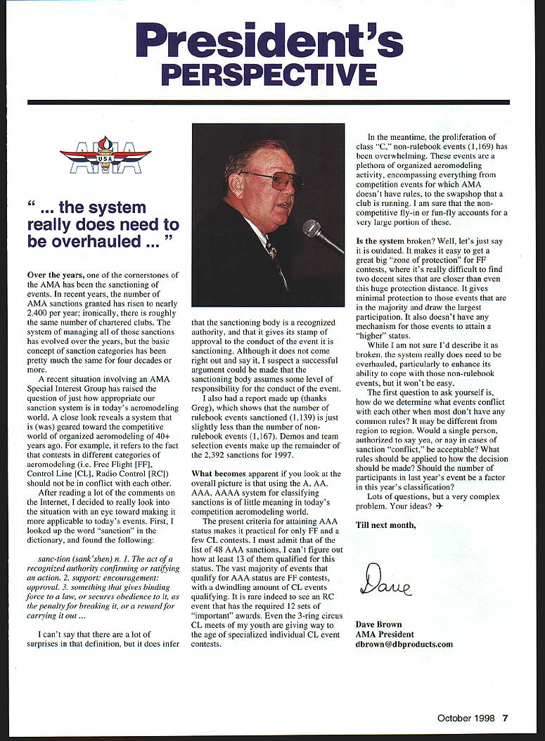 President s PERSPECTIVE .the system really does need overhauled years cornerstones AMA has sanctioning events recent years number AMA sanctions granted has risen nearly 2400 per year ironically roughly same number chartered clubs system managing sanctions has evolved over years basic concept sanction categories has pretty much same four decades recent situation involving AMA Special Interest Group has raised question just appropriate sanction system todays aeromodeling world close look reveals system geared toward competitive world organized aeromodeling 40 years ago example refers fact contests different categories aeromodeling ie Free Flight [FF1 Control Line [CL] Radio Control [RC] should conflict other After reading lot comments Internet decided really look situation eye toward making applicable todays events First looked up word sanction dictionary found following sanc-tion sankshen n 1 act recognized authority confirming ratifying action 2 support encouragement approval 3 something gives binding force law secures obedience penalty breaking reward carrying out cant say lot surprises definition does infer sanctioning body recognized authority gives its stamp approval conduct event sanctioning Although does come right out say suspect successful argument could made sanctioning body assumes some level responsibility conduct event also report made up thanks Greg shows number rulebook events sanctioned 1139 just slightly less number non rulebook events 1167 Demos team selection events make up remainder 2392 sanctions 1997 What becomes apparent look overall picture using AA AAA AAAA system classifying sanctions little meaning todays competition aeromodeling world present criteria attaining AAA status makes practical FF few CL contests must admit list 48 AAA sanctions cant figure out least 13 qualified status vast majority events qualify AAA status FF contests dwindling amount CL events qualifying rare indeed see RC event has required 12 sets important awards 3-ring circus CL meets youth giving way age specialized individual CL event contests meantime proliferation class C non-rulebook events 1169 has overwhelming events plethora organized aeromodeling activity encompassing everything competition events AMA doesnt have rules swapshop club running am sure noncompetitive fly-in fun-fly accounts very large portion system broken Well lets just say outdated makes easy get great big zone protection FF contests its really difficult find two decent sites closer huge protection distance gives minimal protection events majority draw largest participation also doesnt have mechanism events attain higher status am sure Id describe broken system really does need overhauled particularly enhance its ability cope non-rulebook events wont easy first question ask yourself determine what events conflict other dont have common rules may different region region Would single person authorized say yea nay cases sanction conflict acceptable What rules should applied decision should made Should number participants last years event factor years classification Lots questions very complex problem ideas next month 9QJ Dave Brown AMA President dbrown@dbproductscom October 1998 7