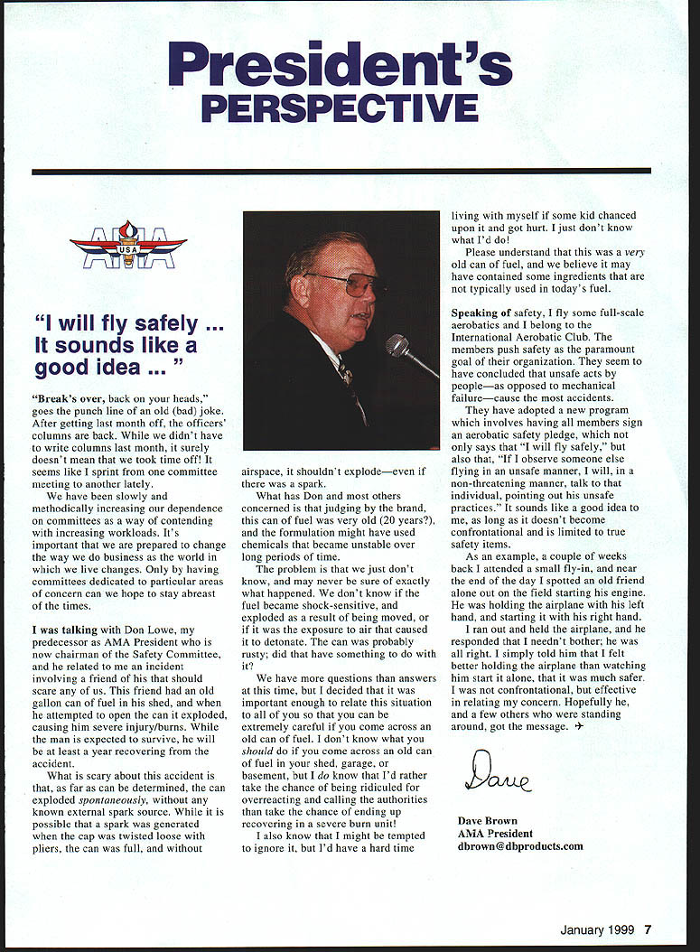 Presidents PERSPECTIVE K\ ViFV will fly safely sounds like good idea Breaks over back heads goes punch line old bad joke After getting last month off officers columns back didnt have write columns last month surely doesnt mean took time off seems like sprint committee meeting another lately have slowly methodically increasing dependence committees way contending increasing workloads Its important prepared change way business world live changes Only having committees dedicated particular areas concern can hope stay abreast times talking Don Lowe predecessor AMA President now chairman Safety Committee related incident involving friend should scare us friend old gallon can fuel shed attempted open can exploded causing him severe injury/burns man expected survive will least year recovering accident What scary about accident far can determined can exploded spontaneously known external spark source possible spark generated cap twisted loose pliers can full airspace shouldnt explodeeven spark What has Don others concerned judging brand can fuel very old 20 years formulation might have used chemicals became unstable over long periods time problem just dont know may never sure exactly what happened dont know fuel became shock-sensitive exploded result being moved exposure air caused detonate can probably rusty did have something have questions answers time decided important enough relate situation you can extremely careful come across old can fuel dont know what should come across old can fuel shed garage basement know Id rather take chance being ridiculed overreacting calling authorities take chance ending up recovering severe burn unit also know might tempted ignore Id have hard time living myself some kid chanced upon got hurt Ijust dont know what Id Please understand very old can fuel believe may have contained some ingredients typically used todays fuel Speaking safety fly some full-scale aerobatics belong International Aerobatic Club members push safety paramount goal organization seem have concluded unsafe acts peopleas opposed mechanical failurecause accidents have adopted new program involves having members sign aerobatic safety pledge says will fly safely also observe someone else flying unsafe manner will non-threatening manner talk individual pointing out unsafe practices sounds like good idea long doesnt become confrontational limited true safety items As example couple weeks back attended small fly-in near end day spotted old friend alone out field starting engine holding airplane left hand starting right hand ran out held airplane responded neednt bother right simply told him felt better holding airplane watching him start alone much safer confrontational effective relating concern Hopefully few others standing around got message Brown AMA President dbrown@dbproductscom January1999 7