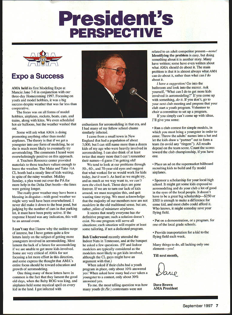 Presidents PERSPECTIVE FV7/ Expo Success AMA held its first Modeling Expo Muncie June 7-8 conjunction three-day Homecoming 1997 Focusing youth model hobbies big success despite weather far less cooperative focus forms model hobbies airplanes rockets boats cars trains along kites scheduled hot-air balloons weather washed out Some will ask what AMA doing promoting anything other model airplanes theory get youngster form modeling much likely eventually try aeromodeling comments heard overwhelmingly positive approach Teachers Resource center provided materials teachers valiant enough brave weather Make Take /2A CL booth steady line kids waiting spite rainy weather Midday Sunday plea went out over PA help Delta Dart booththe lines getting longer really poor weather may have blessing disguisewith good weather might very well have overwhelmed never did make down boat pond judging number cars parking lot must have pretty active response heard indication will annual event cant say know sudden surge interest have gotten quite few letters lately subject getting youngsters involved aeromodeling Most lament lack future aeromodeling unable get kids involved Some very critical AMA focusing lot effort direction some express thought AMAs entire focus should toward education growth aeromodeling thing letters have common fact lament good old days Baby ROG king airplanes held some mystical spell kid land got infected enthusiasm aeromodeling era fellow school chums similarly infected came small town New England population about 3000 can still name dozen kids age heavily involved aeromodeling can also think least twice that cant remember namesI guess Im getting old tend look problems through 50- 60- 70-year-old eyes suggest what worked us would work kids today wont As hard might try much way want cant turn clock back days gone forever turn lack kids around must recognize quit wasting time trying must acknowledge majority members now modelers old traditional sense rather pilots miniature airplanes seems nearly everyone has definitive program such solution doesnt exist No program will serve situations situation will require least some tailoring dedicated program Bob Underwood recently attended Indoor Nats Tennessee banquet asked few questions FF Indoor modelers typically considered modelers likely get kids involved although CL guys might have argument asked clubs youth program place about 10% answered yes asked ever taken youngster contest about 30% answered yes telling question youth JrISr contestants related adult competitor presentnone Identifying problem easy doing something about another story have written some have written about what AMA should about main problem almost always what AMA can about rather what can about have suggestion Go bathroom look mirror Ask yourself What can get kids involved aeromodeling come up something dont go next club meeting propose club start youth program Volunteer chair committee set up program simply cant come up ideas Ill give some Run club contest simple models must bring youngster order enter Throw adults names hat let kids draw partner out form team avoid ringers results depend team score Count scores toward club championship have Place ad supermarket billboard recruiting kids build fly model airplanes Sponsor scholarship local high school might get some kids exposed aeromodeling club lot good eyes local people doesnt have great big scholarship$250 $500 enough make difference some kid clubs could afford knows might someday save flying field Put demonstration program local grade schools Provide transportation kid flying field week things lacking elementyou Till next month DOJLL% Dave Brown AMA President September 1997 7