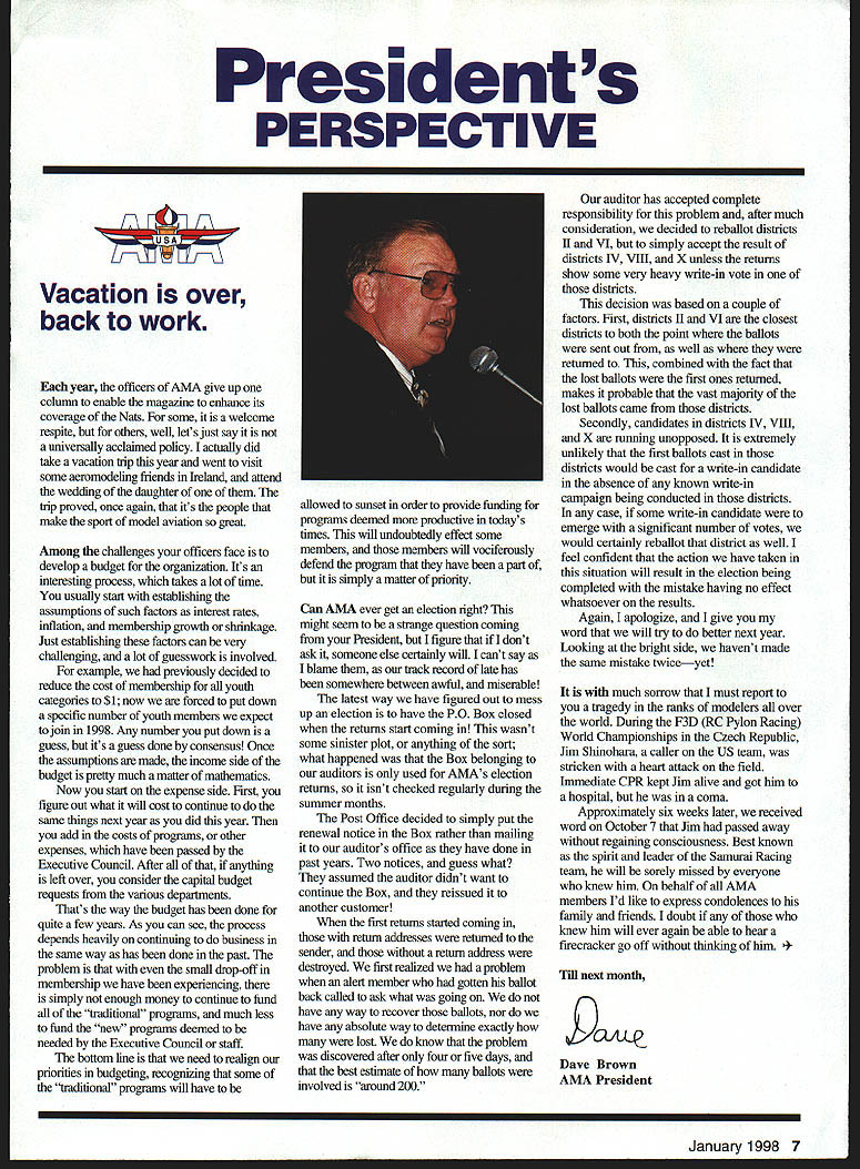 President s PERSPECTIVE Vacation over back work year officers AMA give up column enable magazine enhance its coverage Nats some welcome respite others well lets just say universally acclaimed policy actually did take vacation trip year went visit some aeromodeling friends Ireland attend wedding daughter trip proved once again its people make sport model aviation great Among challenges officers face develop budget organization Its interesting process takes lot time usually start establishing assumptions such factors interest rates inflation membership growth shrinkage Just establishing factors can very challenging lot guesswork involved example previously decided reduce cost membership youth categories $1 now foreed put down specific number youth members expect tojoin 1998 Any number put down guess its guess done consensus Once assumptions made income side budget pretty much matter mathematics Now start expense side First figure out what will cost continue same things next year did year add costs programs other expenses have passed Executive Council After anything left over consider capital budget requests various departments Thats way budget has done quite few years As can see process depends heavily continuing business same way has done past problem small drop-off membership have experiencing simply enough money continue fund traditional programs much less fund new programs deemed needed Executive Council staff bottom line need realign priorities budgeting recognizing some traditional programs will have allowed sunset order provide funding programs deemed productive todays times will undoubtedly effect some members members will vociferously defend program have part simply matter priority Can AMA ever get election right might seem strange question coming President figure WI dont ask someone else certainly will cant say blame track record late has somewhere between awful miserable latest way have figured out mess up election have PO Box closed returns start coming wasnt some sinister plot anything sort what happened Box belonging auditors used AMAs election returns soit isnt checked regularly during summer months Post Office decided simply put renewal notice Box rather mailing auditors office have done past years Two notices guess what assumed auditor didnt want continue Box reissued another customer first returns started coming return addresses returned sender return address destroyed first realized problem alert member gotten ballot back called ask what going have way recover ballots nor have absolute way detennine exactly lost know problem discovered after oaly four five days best estimate ballots involved around 200 auditor has accepted complete responsibility problem after much consideration decided reballot districts Hand VI simply accept result districts IV VIII X unless returns show some very heavy write-in vote districts decision based couple factors First districts Hand VI closest districts both point ballots sent out well returned combined fact lost ballots first ones returned makes probable vast majority lost ballots came districts Secondly candidates districts IV VIII X running unopposed extremely unlikely first ballots cast districts would cast write-in candidate absence known write-in campaign being conducted districts case some write-in candidate emerge significant number votes would certainly reballot district well feel confident action have taken situation will result election being completed mistake having no effect whatsoever results Again apologize give word will try better next year Looking bright side havent made same mistake twiceyet much sorrow must report tragedy ranks modelers over world During F3D RC Pylon Racing World Championships Czech Republic Jim Shinohara caller US team stricken heart attack field Immediate CPR kept Jim alive got him hospital coma Approximately six weeks later received word October 7 Jim passed away regaining consciousness Best known spirit leader Samurai Racing team will sorely missed everyone knew him behalf AMA members Id like express condolences family friends doubt knew him will ever again able hear firecracker go off thinking him next month Dave Brown AMA President January1998 7