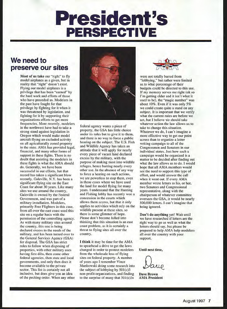 Presidents PERSPECTIVE need preserve sites Most us take right fly model airplanes given reality right doesnt exist Flying model airplanes privilege has earned hard work efforts have preceded us Modelers past have fought privilege fighting threatened legislation fighting supporting organizations efforts get frequencies recently modelers northwest have take strong stand against legislation Oregon would make model aircraft flying excluded activity agriculturally zoned property state AMA has provided legal financial other forms support fights no doubt assisting modelers fights what AMA should Generally have successful efforts record has taken significant blow recently Galeville NY has significant flying site East Coast about 30 years Like sites use around country Galeville owned Federal Government part military installation Modelers primarily Free Flighters case over east coast used site regular basis permission controlling agency As military sites around country being declared excess needs military has turned over General Services Agency GSA disposal GSA has strict rules follow disposing properties other military uses having first dibs come other federal agencies state local governments does become available private sector list certainly inclusive does give idea pecking order other federal agency wants piece property GSA has little choice under its rules give no way force public hearing subject US Fish Wildlife Agency has taken attitude will apply nearly piece vacant land declared excess military purpose making wildlife refuges hence barring nearly other use absence way force hearing such actions powerless stop cases have used land model flying years understand Hunting Fishing lobby has recently won concession courts allows access applies activities rely wildlife present sites some glimmer hope Please dont become lulled thinking situation east coast problem certainly threat flying sites over country think may time AMA spearhead drive get laws changed order protect modelers wholesale loss flying sites federal property number years ago remember Vince Mankowski doing some research subject lobbying 501c3 non-profit organizations finding surprise 501c3s totally barred lobbying rather limited what percentage tbeir budgets could directed use memory serves right Ok Im getting older isnt what used magic number about 10% 5% could create quite stand subject important verify what current rules before act believe should take whatever action law allows us take change situation Whatever cant imagine effective way get point across organize letter writing campaign Congressmen Senators individual states Just such campaign would organized matter decided after finding out what law allows us would hope AMA members would see need support type effort would answer call went out AMA member wrote letters two Senators Congressional representative along chairperson whatever committee oversees GSA would nearly 500000 letters cant imagine being ignored Dont anything yet Wait until have researched letters right way go well what letters should say please prepared help AMA help modelers over country support Until next time 9oitcc Dave Brown AMA President August1997 7