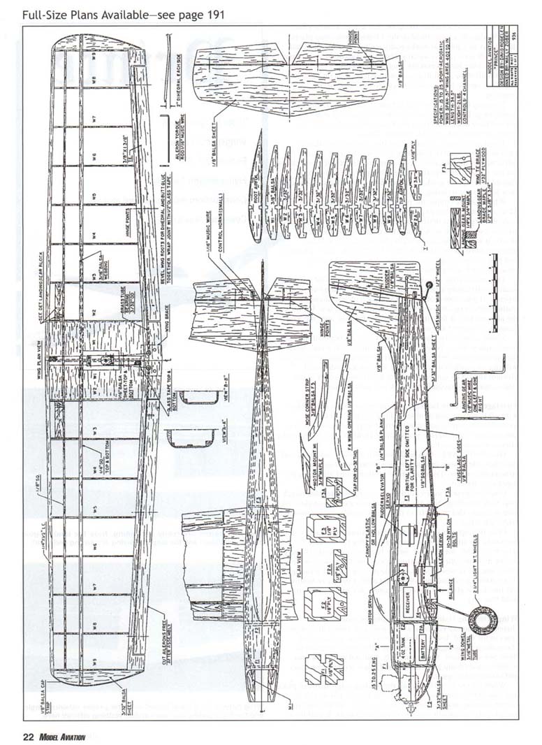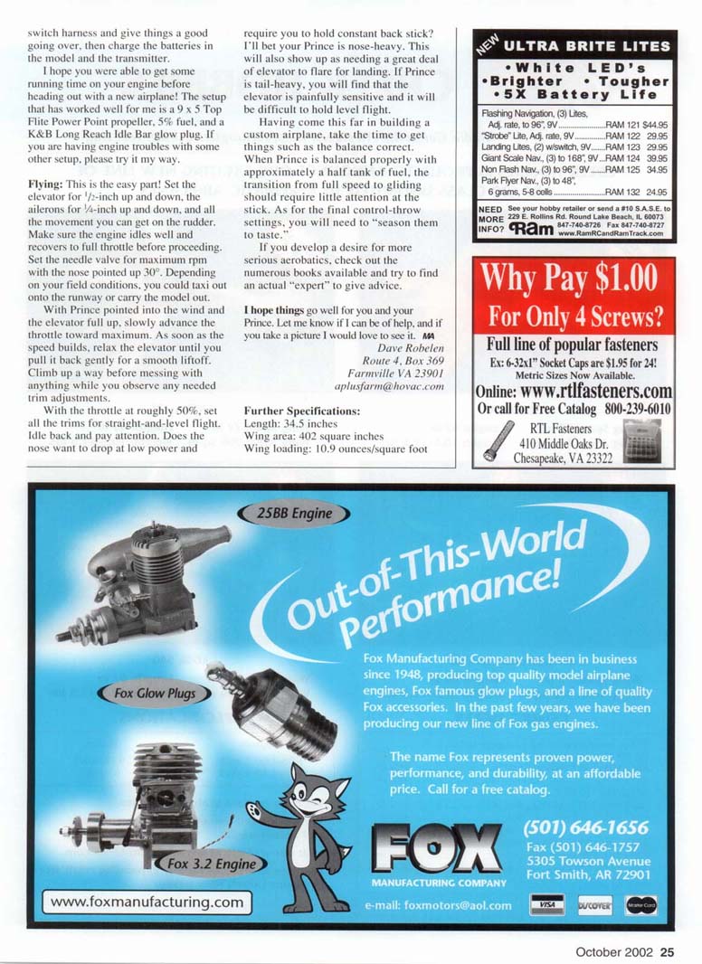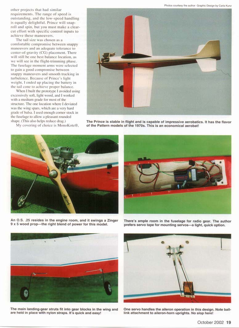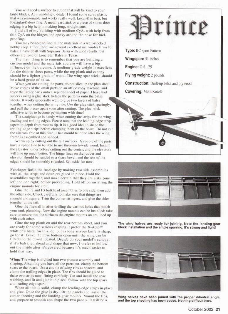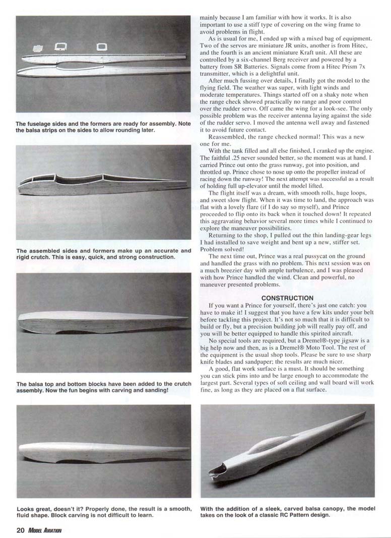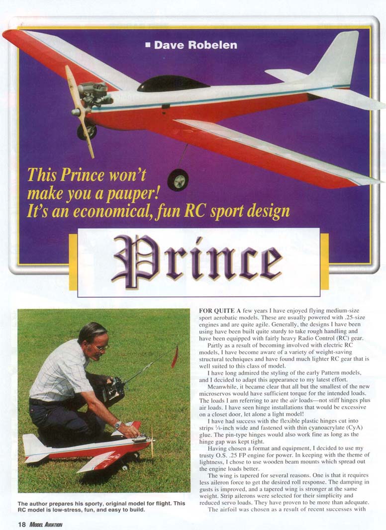 FOR QUITE A few years I have enjoyed flying medium-size sport aerobatic models. These are usually powered with .25-size engines and are quite agile. Generally, the designs 1 have been using have been built quite sturdy to take rough handling and have been equipped with fairly heavy Radio Control (RC) gear. Partly as a result of becoming involved with electric RC models, I have become aware of a variety of weight-saving structural techniques and have found much lighter RC gear that is well suited to this class of model. 1 have long admired the styling of the early Pattern models, and I decided to adapt this appearance to my latest effort. Meanwhile, it became clear that all but the smallest of the new microservos would have sufficient torque for the intended loads. The loads 1 am referring to are the air loads—not stiff hinges plus air loads. I have seen hinge installations that would be excessive on a closet door, let alone a light model! I have had success with the flexible plastic hinges cut into strips '/4-inch wide and fastened with thin cyanoacrylate (CyA) glue. The pin-type hinges would also work fine as long as the hinge gap was kept tight. Having chosen a format and equipment, I decided to use my trusty O.S. .25 FP engine for power. In keeping with the theme of lightness, I chose to use wooden beam mounts which spread out the engine loads better. The wing is tapered for several reasons. One is that it requires less aileron force to get the desired roll response. The damping in gusts is improved, and a tapered wing is stronger at the same weight. Strip ailerons were selected for their simplicity and reduced servo loads. They have proven to be more than adequate. The airfoil was chosen as a result of recent successes with other projects that had similar requirements. The range of speed is outstanding, and the low-speed handling is equally delightful. Prince will snap-roll and spin, but you must make a clear-cut effort with specific control inputs to achieve these maneuvers. The tail size was chosen as a comfortable compromise between snappy maneuvers and an adequate tolerance to center-of-gravity (CG) placement. There will still be one best balance location, as we will see in the flight-trimming phase. The fuselage moment arms were selected to gain a good compromise between snappy maneuvers and smooth tracking in turbulence. Because of Prince's light weight, I ended up placing the battery in the tail cone to achieve proper balance. When I built the prototype I avoided using excessively soft, light wood, and 1 worked with a medium grade for most of the structure. The one locution where 1 deviated was the wing spars, which arc a very hard grade of balsa. 1 used enough corner stock in the fuselage to allow a pleasant rounded shape. (This also helps reduce drag.) My covering of choice is MonoKote®, mainly because I am familiar with how it works. It is also important to use a stiff type of covering on the wing frame to avoid problems in flight. As is usual for me. I ended up with a mixed bag of equipment. Two of the servos are miniature JR units, another is from Hitec, and the fourth is an ancient miniature Kraft unit. All these are controlled by a six-channel Berg receiver and powered by a battery from SR Batteries. Signals come from a Hitec Prism 7x transmitter, which is a delightful unit. After much fussing over details, I finally got the model to the flying field. The weather was super, with light winds and moderate temperatures. Things started off on a shaky note when the range check showed practically no range and poor control over the rudder servo. Off came the wing for a look-see. The only possible problem was the receiver antenna laying against the side of the rudder servo. I moved the antenna well away and fastened it to avoid future contact. Reassembled, the range checked normal! This was a new one for me. With the tank filled and all else finished, I cranked up the engine. The faithful .25 never sounded better, so the moment was at hand. I carried Prince out onto the grass runway, got into position, and throttled up. Prince chose to nose up onto the propeller instead of racing down the runway! The next attempt was successful as a result of holding full up-elevator until the model lifted. The flight itself was a dream, with smooth rolls, huge loops, and sweet slow flight. When it was time to land, the approach was flat with a lovely flare (if I do say so myself), and Prince proceeded to flip onto its back when it touched down! It repeated this aggravating behavior several more times while I continued to explore the maneuver possibilities. Returning to the shop, I pulled out the thin landing-gear legs I had installed to save weight and bent up a new, stiffer set. Problem solved! The next time out. Prince was a real pussycat on the ground and handled the grass with no problem. This next session was on a much breezier day with ample turbulence, and I was pleased with how Prince handled the wind. Clean and powerful, no maneuver presented problems. CONSTRUCTION If you want a Prince for yourself, there's just one catch: you have to make it! I suggest that you have a few kits under your belt before tackling this project. It's not so much that it is difficult to build or fly, but a precision building job will really pay off, and you will be better equipped to handle this spirited aircraft. No special tools are required, but a Dremel®-type jigsaw is a big help now and then, as is a Dremel® Moto Tool. The rest of the equipment is the usual shop tools. Please be sure to use sharp knife blades and sandpaper; the results are much nicer. A good, flat work surface is a must. It should be something you can stick pins into and be large enough to accommodate the largest part. Several types of soft ceiling and wall board will work fine, as long as they are placed on a flat surface. You will need a surface to cut on that will be kind to your knife blades. At a windshield dealer 1 found some