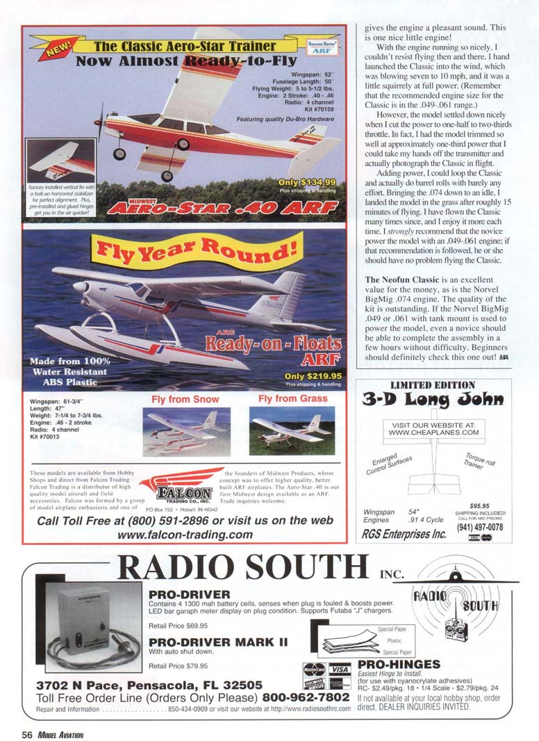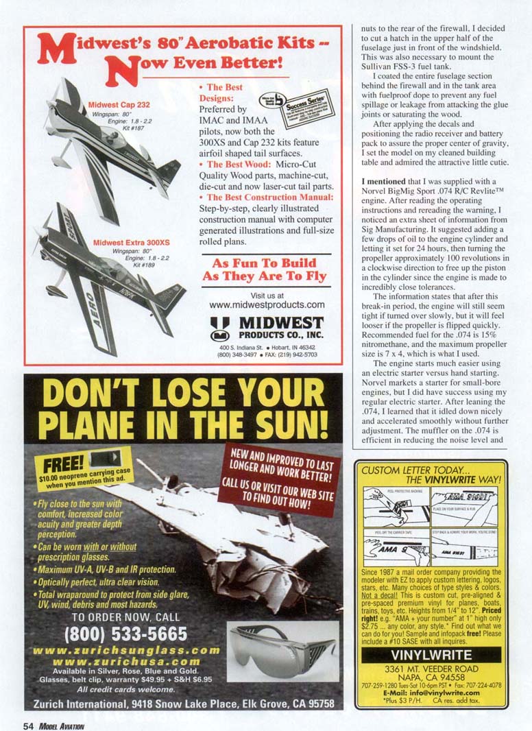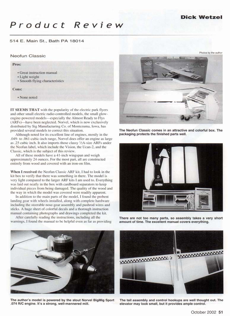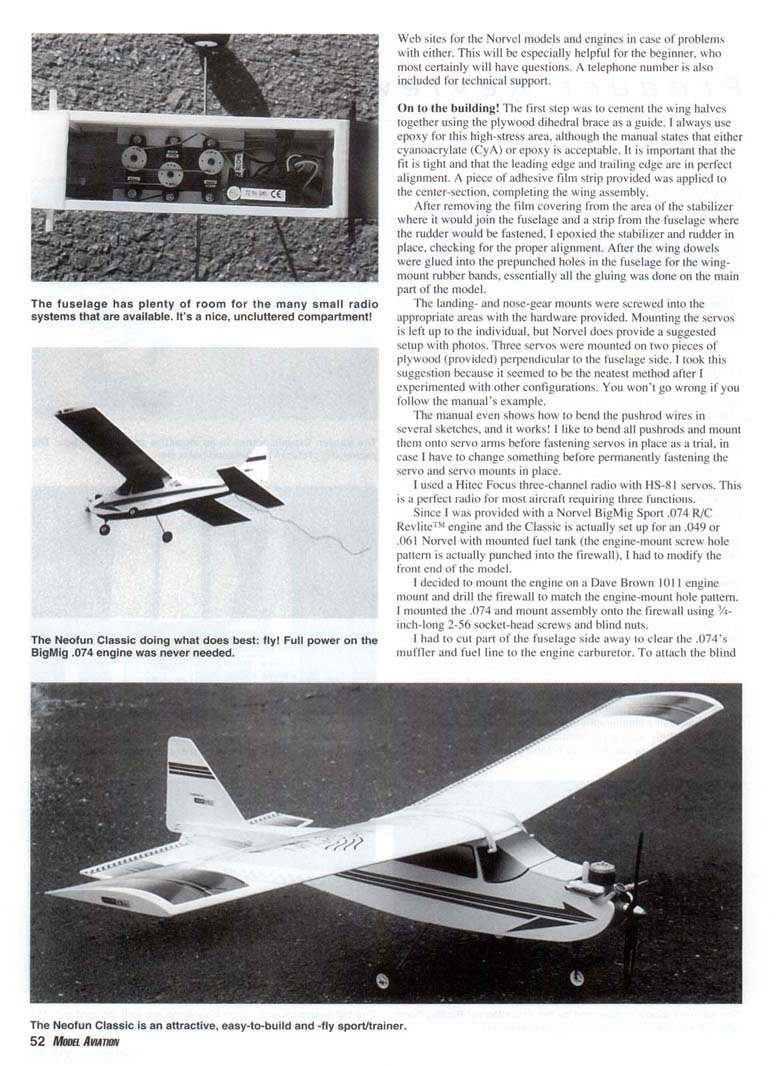 IT SEEMS THAT with the popularity of the electric park flyers and other small electric radio-controlled models, the small glow-engine-powered models—especially the Almost Ready to Flys (ARFs)—have been neglected. Norvel. which is now exclusively distributed by Sig Manufacturing Co. of Montezuma. Iowa, has provided several models to correct this situation. Although noted for its excellent line of engines, mostly in the .049- to .061-cubic-inch range. Norvel does offer an engine as large as .25 cubic inch. It also imports those classy 1/2A-size ARFs under the Neofun label, which include the Vision, the Ucan-2, and the Classic, which is the subject of this review. All of these models have a 41-inch wingspan and weigh approximately 24 ounces. For the most part, all are constructed entirely from wood and covered with an iron-on film. When I received the Neofun Classic ARF kit, I had to look in the kit box to verify that there was something in there. The model is very light compared to the larger ARF kits I am used to. Everything was laid out neatly in the box with cardboard separators to keep individual pieces from being damaged. The quality of the wood and the way in which the model was covered were readily apparent. In addition to the main parts of the model, I found the prebent landing gear with wheels installed, along with complete hardware including the steerable nose-gear assembly and pushrod wires and sticks. A huge sheet of colorful decals and a thorough instruction manual containing photographs and drawings completed the kit. After carefully reading the instructions, including all the warnings, I found the manual to be helpful even as far as providing Web sites for the Norvel models and engines in case of problems 'i. with either. This will be especially helpful for the beginner, who most certainly will have questions. A telephone number is also included for technical support. On to the building! The first step was to cement the wing halves together using the plywood dihedral brace as a guide. I always use epoxy for this high-stress area, although the manual states that either cyanoacrylate (CyA) or epoxy is acceptable. It is important that the fit is tight and that the leading edge and trailing edge are in perfect alignment. A piece of adhesive film strip provided was applied to the center-section, completing the wing assembly. After removing the film covering from the area of the stabilizer where it would join the fuselage and a strip from the fuselage where the rudder would be fastened, 1 epoxied the stabilizer and rudder in place, checking for the proper alignment. After the wing dowels were glued into the prepunched holes in the fuselage for the wing-mount rubber bands, essentially all the gluing was done on the main part of the model. The landing- and nose-gear mounts were screwed into the appropriate areas with the hardware provided. Mounting the servos is left up to the individual, but Norvel does provide a suggested setup with photos. Three servos were mounted on two pieces of plywood (provided) perpendicular to the fuselage side. I took this suggestion because it seemed to be the neatest method after I experimented with other configurations. You won't go wrong if you follow the manual's example. The manual even shows how to bend the pushrod wires in several sketches, and it works! I like to bend all pushrods and mount them onto servo arms before fastening servos in place as a trial, in case I have to change something before permanently fastening the servo and servo mounts in place. I used a Hitec Focus three-channel radio with HS-81 servos. This is a perfect radio for most aircraft requiring three functions. Since I was provided with a Norvel BigMig Sport .074 R/C Revlite™ engine and the Classic is actually set up for an .049 or .061 Norvel with mounted fuel tank (the engine-mount screw hole pattern is actually punched into the firewall), I had to modify the front end of the model. I decided to mount the engine on a Dave Brown 1011 engine mount and drill the firewall to match the engine-mount hole pattern. I mounted the .074 and mount assembly onto the firewall using -'/»-inch-long 2-56 socket-head screws and blind nuts. 1 had to cut part of the fuselage side away to clear the .O74's muffler and fuel line to the engine carburetor. To attach the blind nuts to the rear of the firewall, I decided to cut a hatch in the upper half of the fuselage just in front of the windshield. This was also necessary to mount the Sullivan FSS-3 fuel tank. I coated the entire fuselage section behind the firewall and in the tank area with fuelproof dope to prevent any fuel spillage or leakage from attacking the glue joints or saturating the wood. After applying the decals and positioning the radio receiver and battery pack to assure the proper center of gravity, I set the model on my cleaned building table and admired the attractive little cutie. I mentioned that I was supplied with a Norvel BigMig Sport .074 R/C Revlite™ engine. After reading the operating instructions and rereading the warning, I noticed an extra sheet of information from Sig Manufacturing. It suggested adding a few drops of oil to the engine cylinder and letting it set for 24 hours, then turning the propeller approximately 100 revolutions in a clockwise direction to free up the piston in the cylinder since the engine is made to incredibly close tolerances. The information states that after this break-in period, the engine will still seem tight if turned over slowly, but it will feel looser if the propeller is flipped quickly. Recommended fuel for the .074 is 15% nitromethane, and the maximum propeller size is 7 x 4. which is what I used. The engine starts much easier using an electric starter versus hand starting. Norvel markets a starter for small-bore engines, but I did have success using my regular electric starter. After leaning the .074. I learned that it idled down nicely and accelerated smoothly without furthe