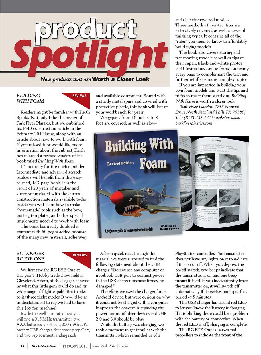 14Model Aviation FEBRUARY 2013www.ModelAviation.comBUILDING WITH FOAM Readers might be familiar with Keith Sparks. Not only is he the owner of Park Flyer Plastics, but we published his P-40 construction article in the February 2012 issue, along with an article about how to work with foam. If you missed it or would like more information about the subject, Keith has released a revised version of his book titled Building With Foam. It’s not only for the novice builder. Intermediate and advanced scratch builders will benefi t from this easy-to-read, 133-page book. It is the result of 20 years of mistakes and successes updated with the current construction materials available today. Inside you will learn how to make “homemade” tools such as the bow, cutting templates, and other special implements needed to work with foam. The book has nearly doubled in content with 60 pages added because of the many new materials, adhesives, and available equipment. Bound with a sturdy metal spine and covered with protective plastic, this book will last on your workbench for years. Wingspans from 10 inches to 8 feet are covered, as well as glow- RC LOGGER RC EYE ONE We fi rst saw the RC EYE One at this year’s iHobby trade show held in Cleveland. Adam, at RC Logger, showed us what this little gem could do and its wide range of fl ight capabilities thanks to its three fl ight modes. It would be an understatement to say we had to have this $69 fun machine! Inside the well-illustrated box you will fi nd a 915 MHz transmitter, two AAA batteries, a 7.4-volt, 350-mAh LiPo battery, USB charger, four spare propellers, and two replacement landing skids. After a quick read through the manual, we were surprised to fi nd the following statement about the USB charger: “Do not use any computer or notebook USB port to connect power to the USB charger because it may be damaged.” Therefore, we used the charger for an Android device, but were curious on why it could not be charged with a computer. It appears the concern is regarding the power output of older devices and USB 2.0 and 3.0 should be okay. While the battery was charging, we took a moment to get familiar with the transmitter, which reminded us of a PlayStation controller. The transmitter does not have any lights on it to indicate if it is on or off. When you depress the on/off switch, two beeps indicate that the transmitter is on and one beep means it is off. If you inadvertently leave the transmitter on, it will switch off automatically if it receives no input for a period of 5 minutes. The USB charger has a solid red LED to let you know the battery is charging. If it is blinking there could be a problem with the battery or connection. When the red LED is off, charging is complete. The RC EYE One uses two red propellers to indicate the front of the REVIEWSand electric-powered models. Three methods of construction are extensively covered, as well as several fi nishing types. It contains all of the “rules” you need to know to affordably build fl ying models. The book also covers storing and transporting models as well as tips on their repair. Black-and-white photos and illustrations can be found on nearly every page to complement the text and further reinforce more complex topics. If you are interested in building your own foam models and want the tips and tricks to make them stand out, Building With Foam is worth a closer look. Park Flyer Plastics: 7755 Noreast Drive North Richland Hills TX 76180; Tel.: (817) 233-1215; website: www. park yerplastics.comREVIEWS014