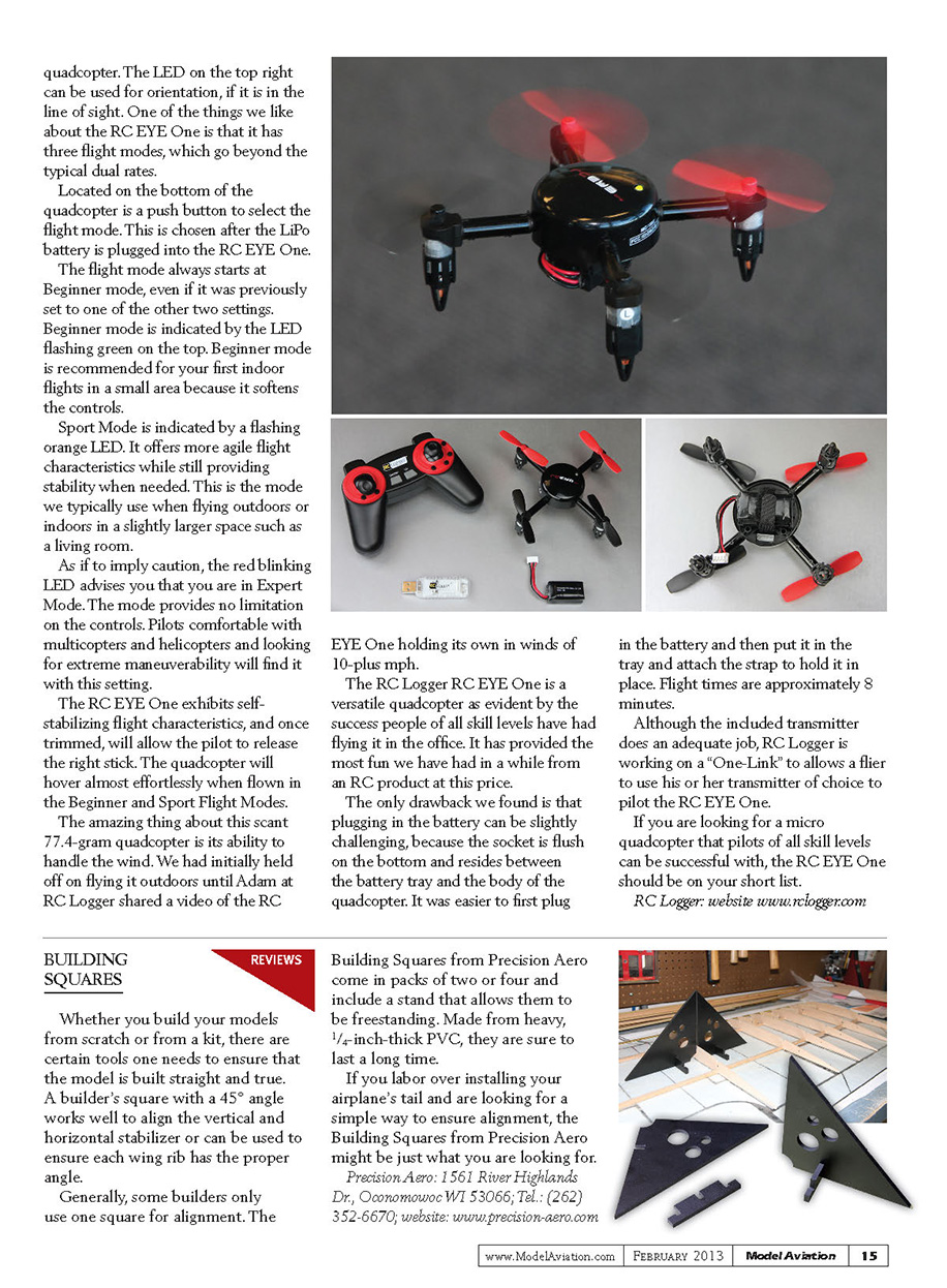 15Model Aviation FEBRUARY 2013www.ModelAviation.comBUILDING SQUARES Whether you build your models from scratch or from a kit, there are certain tools one needs to ensure that the model is built straight and true. A builder’s square with a 45° angle works well to align the vertical and horizontal stabilizer or can be used to ensure each wing rib has the proper angle. Generally, some builders only use one square for alignment. The Building Squares from Precision Aero come in packs of two or four and include a stand that allows them to be freestanding. Made from heavy, 1/4-inch-thick PVC, they are sure to last a long time. If you labor over installing your airplane’s tail and are looking for a simple way to ensure alignment, the Building Squares from Precision Aero might be just what you are looking for. Precision Aero: 1561 River Highlands Dr., Oconomowoc WI 53066; Tel.: (262) 352-6670; website: www.precision-aero.comREVIEWSquadcopter. The LED on the top right can be used for orientation, if it is in the line of sight. One of the things we like about the RC EYE One is that it has three fl ight modes, which go beyond the typical dual rates. Located on the bottom of the quadcopter is a push button to select the fl ight mode. This is chosen after the LiPo battery is plugged into the RC EYE One. The fl ight mode always starts at Beginner mode, even if it was previously set to one of the other two settings. Beginner mode is indicated by the LED fl ashing green on the top. Beginner mode is recommended for your fi rst indoor fl ights in a small area because it softens the controls. Sport Mode is indicated by a fl ashing orange LED. It offers more agile fl ight characteristics while still providing stability when needed. This is the mode we typically use when fl ying outdoors or indoors in a slightly larger space such as a living room. As if to imply caution, the red blinking LED advises you that you are in Expert Mode. The mode provides no limitation on the controls. Pilots comfortable with multicopters and helicopters and looking for extreme maneuverability will fi nd it with this setting. The RC EYE One exhibits self-stabilizing fl ight characteristics, and once trimmed, will allow the pilot to release the right stick. The quadcopter will hover almost effortlessly when fl own in the Beginner and Sport Flight Modes. The amazing thing about this scant 77.4-gram quadcopter is its ability to handle the wind. We had initially held off on fl ying it outdoors until Adam at RC Logger shared a video of the RC EYE One holding its own in winds of 10-plus mph. The RC Logger RC EYE One is a versatile quadcopter as evident by the success people of all skill levels have had fl ying it in the offi ce. It has provided the most fun we have had in a while from an RC product at this price. The only drawback we found is that plugging in the battery can be slightly challenging, because the socket is fl ush on the bottom and resides between the battery tray and the body of the quadcopter. It was easier to fi rst plug in the battery and then put it in the tray and attach the strap to hold it in place. Flight times are approximately 8 minutes. Although the included transmitter does an adequate job, RC Logger is working on a “One-Link” to allows a fl ier to use his or her transmitter of choice to pilot the RC EYE One. If you are looking for a micro quadcopter that pilots of all skill levels can be successful with, the RC EYE One should be on your short list. RC Logger: website www.rclogger.com014
