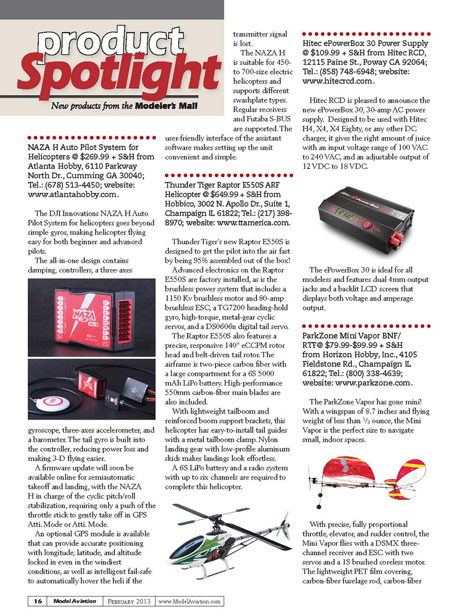 NAZA H Auto Pilot System for Helicopters @ $269.99 + S&H from Atlanta Hobby, 6110 Parkway North Dr., Cumming GA 30040; Tel.: (678) 513-4450; website: www.atlantahobby.com. The DJI Innovations NAZA H Auto Pilot System for helicopters goes beyond simple gyros, making helicopter fl ying easy for both beginner and advanced pilots. The all-in-one design contains damping, controllers, a three-axes gyroscope, three-axes accelerometer, and a barometer. The tail gyro is built into the controller, reducing power loss and making 3-D fl ying easier. A fi rmware update will soon be available online for semiautomatic takeoff and landing, with the NAZA H in charge of the cyclic pitch/roll stabilization, requiring only a push of the throttle stick to gently take off in GPS Atti. Mode or Atti. Mode. An optional GPS module is available that can provide accurate positioning with longitude, latitude, and altitude locked in even in the windiest conditions, as well as intelligent fail-safe to automatically hover the heli if the transmitter signal is lost. The NAZA H is suitable for 450- to 700-size electric helicopters and supports different swashplate types. Regular receivers and Futaba S-BUS are supported. The user-friendly interface of the assistant software makes setting up the unit convenient and simple.Thunder Tiger Raptor E550S ARF Helicopter @ $649.99 + S&H from Hobbico, 3002 N. Apollo Dr., Suite 1, Champaign IL 61822; Tel.: (217) 398-8970; website: www.ttamerica.com. Thunder Tiger’s new Raptor E550S is designed to get the pilot into the air fast by being 95% assembled out of the box! Advanced electronics on the Raptor E550S are factory installed, as is the brushless power system that includes a 1150 Kv brushless motor and 80-amp brushless ESC, a TG7200 heading-hold gyro, high-torque, metal-gear cyclic servos, and a DS0606n digital tail servo. The Raptor E550S also features a precise, responsive 140° eCCPM rotor head and belt-driven tail rotor. The airframe is two-piece carbon fi ber with a large compartment for a 6S 5000 mAh LiPo battery. High-performance 550mm carbon-fi ber main blades are also included. With lightweight tailboom and reinforced boom support brackets, this helicopter has easy-to-install tail guides with a metal tailboom clamp. Nylon landing gear with low-profi le aluminum skids makes landings look effortless. A 6S LiPo battery and a radio system with up to six channels are required to complete this helicopter.Hitec ePowerBox 30 Power Supply @ $109.99 + S&H from Hitec RCD, 12115 Paine St., Poway CA 92064; Tel.: (858) 748-6948; website: www.hitecrcd.com. Hitec RCD is pleased to announce the new ePowerBox 30, 30-amp AC power supply. Designed to be used with Hitec H4, X4, X4 Eighty, or any other DC charger, it gives the right amount of juice with an input voltage range of 100 VAC to 240 VAC, and an adjustable output of 12 VDC to 18 VDC. The ePowerBox 30 is ideal for all modelers and features dual 4mm output jacks and a backlit LCD screen that displays both voltage and amperage output.ParkZone Mini Vapor BNF/RTF@ $79.99-$99.99 + S&H from Horizon Hobby, Inc., 4105 Fieldstone Rd., Champaign IL 61822; Tel.: (800) 338-4639; website: www.parkzone.com. The ParkZone Vapor has gone mini! With a wingspan of 8.7 inches and fl ying weight of less than 1/3 ounce, the Mini Vapor is the perfect size to navigate small, indoor spaces. With precise, fully proportional throttle, elevator, and rudder control, the Mini Vapor fl ies with a DSMX three-channel receiver and ESC with two servos and a 1S brushed coreless motor. The lightweight PET fi lm covering, carbon-fi ber fuselage rod, carbon-fi ber 16Model Aviation FEBRUARY 2013www.ModelAviation.com016