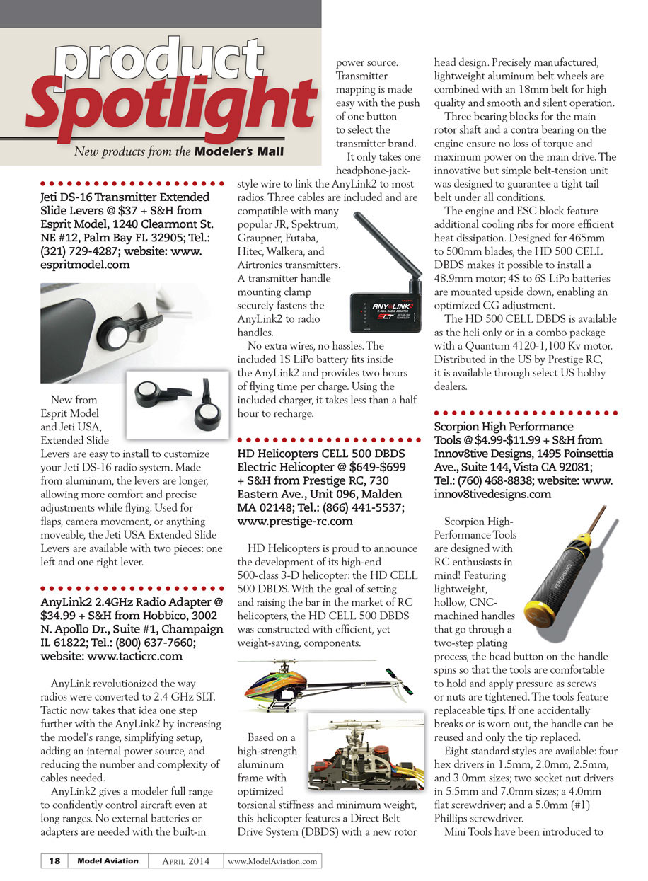Jeti DS-16 Transmitter Extended Slide Levers @ $37 + S&H from Esprit Model, 1240 Clearmont St. NE #12, Palm Bay FL 32905; Tel.: (321) 729-4287; website: www.espritmodel.com
