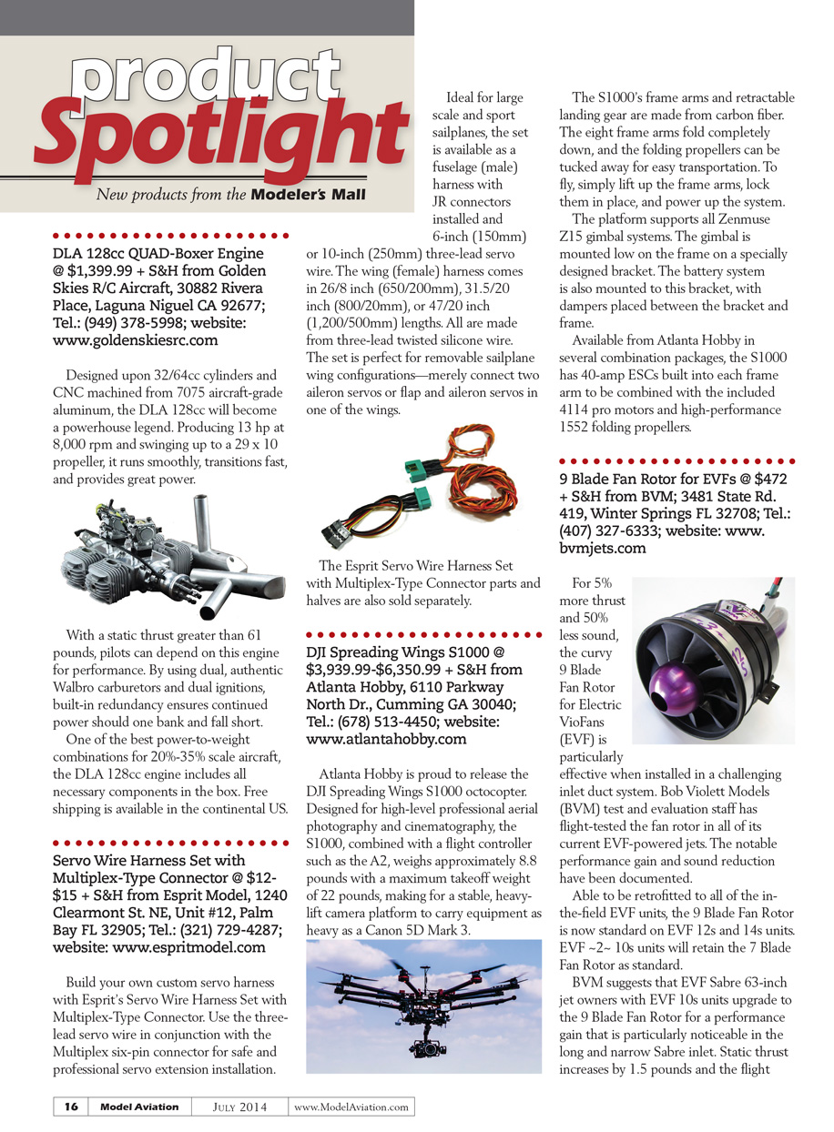 DLA 128cc QUAD-Boxer Engine @ $1,399.99 + S&H from Golden Skies R/C Aircraft, 30882 Rivera Place, Laguna Niguel CA 92677; Tel.: (949) 378-5998; website: www.goldenskiesrc.com