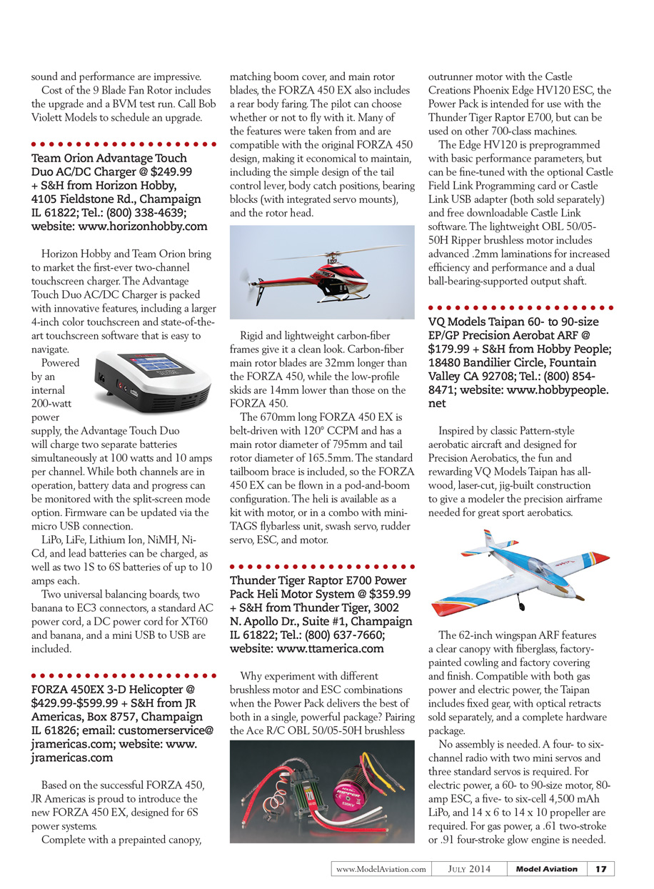Thunder Tiger Raptor E700 Power Pack Heli Motor System @ $359.99 + S&H from Thunder Tiger, 3002 N. Apollo Dr., Suite #1, Champaign IL 61822; Tel.: (800) 637-7660; website: www.ttamerica.com