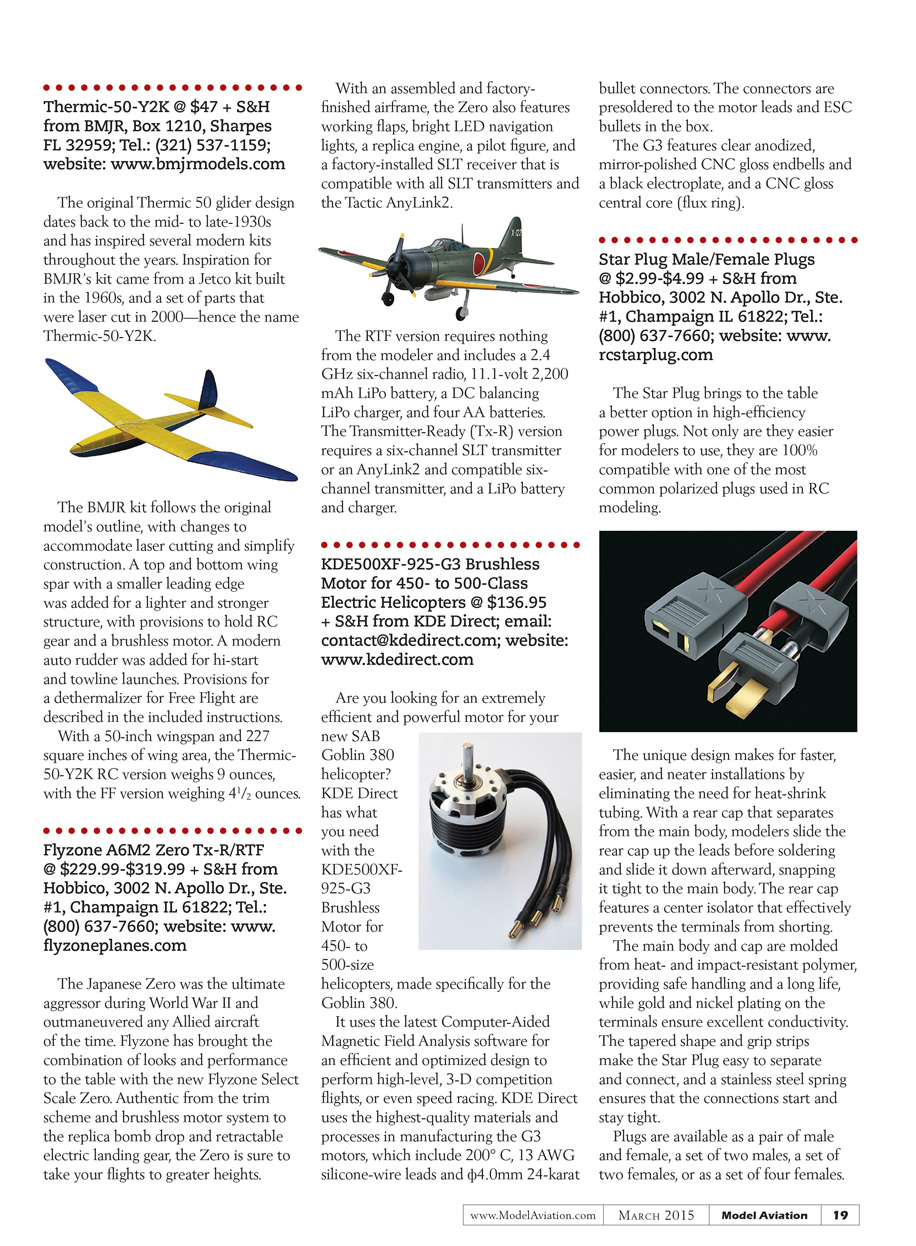 Aviation Books, Materials, and Gifts from Aircraft Spruce & Specialty Co., Tel.: (877) 477-7823; email: info@aircraftspruce.com; website: www.aircraftspruce.com Aircraft Spruce & Specialty Co. is a leading supplier of aircraft parts, avionics, and pilot supplies, including tools, covering supplies, and wood. Aircraft Spruce & Specialty Co. is happy to announce the acquisition of Seattle-based Aviation Book Company—a distributor of aviation books, training materials, and aviation gifts for more than 30 years. Jim Irwin, president of Aircraft Spruce & Specialty Co., stated in a press release, “Aviation Book Company has been a well-respected supplier to the general aviation community for decades, and we are pleased to have the opportunity to continue to offer their products.” Aviation Spruce & Specialty Co. was founded in 1965 by Bob and Flo Irwin. Originally selling only aircraft-grade spruce lumber for renovation and restoration, the company quickly added more products. Aviation Spruce now employs more than 150, with warehouses in California, Georgia, and Canada that provide same-day shipping to customers worldwide. Request your complementary catalog by visiting the Aircraft Spruce & Specialty Co. website. Thermic-50-Y2K @ $47 + S&H from BMJR, Box 1210, Sharpes FL 32959; Tel.: (321) 537-1159; website: www.bmjrmodels.com The original Thermic 50 glider design dates back to the mid- to late-1930s and has inspired several modern kits throughout the years. Inspiration for BMJR’s kit came from a Jetco kit built in the 1960s, and a set of parts that were laser cut in 2000—hence the name Thermic-50-Y2K. The BMJR kit follows the original model’s outline, with changes to accommodate laser cutting and simplify construction. A top and bottom wing spar with a smaller leading edge was added for a lighter and stronger structure, with provisions to hold RC gear and a brushless motor. A modern auto rudder was added for hi-start and towline launches. Provisions for a dethermalizer for Free Flight (FF) are described in the included instructions. With a 50-inch wingspan and 227 square inches of wing area, the Thermic-50-Y2K RC version weighs 9 ounces, with the FF version weighing 41/2 ounces. Lectron Pro 11.1-volt 2,200 mAh 20C LiPo Batteries @ $19.99 + S&H from Common Sense RC, Box 3546, Chatsworth CA 91313; Tel.: (866) 405-8811; website: www.commonsenserc.com Common Sense RC’s 3S 2,200 mAh 20C LiPo batteries are now an even better value because the price has been cut by more than 30%! Perfect for many types of models—including park flyers, 400- to 450-size helicopters, multirotors, and more—the Lectron Pro LiPo batteries are tested in-house to ensure the best quality and accurate readings. The 3S 2,200 mAh 20C LiPos are available with Deans-type T-plug or EC3 connectors and weigh 178 grams. Flyzone A6M2 Zero Tx-R/RTF @ $229.99-$319.99 + S&H from Hobbico, 3002 N. Apollo Dr., Ste. #1, Champaign IL 61822; Tel.: (800) 637-7660; website: www.flyzoneplanes.com The Japanese Zero was the ultimate aggressor during World War II and outmaneuvered any Allied aircraft of the time. Flyzone has brought the combination of looks and performance to the table with the new Flyzone Select Scale Zero. Authentic from the trim scheme and brushless motor system to the replica bomb drop and retractable electric landing gear, the Zero is sure to take your flights to greater heights. With an assembled and factory-finished airframe, the Zero also features working flaps, bright LED navigation lights, a replica engine, a pilot figure, and a factory-installed SLT receiver that is compatible with all SLT transmitters and the Tactic AnyLink2. The RTF version requires nothing from the modeler and includes a 2.4 GHz six-channel radio, 11.1-volt 2,200 mAh LiPo battery, a DC balancing LiPo charger, and four AA batteries. The Transmitter-Ready (Tx-R) version requires a six-channel SLT transmitter or an AnyLink2 and compatible six-channel transmitter, and a LiPo battery and charger. KDE500XF-925-G3 Brushless Motor for 450 to 500-Class Electric Helicopters @ $136.95 + S&H from KDE Direct; email: contact@kdedirect.com; website: www.kdedirect.com Are you looking for an extremely efficient and powerful motor for your new SAB Goblin 380 helicopter? KDE Direct has what you need with the KDE500XF-925-G3 Brushless Motor for 450 to 500-size helicopters, made specifically for the Goblin 380. Using the latest Computer-Aided Magnetic Field Analysis software for an efficient and optimized design to perform high-level, 3-D competition flights, or even speed race using the highest-quality materials and processes in manufacturing, G3 motors include 200° C, 13 AWG silicone-wire leads, and ф4.0mm 24-karet bullet connectors. The connectors are presoldered to the motor leads and ESC bullets in the box. The G3 features clear anodized, mirror-polished CNC gloss endbells and a black electroplate, and CNC gloss central core (flux ring). Ninja 400MR Aerobatic 3D Quadcopter Kit or Kit Combo @ $419.99-$629.99 + S&H from JR Americas, Box 8757, Champaign IL 61826; Tel.: (217) 352-7959; website: www.jramericas.com JR is proud to introduce its contribution to the multirotor market, the Ninja 400MR—a high-quality, aerobatic, 3-D quadcopter that is guaranteed to turn heads. Featuring four independent brushless outrunner motors with fixed-pitch propellers that are designed to reverse direction quickly, the Ninja 400MR is agile with a wide performance envelope, yet also lightweight and simple. The custom-tuned, six-axis gyro stabilization flight control system plugs directly into an XBus-compatible receiver for easy setup. The carbon-fiber main frame and four main aluminum arms have a low parts count. The polycarbonate canopy protects the top and underside and conceals the radio equipment and battery by attaching to the chassis with body pins and clips. The Ninja 400MR 3D quadcopter kit requires a JR DMSS transmitter with an RG731BX receiver (JRP006191 or si