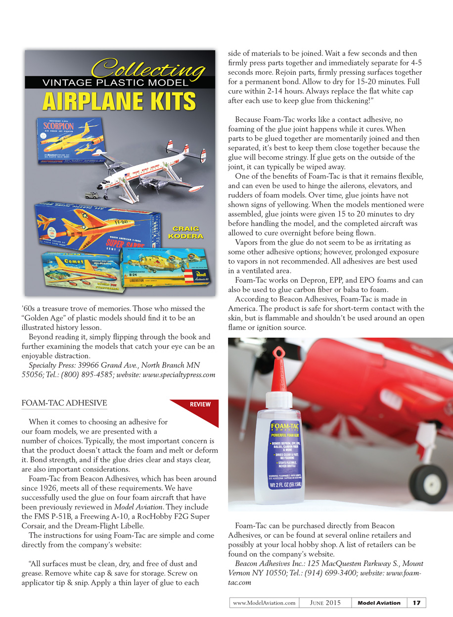 Foam-Tac from Beacon Adhesives, which has been around since 1926, meets all the above mentioned requirements. We have successfully used the glue on four different foam aircraft that have been previously reviewed in MA. They include the FMS P-51B, Freewing A-10, RocHobby F2G Super Corsair, and Dream-Flight Libelle.