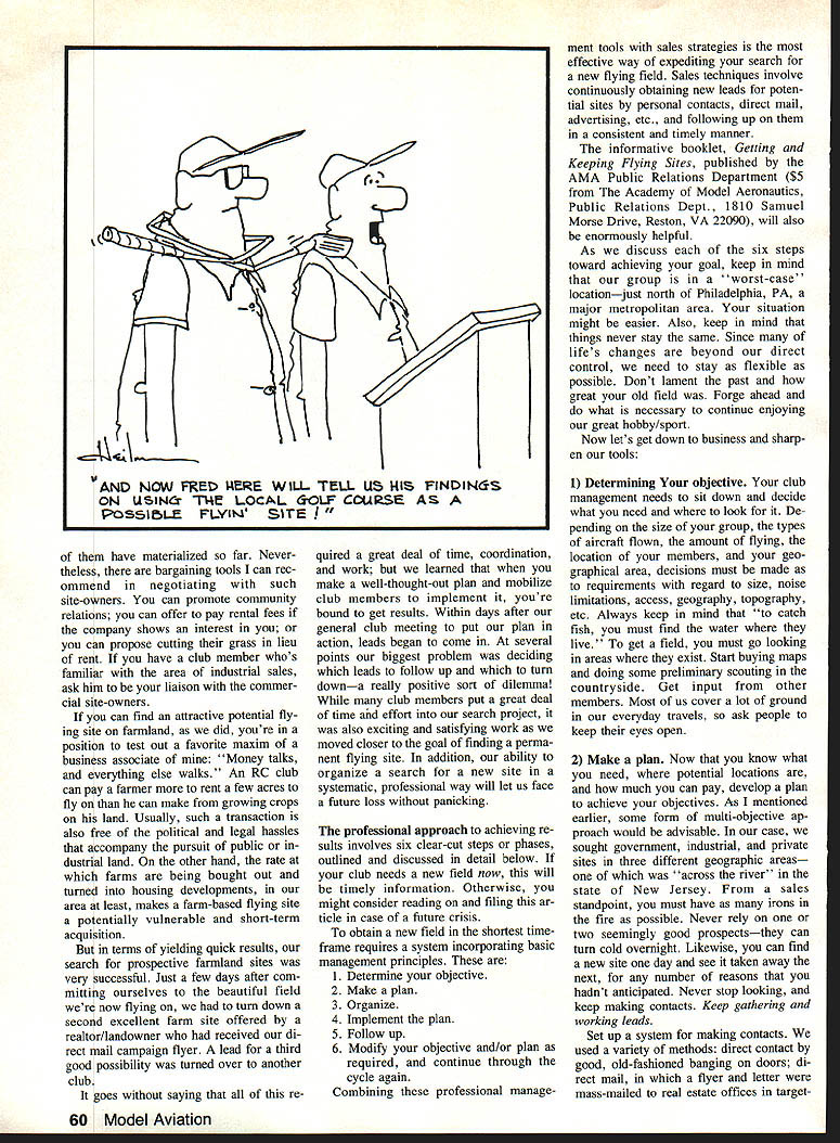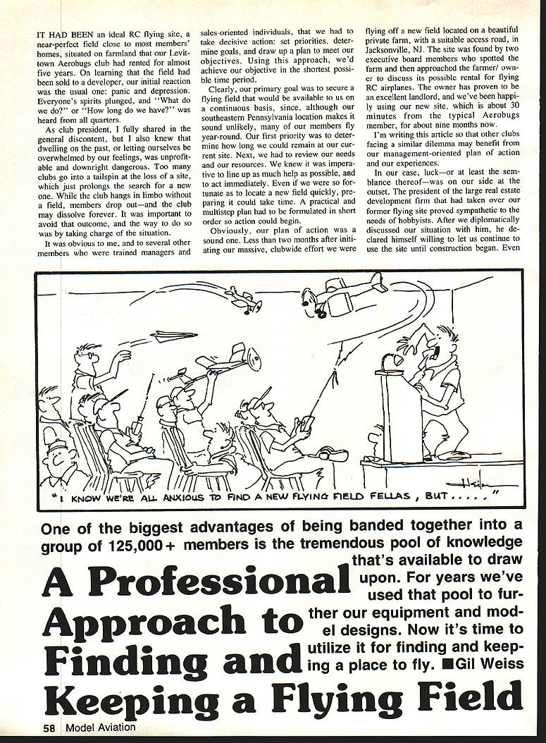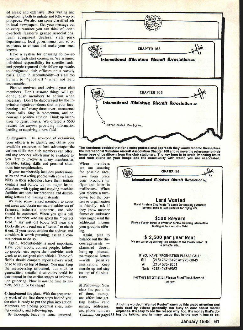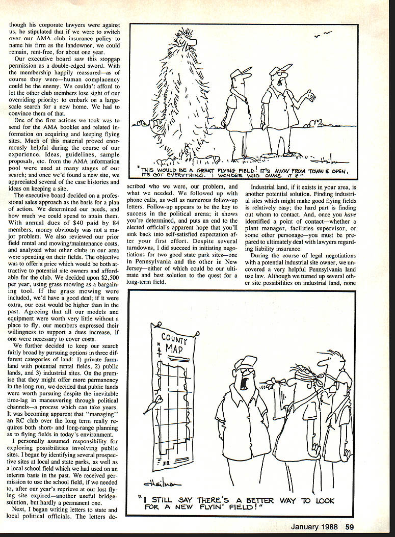 IT HAD BEEN ideal RC flying site near-perfect field close members homes situated farmland Levit town Aerobugs club rented almost five years learning field sold developer initial reaction usual panic depression Everyones spirits plunged What long have heard quarters As club president fully shared general discontent also knew dwelling past letting ourselves overwhelmed feelings unprofit able downright dangerous Too clubs go tailspin loss site just prolongs search new club hangs limbo field members drop outand club may dissolve forever important avoid outcome way taking charge situation obvious to several other members trained managers sales-oriented individuals take decisive action set priorities deter goals draw up plan meet objectives Using approach wed achieve objective shortest possi ble time period Clearly primary goal secure flying field would available us continuous basis since although southeastern Pennsylvania location makes sound unlikely members fly year-round first priority deter long could remain cur rent site Next review needs resources knew impera tive line up much help possible act immediately tunate locate new field quickly pre paring could take time practical multistep plan formulated short order action could begin Obviously plan action sound Less two months after initi ating massive clubwide effort flying off new field located beautiful private fann suitable access road Jacksonville NJ site found two executive board members spotted farm approached farmer own er discuss its possible rental flying RC airplanes owner has proven excellent landlord weve happi ly using new site about 30 minutes typical Aerobugs member about nine months now Im writing article other clubs facing similar dilemma may benefit management-oriented plan action experiences case luckor least sem blance thereofwas side outset president large real estate development firm taken over former flying site proved sympathetic needs hobbyists After diplomatically discussed situation him de clared himself willing let us continue use site until construction began biggest advantages being banded together group 125000 ers tremendous pool knowledge thats available draw Professional upon years weve pool furApproach ther equipment mod el designs Now its time 3 utilize finding keep ng anu ing place fly EGil Weiss Keeping Flying Field 58 Model Aviation 1 KNQW WER ALL ANXIOUS 1 FNO NEW FLYINCk F1LD VELLAS BLAT. though corporate lawyers against us stipulated switch over AMA club insurance policy name firm landowner could remain rent-free about year executive board saw stopgap permission double-edged sword membership happily reassuredas course werehuman complacency could enemy couldnt afford let other club members lose sight overriding priority embark largescale search new home convince first actions took send AMA booklet related formation acquiring keeping flying sites Much material proved enor mously helpful during course experience Ideas guidelines sample proposals etc AMA information pool used stages search once wed found new site appreciated several case histories ideas keeping site executive board decided profes sional sales approach basis plan action determined needs much could spend attain annual dues $40 paid 84 members money obviously ma jor problem also reviewed prior field rental mowing/maintenance costs analyzed what other clubs area spending fields objective offer price would both tractive potential site owners afford able club decided upon $2500 per year using grass mowing bargain ing tool grass mowing included wed have good deal extra cost would higher past Agreeing models equipment worth very little place fly members expressed willingness support dues increase necessary cover costs further decided keep search fairly broad pursuing options three dif ferent categories land 1 private farm land potential rental fields 2 public lands 3 industrial sites prem ise might offer permanency long run decided public lands worth pursuing despite inevitable time-lag maneuvering through political channelsa process can take years becoming apparent managing RC club over long term really re quires both short- long-range planning flying fields todays environment personally assumed responsibility exploring possibilities involving public sites began identifing several prospec tive sites local state parks well local school field used interim basis past received per mission use school field needed after years reprieve lost fly ing site expiredanother useful bridgesolution hardly permanent Next began writing letters state local political officials letters de scribed problem what needed followed up phone calls well numerous follow-up letters Follow-up appears key success political arena shows youre determined puts end elected officials apparent hope youll sink back self-satisfied expectation af ter first effort Despite several turndowns did succeed initiating nego tiations two good state park sitesone Pennsylvania other New Jerseyeither could ulti mate best solution quest long-term field Industrial land exists area another potential solution Finding industri al sites might make good flying fields relatively easy hard part finding out contact once have identified point contactwhether plant manager facilities supervisor some other personageyou must pre pared ultimately deal lawyers regard ing liability insurance During course legal negotiations potential industrial site owner un covered very helpful Pennsylvania land use law Although turned up several oth er site possibilities industrial land January 1988 59 7 /1114 II t %\TillS WOL4LL ee cItIA1 PLYING PIULb ITS AWA FM bWN $ OPEN IT Qor VEY1-MINC- WONZS WHO OWNS IT ~cj UI 1 - 1 I 5TILL SAY THERE ER WAY 10 LOOK A NEW FLYIN FIELt have materialized far Never theless bargaining tools can rec ommend negotiating such site-owners can promote community relations can offer pay rental fees company shows interest you can propose cutting grass lieu rent have club member whos familiar area industria