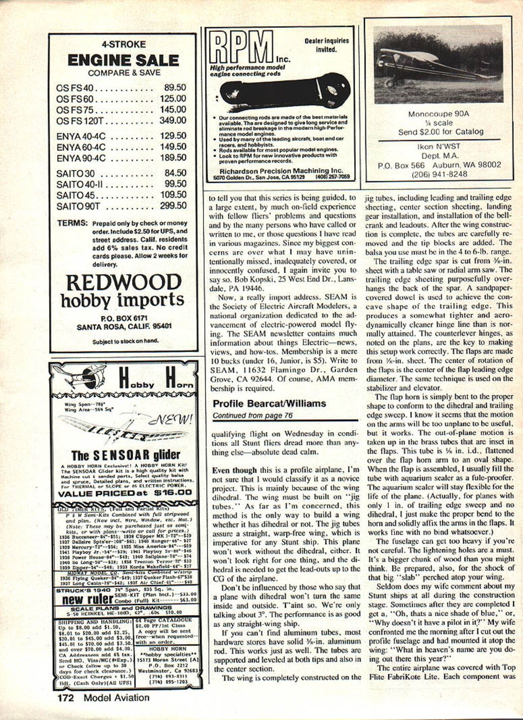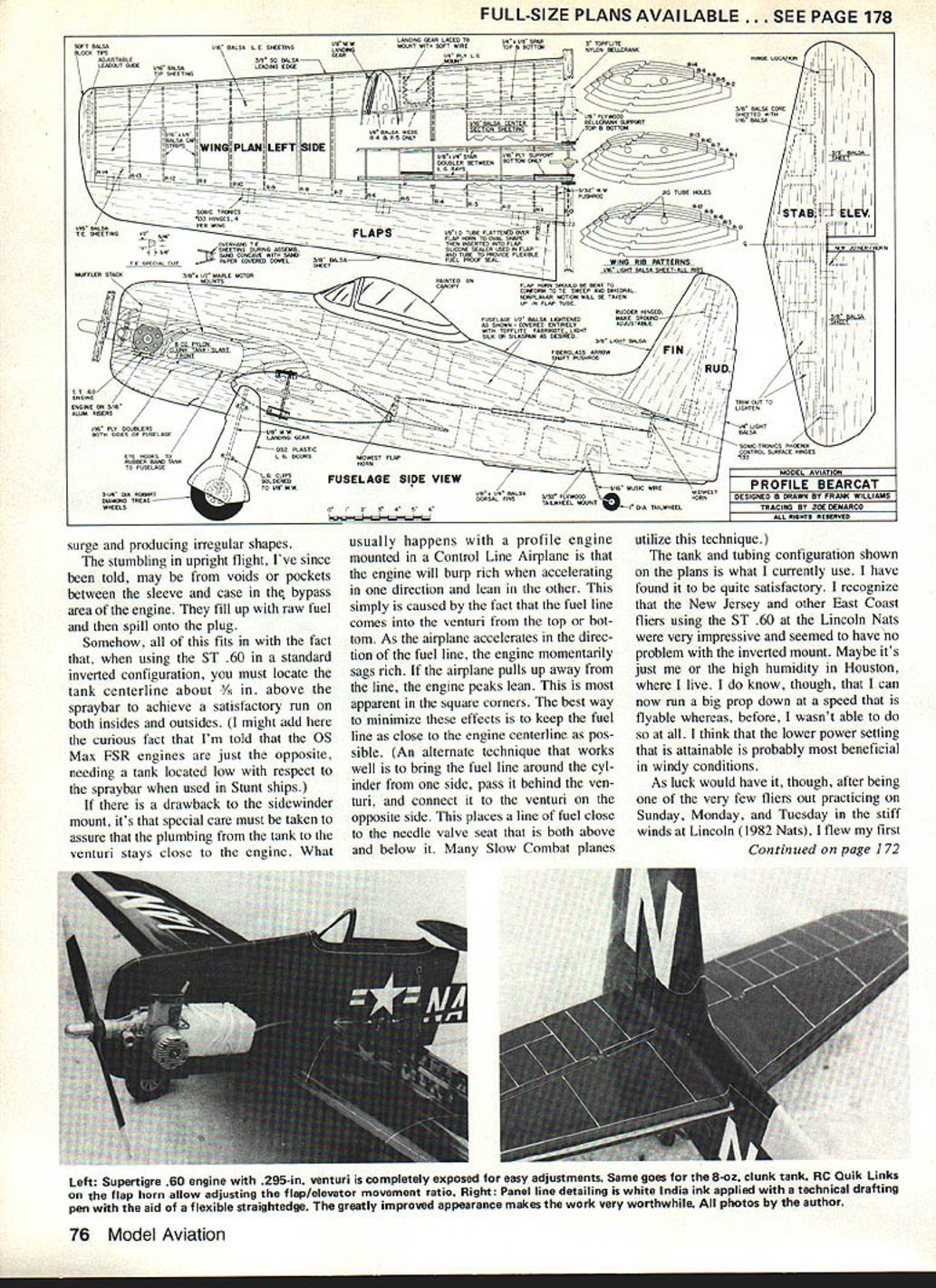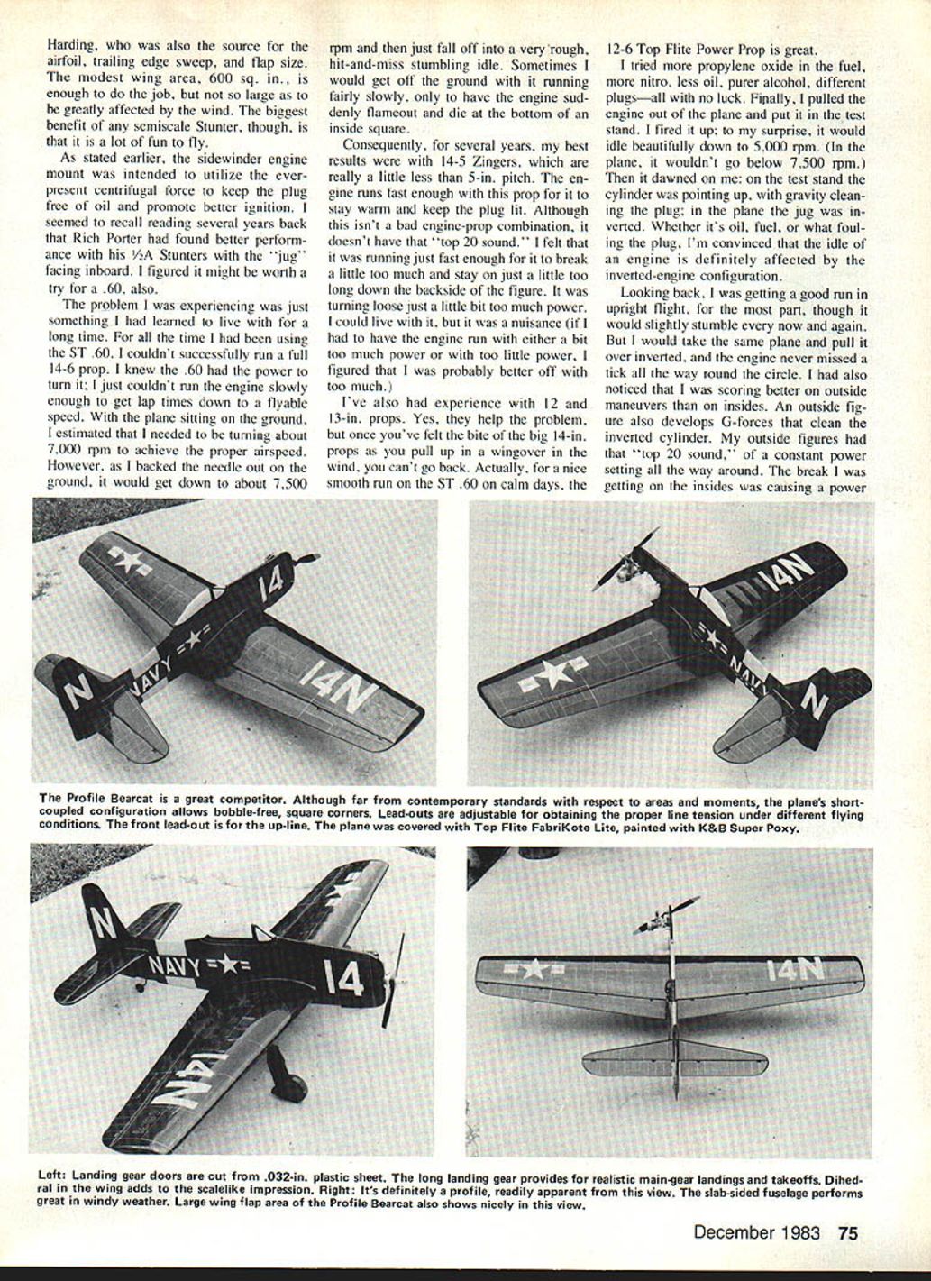 IF NECESSITY mother invention Profile Bearcat born need flying engine testbed exercise merits rather wild idea about engine performance Stunt ship wanted test engine mounted profile posi tion standard profile setup engine mounted facing outboard wanted cylinder facing inside circle As will try explain later felt performance engine being adversely affected standard Stunt ships inverted mount inboard cylinder placement let centrifugal force keep glow plug free oil thus promote better ignition characteristics hopefully better Stunt run came about end 1981 flying season felt needed steadier en gine run getting Oh plenty power ST 60 1 running power spare really just wasnt sounding like engines top 20 fliers Seguin Nats ear top 20 sound round maneuvers rarely breaks alla solid four-cycle way around four years running ST 60 1 never able run quite manner wanted able run big prop real slowly full built-up fuselage testbed airplane out question needed airplane would fairly quick build knew flew well impor tantly easy access engine tank associated plumbing pro file Since can muster enough energy undertake Stunt ship year risking whole season something might work 1978 built full-blown molded fuselage Rabe Bearcat about 56 oz ST 46 power sported nice enough finish receive 16 appearance points Lake Charles Nats summer plane flew great Unfortunately wasn t its equal seriously flying Stunt two three years time performance good first Nats satisfied Stunt ships Ive flown Bearcat different No other plane has shown inherent well-damped dynamic response Bearcat possesses will fly out hard corner trace bobble overshoot No matter hard 4 pur r hit corner just turns lays have always felt Bearcat has benefitted its short nose tail lengths resulting lower-than-normal pitch inertia feel lower pitch ertia comparison todays Stunters contributes superior damping pitch Bearcat possesses Also fluencing pitch dynamics items like Bearcats flap size impor tantly CG placement rearward CG can located better pitch damping up point course must coordinated line spacings con trol throw etc achieve perfect feel several years wanting try another Bearcat testbed profile tall fuselage would hide muf fler exhaust stack would pointing up instead out inboard side rea soned Profile Bearcat basically copy Rabe Bearcat though pumped up profile view full vertical scale youre going have profile fuselage big might well add extra inch make scale correct stabilizer elevator slightly increased per info Ron 74 Model Aviation Harding also source airfoil trailing edge sweep flap size modest wing area 600 sq enough job large greatly affected wind biggest benefit semiscale Stunter though lot fun fly As stated earlier sidewinder engine mount intended utilize everpresent centrifugal force keep plug free oil promote better ignition seemed recall reading several years back Rich Porter found better perform ance /2A Stunters jug facing inboard figured might worth try 60 also problem experiencing just something learned live long time time using ST 60 1 couldnt successfully run full 14-6 prop knew 60 power turn just couldnt run engine slowly enough get lap times down flyable speed plane sitting ground estimated needed turning about 7000 rpm achieve proper airspeed However backed needle out ground would get down about 7500 rpm just fall off very rough hit-and-miss stumbling idle Sometimes would get off ground running fairly slowly have engine sud denly flameout die bottom inside square Consequently several years best results 14-5 Zingers really little less 5-in pitch en gine runs fast enough prop stay warm keep plug lit Although isnt bad engine-prop combination doesnt have top 20 sound felt running just fast enough break little too much stay just little too long down backside figure turning loose just little bit too much power could live it nuisance have engine run either bit too much power too little power figured probably better off too much Ive also experience 12 13-in props Yes help problem once youve felt bite big 14-in props pull up wingover wind cant go back Actually nice smooth run ST 60 calm days 12-6 Top Flite Power Prop great tried propylene oxide fuel nitro less oil purer alcohol different plugsall no luck Finally pulled engine out plane put test stand fired up surprise would idle beautifully down 5000 rpm plane wouldnt go below 7500 rpm dawned on test stand cylinder pointing up gravity clean ing plug plane jug verted Whether its oil fuel what foul ing plug Im convinced idle engine definitely affected inverted-engine configuration Looking back getting good run upright flight part though would slightly stumble now again would take same plane pull over inverted engine never missed tick way round circle also noticed scoring better outside maneuvers insides An outside fig ure also develops G-forces clean inverted cylinder outside figures top 20 sound constant power setting way around break getting insides causing power December 1983 75 Profile Bearcat great competitor Although far contemporary standards respect areas moments planes shortcoupled configuration allows bobble-free square corners Lead-outs adjustable obtaining proper line tension under different flying conditions front lead-out up-line plane covered Top Flite FabriKote Lite painted K&B Super Poxy Left Landing gear doors cut 032-in plastic sheet long landing gear provides realistic main-gear landings takeoffs Dihed ral wing adds scalelike impression Right Its definitely profile readily apparent view slab-sided fuselage performs great windy weather Large wing flap area Profile Bearcat also shows nicely view FULL-SIZE PLANS AVAILABLE. SEE PAGE 178 LARDING GEAR LACED TALA 0B SPARS PAPPLITE SOET BALSACr BALSA C E STEErINGEWART WITH SAFT WIRERAP & BATTAR EWIXADMEE AA DASG WEBSIIISEIiOESiilIW A/A A TWEET STABI IELEV SE SPECIAL CATPAPEB COVEBEG DOWEL5/B BALSAFUEL PEASE SEALa-I EBEPPLEB STALE5/B LS MARl WOTOB FIBERGLASS ABBOWPIN ENGINE SB SIN VIA PLY OSUBLEBSILW MW ISOSIC-TASSICS PHOENIX ETE TAAGS