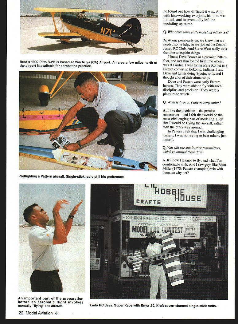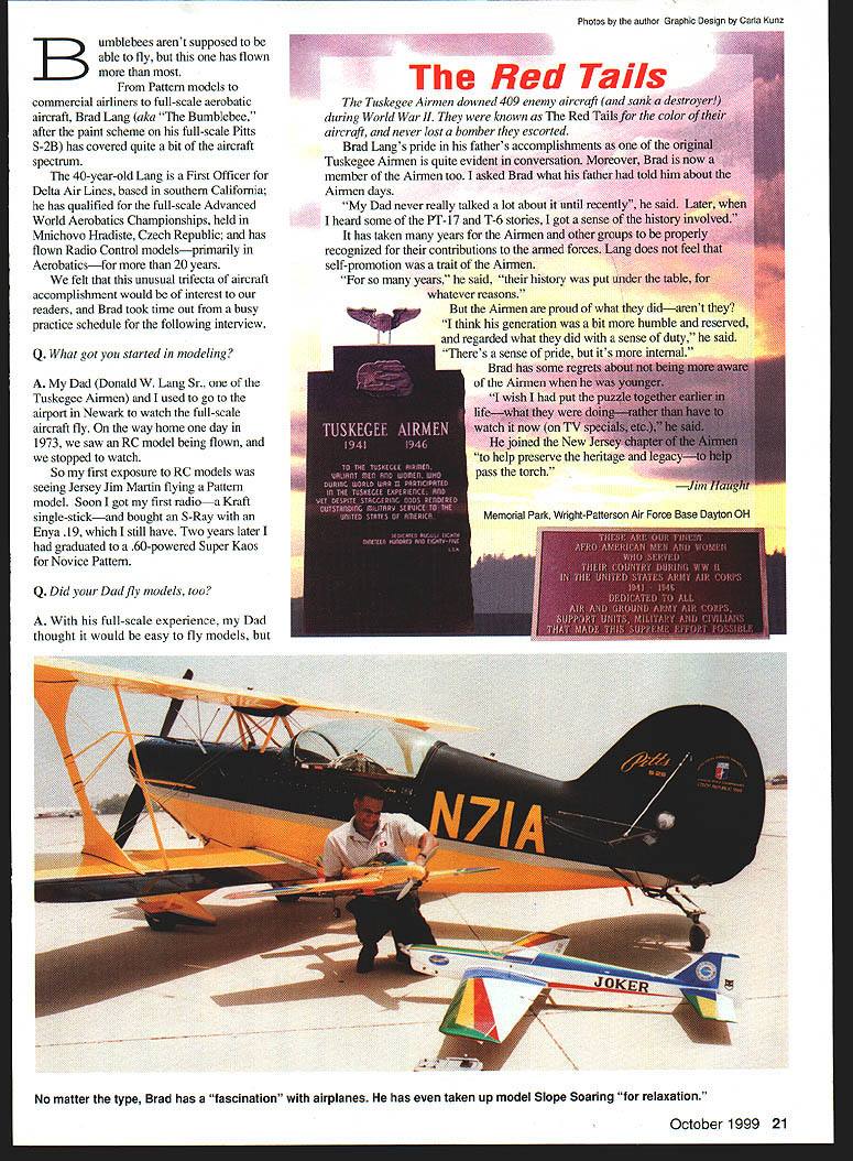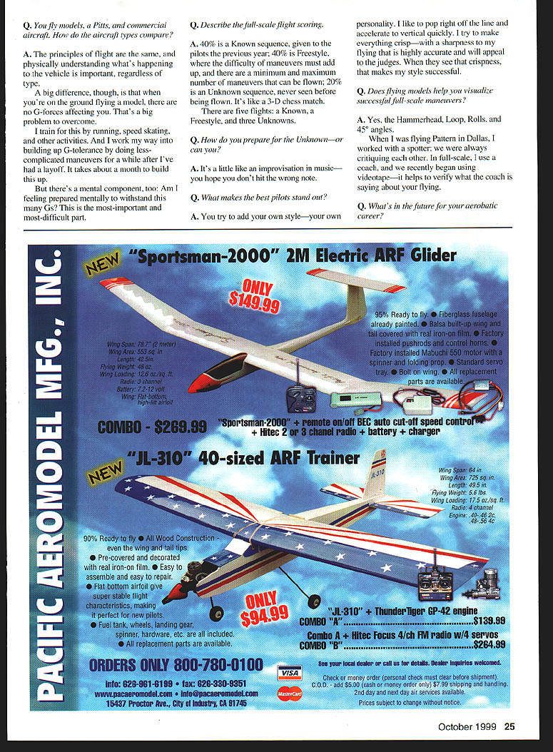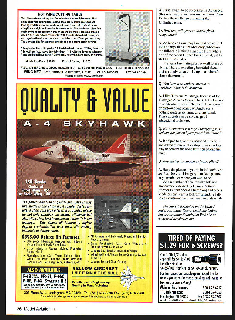 Brad Lang U Jim Naught Brad flies 1992 Pitts S-2B Bumblebee aerobatic competition Photo Jim Koepnick / Bumblebees arent supposed able fly has flown Pattern models commercial airliners full-scale aerobatic aircraft Brad Lang aka Bumblebee after paint scheme full-scale Pins S-2B has covered quite bit aircraft spectrum 40-year-old Lang First Officer Delta Air Lines based southern California has qualified full-scale Advanced World Aerobatics Championships held Mnichovo Hradiste Czech Republic has flown Radio Control modelsprimarily Aerobaticsfor 20 years felt unusual trifecta aircraft accomplishment would interest readers Brad took time out busy practice schedule following interview Q What got started modeling Dad Donald W Lang Sr Tuskegee Airmen used go airport Newark watch full-scale aircraft fly way home day 1973 saw RC model being flown stopped watch So first exposure RC models seeing Jersey Jim Martin flying Pattern model Soon got first radioa Kraft single-stickand bought S-Ray Enya 19 still have Two years later graduated 60-powered Super Kaos Novice Pattern Q Did Dad fly models too full-scale experience Dad thought would easy fly models Photos author Grapht Design Carla Kunz October 1999 21 No matter type Brad has fascination airplanes has taken up model Slope Soaring tor relaxation found out difficult himworking two jobs time limited eventually left modeting up Q some early modeling influences point early knew needed some help joined Central Jersey RC Club Steve West really took time explain things knew Dave Brown premier Pattern flier met him first time Purdue flying Sig Komet Pattern contest Kokomo Indiana saw Dave Lewis doing 8-point rolls thought lot airmanship Dave Patton early Pattern heroes able fly such discipline precision pleasure watch Q What led Pattern competition like precisionthe precise maneuversand felt would most-challenging part modeling felt would flying aircraft rather other way around Pattern felt challenging myself flying beat others just myself Q still use single-stick transmitters unusual days Its learned fly what Im comfortable saw guys like Rhett Miller 1 970s Pattern champion win 22 Model Aviation s 1992 Pitts S-2B based Van Nuys CA Airport An area few miles north airport available aerobatics practice Preflighting Pattern aircraft Single-stick radio still preference An important part preparation before aerobatic flight involves mentally flying aircraft Early RC days Super Kaos Enya 60 Kraft seven-channel single-stick radio Q You fly models Pitts commercial aircraft aircraft types compare principles flight same physically understanding whats happening vehicle important regardless type big difference though youre ground flying model no C-forces affecting Thats big problem overcome train running speed skating other activities work way building up C-tolerance doing lesscomplicated maneuvers after Ive layoff takes about month build up theres mental component too Am feeling prepared mentally withstand Cs most-important most-difficult part Q Describe thefull-scaleflight scoring 40% Known sequence given pilots previous year 40% Freestyle difficulty maneuvers must add up minimum maximum number maneuvers can flown 20% Unknown sequence never seen before being flown Its like 3-D chess match five flights Known Freestyle three Unknowns Q How prepare Unknownor can Its little like improvisation music hope dont hit wrong note Q What makes best pilots stand out personality like pop right off line accelerate vertical quickly try make everything crispwith sharpness flying highly accurate will appeal judges see crispness makes style successful Q Does flying models help visualize successful full-scale maneuvers Yes Hammerhead Loop Rolls 450 angles flying Pattern Dallas worked spotter always cntiquing other full-scale use coach recently began using videotapeit helps verify what coach saying about flying October 1999 25 Q Whats future fur aerobatic try add own styleyour own career HOT WIRE CUTTING TABLE ultimate foam cuUing tool hobbyists model makers unique hot wire cutting table allows user create professional looking models other works art no time Cuts types rigid semi-rigid cushion foam materials tensioned ultra fine cutting wire glides smoothly thru foam like magic creating precise clean cuts never before obtainable adjustable heat probe can regulate wire temperature sult type foam using arm tilts accurate straight compound angle cutting Tough ultra fine cutting wire Adjustable heat control * Tilting bow arm * Smooth surface heavy duty table base * 12 volt step down transformer Insulated steel bow frame Completely assembled ready operate Introductory Price $ 9999Product Catalog $ 500 VISA MASTER CARD & DISCOVER ACCEPTED ADD $ 500 SHIPPING IN USA IL RESIDENT ADD WING MFG 306 E SIMMONS GALESBURG IL 61401CALL 309-342-3009FAX 309-342-3014 Visit us http// wwwwingmfgcom OURLITY E U $39500 Deluxe Kit Features piece Fiberglass Fuselage integral Vertical Fin Scale Panel Lines Large Interform Recess Molded Fiberglass Access Hatch Fiberglass Inlet Split Type Exhaust Ducts Wing Gear Pods Canopy Frame Pre-cut Cockpit Floor Refueling Probe Antennas etc Formers Bulkheads Precut Sanded Ready Install Balsa Presheeted Foam Core Wings Stabilizers LE Installed Landing Gear Blocks Installed Wings Wheel Well Aileron Servo Openings Routed Wings Vacuum Formed Clear Canopy YELLOW AIRCRAFT INTER NAT HO N AL F-laSR-fl F-16C 1F4EF14STARFIREIII Excellence EngIneering ISend $4 00 wit hin USA $10 00 IQuality Manufacturing world Product Info Pack 203 Mass Ave Lexington MA 02420 Tel 781 674-9898 Fax 781 674-2288 Prico sublect change prior notice shipping handling extra First want successful Advanced Brads first year team Id like challenge making Unlimited team Q How long will continue fly competition As long can keep freshness look guys like Clint McHenry won full-scale Nationals Ed Hurt whos oldest Pattern fliers around yet still has vitality Hying fascinating meall forms flying Theres something beautiful a