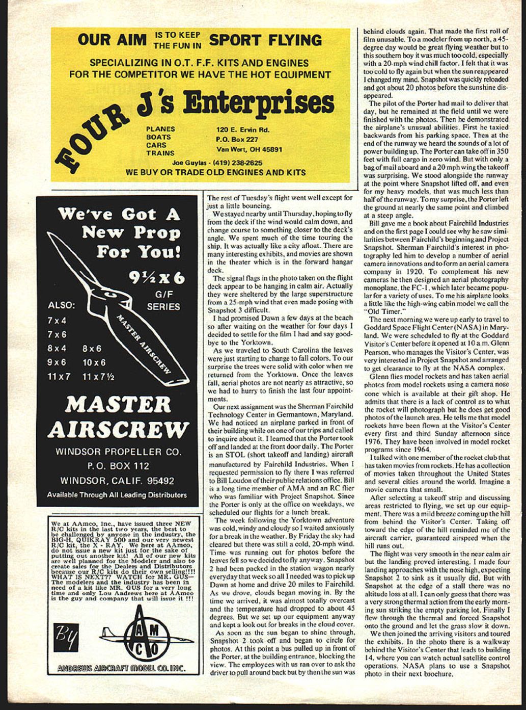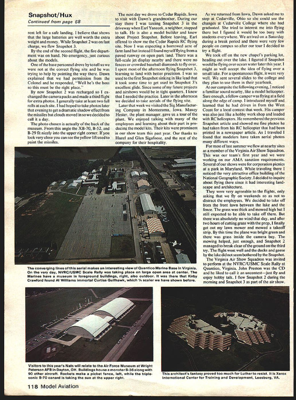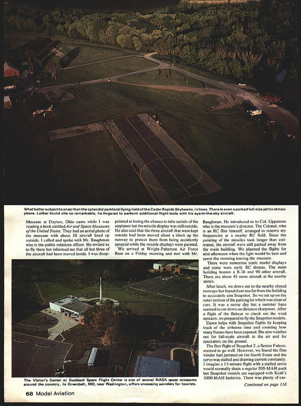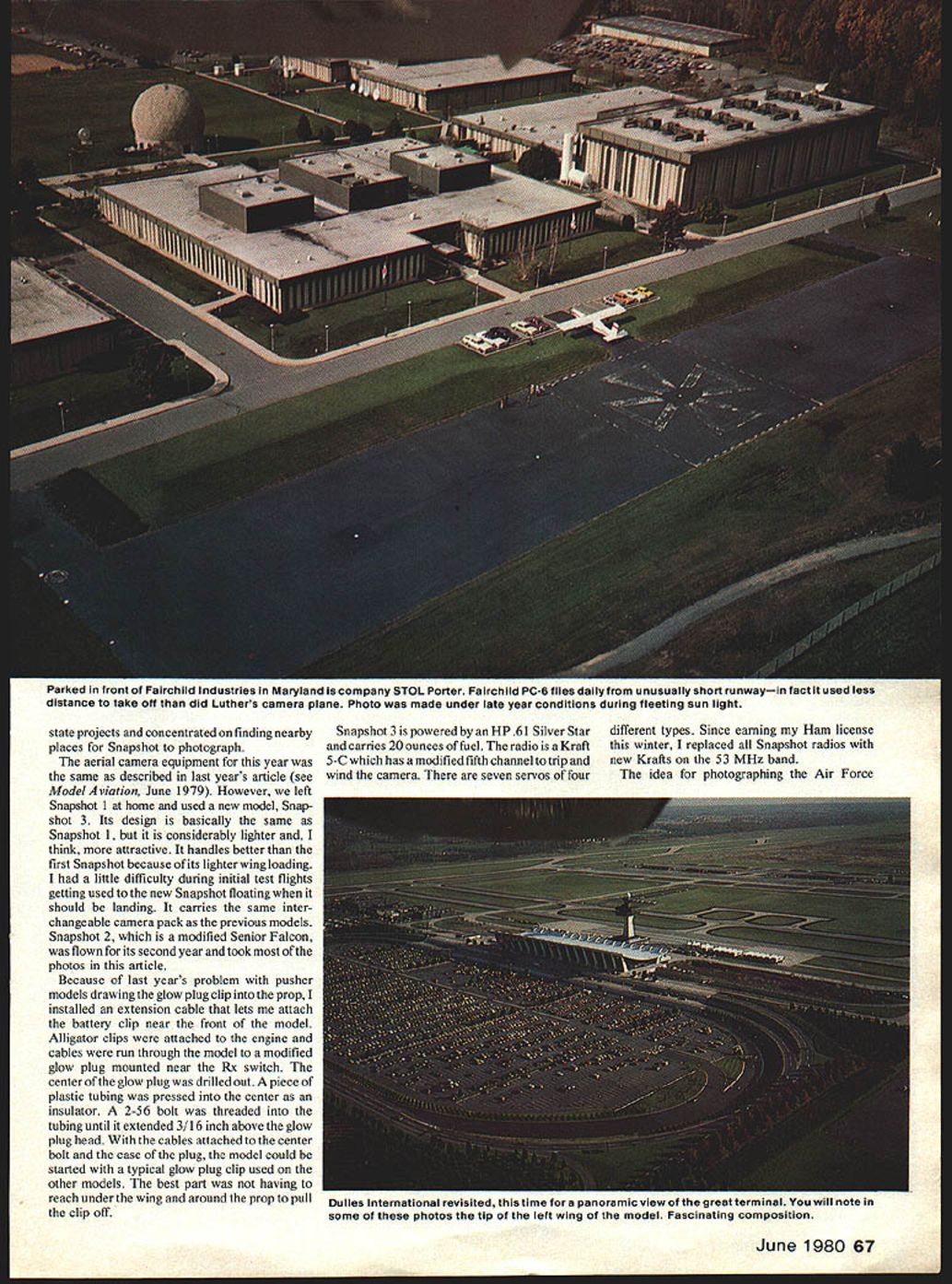 NO OCR TEXT NO OCR TEXT soon found motor home just like other hobbies too required time money After number adjustments repairs made took short trips nearby flying fields check out vehicle supplies Figuring out operate appliances motor home proved adventure learning previous owner gone running water until camper showed him water pump switch opposite problem water ran fine soon learned fresh water available room store developed check list motor home like ones used Snapshot flights prevents problems like driving off electric cord still hooked up driving no safety catch refrigerator door camping skills improved set out first long trip Ohio didnt realize started biggest challenge trip would getting home Most projects scheduled during winter bought motor home before gas shortage first trip planned just time gas crisis Try driving motor home over 1000 miles five gallons stop Actually gas mileage much worse station wagon did alright must sit gas line would certainly recommend motor home comforts home can fix dinner make bathroom stops take nap rest up drive next gas station As result gas problems pursued remaining out-of66 Model Aviation Tourists familiar National Geographic Society building Washington DC camera plane shot Maryland offices would fitting picture attractive publication Small white dots right foreground mark Luthers airfield mow own strip Snapshot 3 functional can beafterall has three years meticulous developmen methodology camera access hatch open An Olympus RC 1 35-mm camera photo graphs left wing aimed Positioning plane knowing click precision task Parked front Fairchild Industries Maryland company STOL Porter Fairchild PC-6 flies daily unusually short runwayin fact used less distance take off did Luthers camera plane Photo made under late year conditions during fleeting sun light state projects concentrated finding nearby places Snapshot photograph aerial camera equipment year same described last years article see ModelAviation June 1979 However left Snapshot 1 home used new model Snap shot 3 Its design basically same Snapshot 1 considerably lighter think attractive handles better first Snapshot because its lighter wing loading little difficulty during initial test flights getting used new Snapshot floating should landing carries same inter changeable camera pack previous models Snapshot 2 modified Senior Falcon flown its second year took ofthe photos article Because last years problem pusher models drawing glow plug clip prop installed extension cable lets attach battery clip near front model Alligator clips attached engine cables run through model modified glow plug mounted near Rx switch center glow plug drilled out piece plastic tubing pressed center insulator 2-56 bolt threaded tubing until extended 3/16 inch above glow plug head cables attached center bolt case plug model could started typical glow plug clip used other models best part having reach under wing around prop pull clip off Snapshot 3 powered HP 61 Silver Star carries 20 ounces fuel radio Kraft 5-C has modified fifth channel trip wind camera seven servos four different types Since earning Ham license winter replaced Snapshot radios new Krafts 53 MHz band idea photographing Air Force June 1980 67 Dulles International revisited time panoramic view greatterminal will note some photos tip left wing model Fascinating composition What better subjectto snap splendid parkiand flying field Cedar Rapids Skyhawks Iowa parked full-size jet foratmos phere Luther found site remarkable lingered perform additional flight tests eye-in-the-sky aircraft Museum Dayton Ohio came reading book entitled Airand Space Museums ofthe United States aerial photo museum about 50 aircraft lined up outside called spoke Mr Baughman public relations officer invited us fly informed three aircraft moved inside disap pointed losing chance take aerials airplanes missile display still outside also said three aircraft kept outside moved about block up runway protect being accidently sprayed missile displays painted arrived Wright-Patterson Air Force Base Friday morning met Mr Baughman introduced us Col Uppstrom museums director Colonel RC flier himself arranged reserve frequencies nearby RC field Since painting missiles took longer esti mated aircraft still parked away main building planned flights mid-afternoon light would best spent morning touring museum numerous static model displays some early RC drones main building houses B-36 90 other aircraft about 45 aircraft nearby annex After lunch drove out nearby closed runways found too far building accurately aim Snapshot So set up outer section parking lotwhich clear cars sunny day summer haze seemed cut down distance sharpness After flight Bobcat check out wind upstairs prepared fly Snapshot models Dawn helps Snapshot flights keeping track airborne time counting frames have exposed also watches out full-scale aircraft air spectators ground first flight Snapshot 2 Senior Falcon seemed go well However found film winder jammed fourth frame servo stalled drawing current constantly imagine 15-minute flight stalled servo would normally drain regular 500-MAH pack Snapshot models equipped Krafts 1000-MAH batteries plenty cur Continued page 118 68 Model Aviation no visitors eruier Isouaaru opacu ni iarner uric urn severe dOP space museums around country Greenbelt MD near tashington offers uncaasing wonders tourists Snapshot/H ux Continued page 68 rent left safe landing believe shows large batteries well worth extra weight money Snapshot 2 fast charge flew Snapshot 3 end second flight fire depart ment hand No emergency just curious about models base personnel drove tell us correct flying site trying help pointing way Dawn explained permission Colonel responded Well hes boss must right place now Snapshot 2 recharged ex changed camera packs made third flight extra photos generally take least two full rolls site hoped take photos later evening get dramatic shadow effect missiles clouds moved decided call day phot
