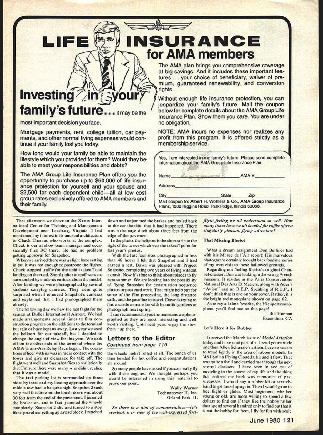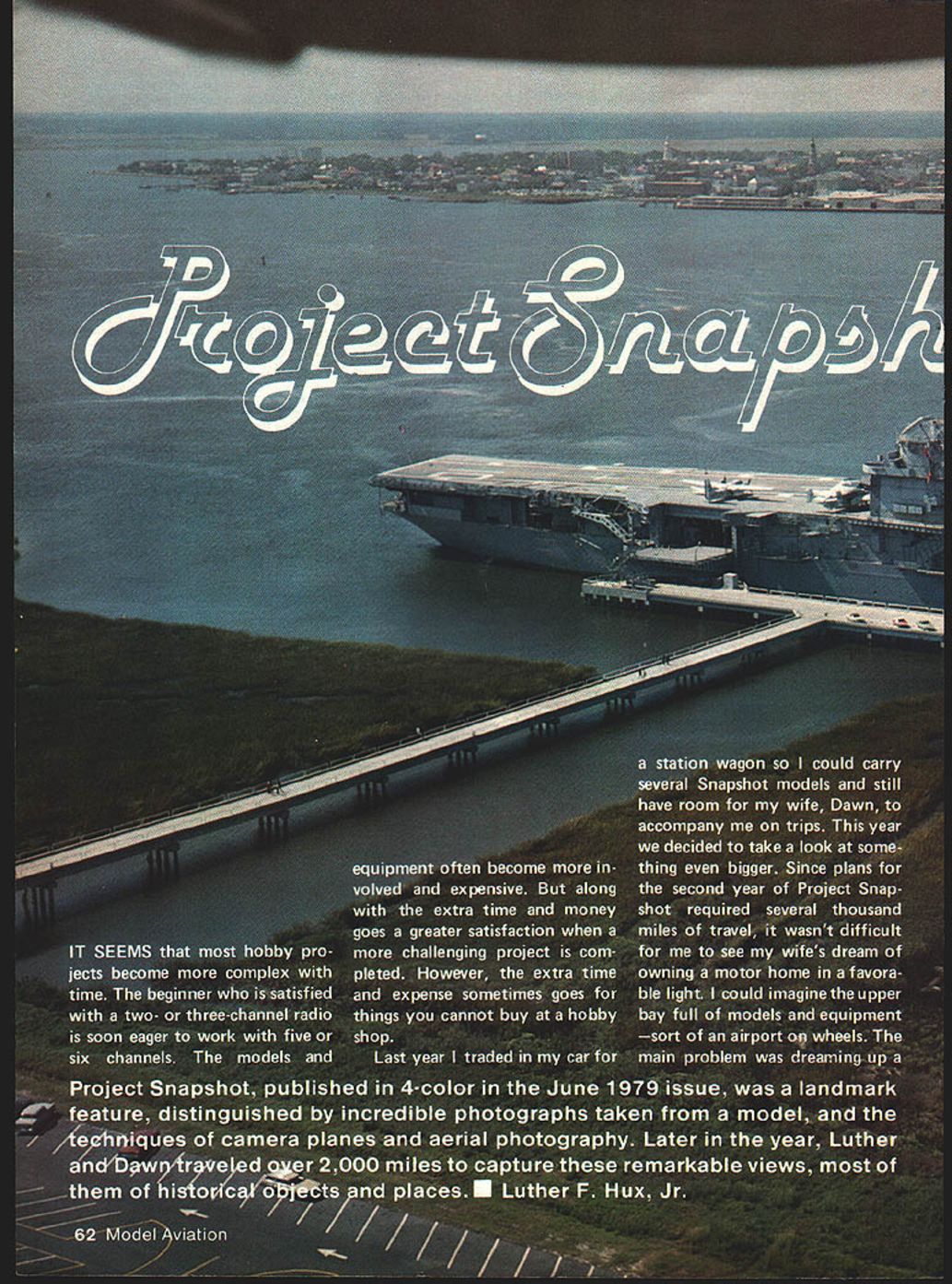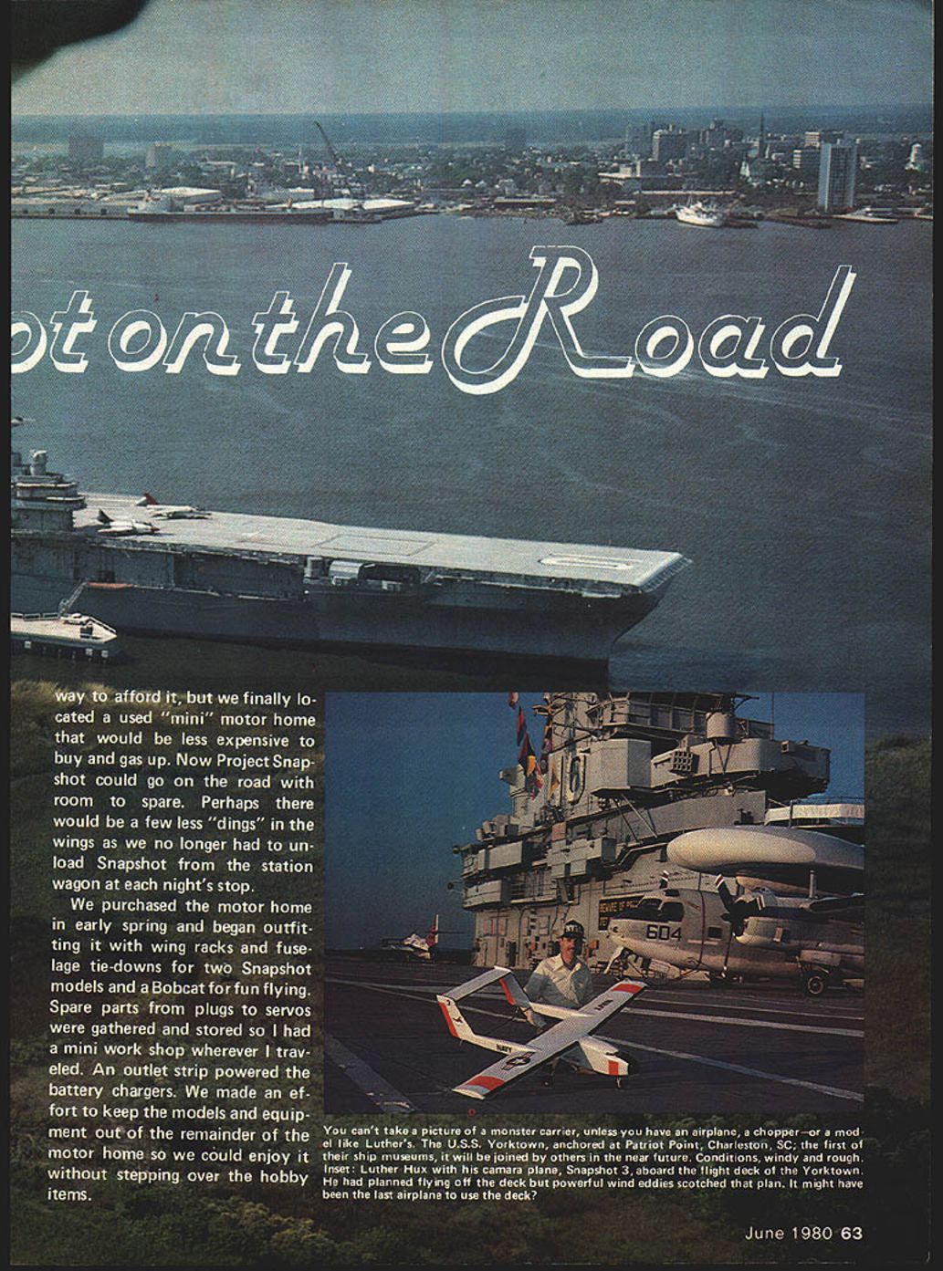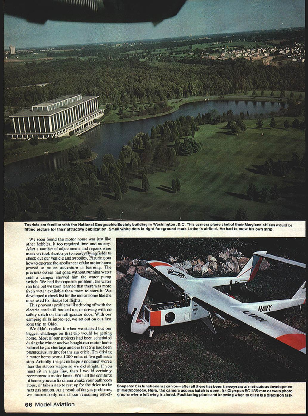 NO OCR TEXT NO OCR TEXT soon found motor home just like other hobbies too required time money After number adjustments repairs made took short trips nearby flying fields check out vehicle supplies Figuring out operate appliances motor home proved adventure learning previous owner gone running water until camper showed him water pump switch opposite problem water ran fine soon learned fresh water available room store developed check list motor home like ones used Snapshot flights prevents problems like driving off electric cord still hooked up driving no safety catch refrigerator door camping skills improved set out first long trip Ohio didnt realize started biggest challenge trip would getting home Most projects scheduled during winter bought motor home before gas shortage first trip planned just time gas crisis Try driving motor home over 1000 miles five gallons stop Actually gas mileage much worse station wagon did alright must sit gas line would certainly recommend motor home comforts home can fix dinner make bathroom stops take nap rest up drive next gas station As result gas problems pursued remaining out-of66 Model Aviation Tourists familiar National Geographic Society building Washington DC camera plane shot Maryland offices would fitting picture attractive publication Small white dots right foreground mark Luthers airfield mow own strip Snapshot 3 functional can beafterall has three years meticulous developmen methodology camera access hatch open An Olympus RC 1 35-mm camera photo graphs left wing aimed Positioning plane knowing click precision task Parked front Fairchild Industries Maryland company STOL Porter Fairchild PC-6 flies daily unusually short runwayin fact used less distance take off did Luthers camera plane Photo made under late year conditions during fleeting sun light state projects concentrated finding nearby places Snapshot photograph aerial camera equipment year same described last years article see ModelAviation June 1979 However left Snapshot 1 home used new model Snap shot 3 Its design basically same Snapshot 1 considerably lighter think attractive handles better first Snapshot because its lighter wing loading little difficulty during initial test flights getting used new Snapshot floating should landing carries same inter changeable camera pack previous models Snapshot 2 modified Senior Falcon flown its second year took ofthe photos article Because last years problem pusher models drawing glow plug clip prop installed extension cable lets attach battery clip near front model Alligator clips attached engine cables run through model modified glow plug mounted near Rx switch center glow plug drilled out piece plastic tubing pressed center insulator 2-56 bolt threaded tubing until extended 3/16 inch above glow plug head cables attached center bolt case plug model could started typical glow plug clip used other models best part having reach under wing around prop pull clip off Snapshot 3 powered HP 61 Silver Star carries 20 ounces fuel radio Kraft 5-C has modified fifth channel trip wind camera seven servos four different types Since earning Ham license winter replaced Snapshot radios new Krafts 53 MHz band idea photographing Air Force June 1980 67 Dulles International revisited time panoramic view greatterminal will note some photos tip left wing model Fascinating composition What better subjectto snap splendid parkiand flying field Cedar Rapids Skyhawks Iowa parked full-size jet foratmos phere Luther found site remarkable lingered perform additional flight tests eye-in-the-sky aircraft Museum Dayton Ohio came reading book entitled Airand Space Museums ofthe United States aerial photo museum about 50 aircraft lined up outside called spoke Mr Baughman public relations officer invited us fly informed three aircraft moved inside disap pointed losing chance take aerials airplanes missile display still outside also said three aircraft kept outside moved about block up runway protect being accidently sprayed missile displays painted arrived Wright-Patterson Air Force Base Friday morning met Mr Baughman introduced us Col Uppstrom museums director Colonel RC flier himself arranged reserve frequencies nearby RC field Since painting missiles took longer esti mated aircraft still parked away main building planned flights mid-afternoon light would best spent morning touring museum numerous static model displays some early RC drones main building houses B-36 90 other aircraft about 45 aircraft nearby annex After lunch drove out nearby closed runways found too far building accurately aim Snapshot So set up outer section parking lotwhich clear cars sunny day summer haze seemed cut down distance sharpness After flight Bobcat check out wind upstairs prepared fly Snapshot models Dawn helps Snapshot flights keeping track airborne time counting frames have exposed also watches out full-scale aircraft air spectators ground first flight Snapshot 2 Senior Falcon seemed go well However found film winder jammed fourth frame servo stalled drawing current constantly imagine 15-minute flight stalled servo would normally drain regular 500-MAH pack Snapshot models equipped Krafts 1000-MAH batteries plenty cur Continued page 118 68 Model Aviation no visitors eruier Isouaaru opacu ni iarner uric urn severe dOP space museums around country Greenbelt MD near tashington offers uncaasing wonders tourists Snapshot/H ux Continued page 68 rent left safe landing believe shows large batteries well worth extra weight money Snapshot 2 fast charge flew Snapshot 3 end second flight fire depart ment hand No emergency just curious about models base personnel drove tell us correct flying site trying help pointing way Dawn explained permission Colonel responded Well hes boss must right place now Snapshot 2 recharged ex changed camera packs made third flight extra photos generally take least two full rolls site hoped take photos later evening get dramatic shadow effect missiles clouds moved decided call day phot