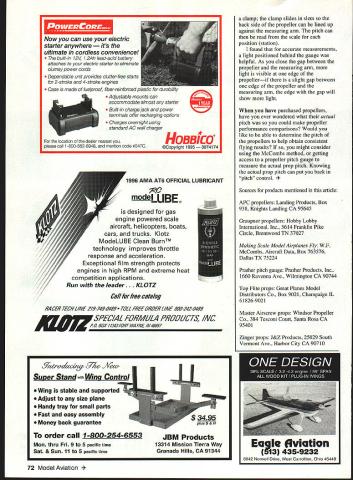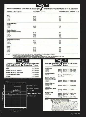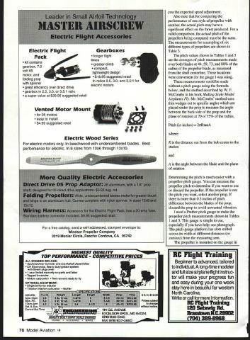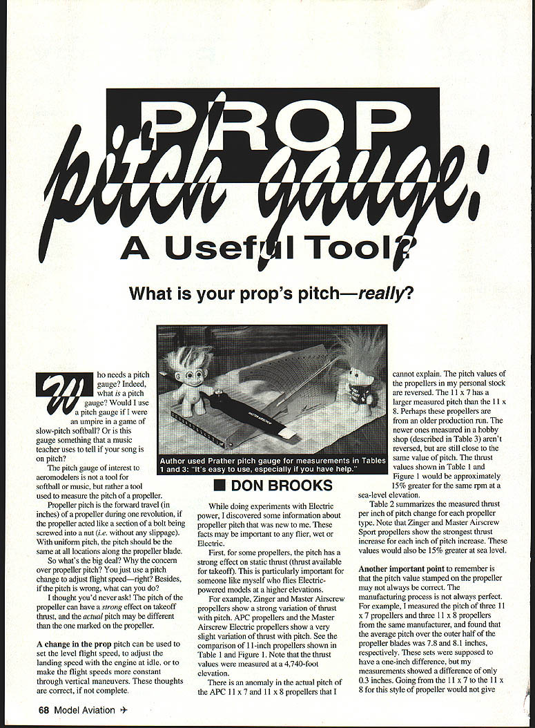 ho needs pitch what pitch gauge Indeed gauge Would use pitch gauge umpire game slow-pitch softball gauge something music teacher uses tell song pitch pitch gauge interest aeromodelers tool softball music rather tool used measure pitch propeller Propeller pitch forward travel inches propeller during revolution propeller acted like section bolt being screwed nut ie slippage uniform pitch pitch should same locations along propeller blade So whats big deal concern over propeller pitch just use pitch change adjust ffight speedright Besides pitch wrong what can thought youd never ask pitch propeller can have strong effect takeoff thrust actual pitch may different marked propeller change prop pitch can used set level flight speed adjust landing speed engine idle make flight speeds constant through vertical maneuvers thoughts correct complete doing experiments Electric power discovered some information about propeller pitch new facts may important flier wet Electric First some propellers pitch has strong effect static thrust thrust available takeoff particularly important someone like myself flies Electricpowered models higher elevations example Zinger Master Airscrew propellers show strong variation thrust pitch APC propellers Master Airscrew Electric propellers show very slight variation thrust pitch See comparison 11-inch propellers shown Table 1 Figure 1 Note thrust values measured 4740-foot elevation anomaly actual pitch APC 11 x 7 11 x 8 propellers 0 0 cannot explain pitch values propellers personal stock reversed 11 x 7 has larger measured pitch 11 x 8 Perhaps propellers older production run newer ones measured hobby shop described Table 3 arent reversed still close same value pitch thrust values shown Table 1 Figure 1 would approximately 15% greater same rpm sea-level elevation Table 2 summarizes measured thrust per inch pitch change propeller type Note Zinger Master Airscrew Sport propellers show strongest thrust increase inch pitch increase values would also 15% greater sea level Another important point remember pitch value stamped propeller may always correct manufacturing process always perfect example measured pitch three 11 x 7 propellers three 11 x 8 propellers same manufacturer found average pitch over outer half propeller blades 78 81 inches respectively sets supposed have one-inch difference measurements showed difference 03 inches Going 11 x 7 11 x 8 style propeller would give 68 Model Aviation What props pitchreally U DON BROOKS Variation Thrust Pitch 6300 rpm erent Propeller Types 11-in Diameter POP64d 71~6 APC 11x625962 11x727581 11x826375 11x926386 Master Airscrew Electric 11 x732572 11 x933290 Master Airscrew Black SDOrt glass-filled 11x621651 11x726269 11x7525267 11x928375 Top Flite Power Point 11 x618156 11 x720667 lix 1023693 Zinger 11xS54 11x653 11x770 11x879 227 18.3 258 287 t7ES 1 props sanded far proper weight balance pitch may have changed slightly 2 Elevation measurements taken 4740 feet 3 For props given pitch diameter operating same rpm having smaller thrust may also reauire smaller toraue turn Tornue WRR menured theec evneriment Average Measureu PropeIler Types APC Props 11 x6 11 x7 11 x8 Grauoner Proos 10x6 Master Airscrew Black Sport ProDs lOx 16 lix 17 Master Airscrew Wood Props lOx 16 Top Flite Power Point Props lix 17 Zinger ProDs lOx 16 11 x75W 11 x8 Different Average pitch 60 62 & 61 inches Average pitch 79 79 & 77 inches Average pitch 81 82 & 81 inches Average pitch 61 & 61 inches 2 new Average pitch 54 56 & 56 inches Average pitch 68 68 & 68 inches Average pitch 57 59 & 60 inches Average pitch 68 & 64 inches 2 new Average pitch 62 63 & 59 inches Average pitch 72 & 76 inches 2 new Average pitch 79 80 & 84 inches ltO7ES 1 props off shelf unsanded 2 Pitch measurements made follows a Four mess made blade locations 44 5973 & 88% radius measured shaft centerline measurements evenly spaced possible Prather pitch gauge Stations 579 & 11 usedO394 apart unique gauge arent directly related prop radius b No measurements within 112 inch tip c The average pitch listed table grand average nil inh nfea Imnionfe Pack kit contains gearbox 72 volt 05 motor folding prop spinner great efficiency over direct drive gearbox 25 30 351 ratio super value $39 95 suggested retail Vented Motor Mount 05 motors easy install $459 suggested retail Gearboxes longer flight times greater climb compact lightweight design $1895 suggested retail ratios 25 30 351 electric motors U Electric Wood Series electric motors beechwood undercambered blades Best performance electric 8 sizes 10x6 through 13x10 you the expected speed adjustment Also note comparing performance style propeller another actual pitch may have significant effect thrust produced valid comparison actual pitch propellers being compared must same measurements sampling six different types propellers shown Table 3 pitch values shown Tables 1 3 averages pitch measurements made over both blades 44 59 73 88% radius propeller blade measured shaft centerline locations convenient gauge using measurements could made pitch gauge using formula below method described W F McCombs book Making Scale Model Airplanes Fly Mr McCombs method uses thin wedges cut specific angles placed under prop measure angle between back side prop plane rotation 70 75% radius Pitch inches tanA R distance out hub center station angle between blade plane rotation Determining pitch much easier propeller-pitch gauge can measure propeller pitch determine want use discard propeller propeller pitch want select another prop 03 inches pitch difference between blades prop discard prop avoid unwanted vibration used Prather pitch gauge make propeller pitch measurements shown Tables 1 3 gauge simple use especially have help see photograph pitch-gauge platform has slots milled across its width different distances stations measuring arm propeller mounted gauge HIGHEST QUALITY TOP PERFORMANCE COMPETITiW PRICES ALL ENGINES INCLUDE Sachs Doimar cylinder crankshaft Assembiies OH Elec