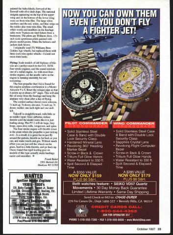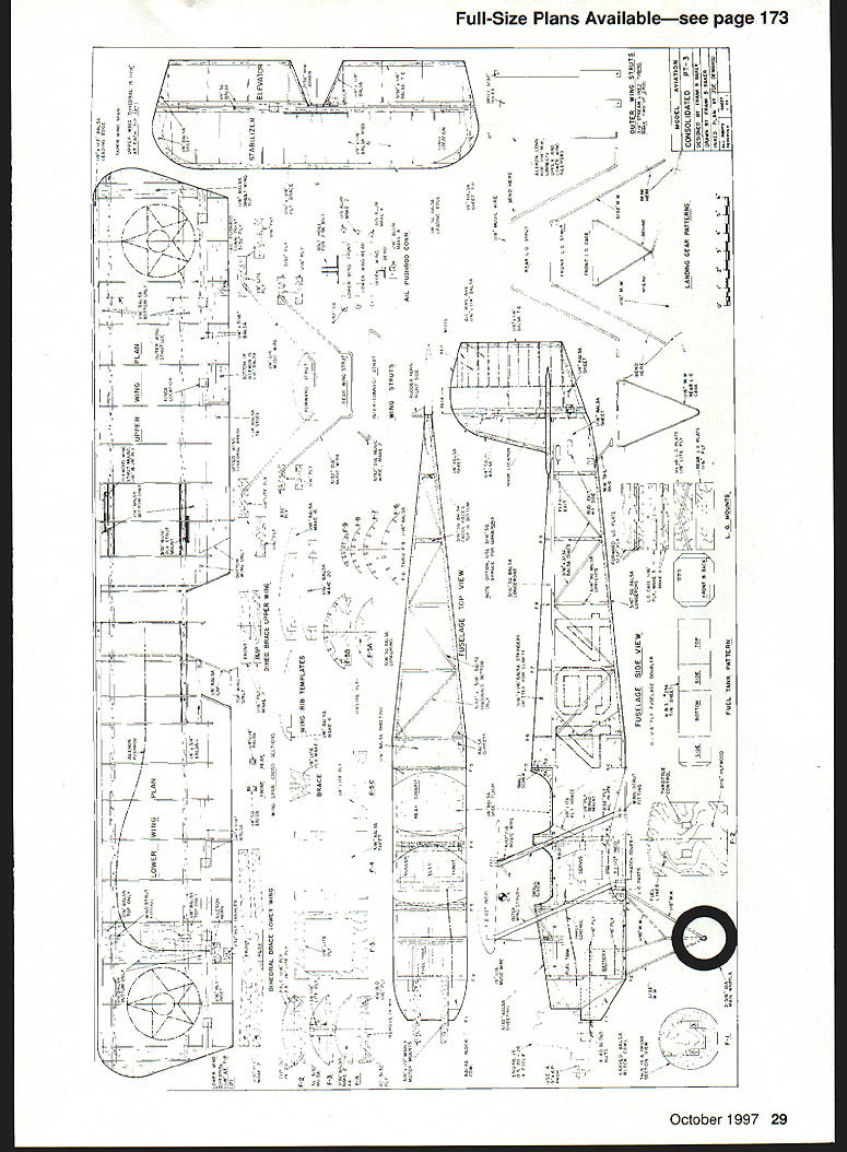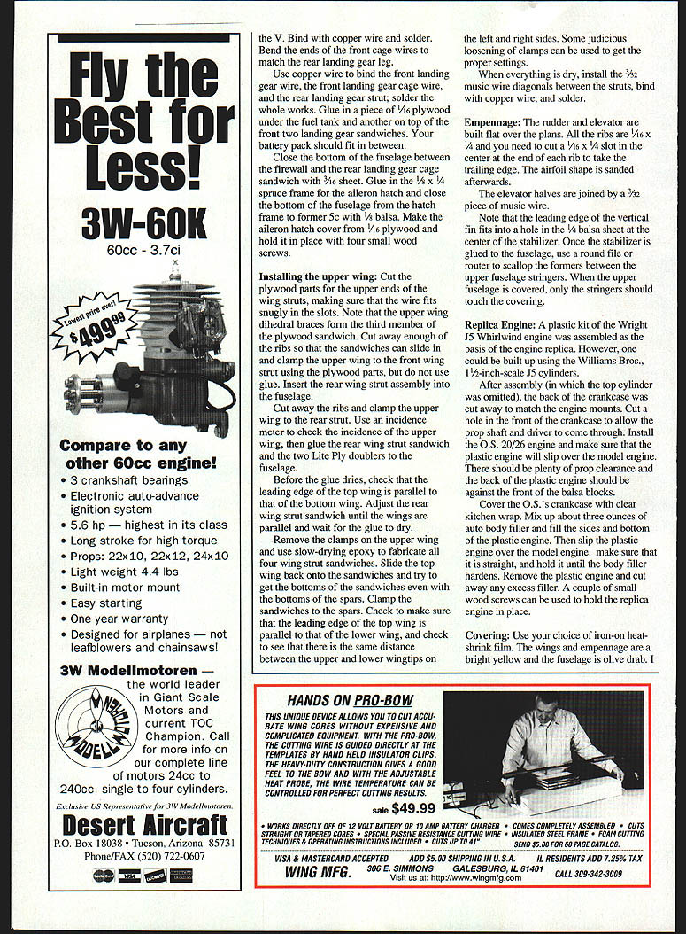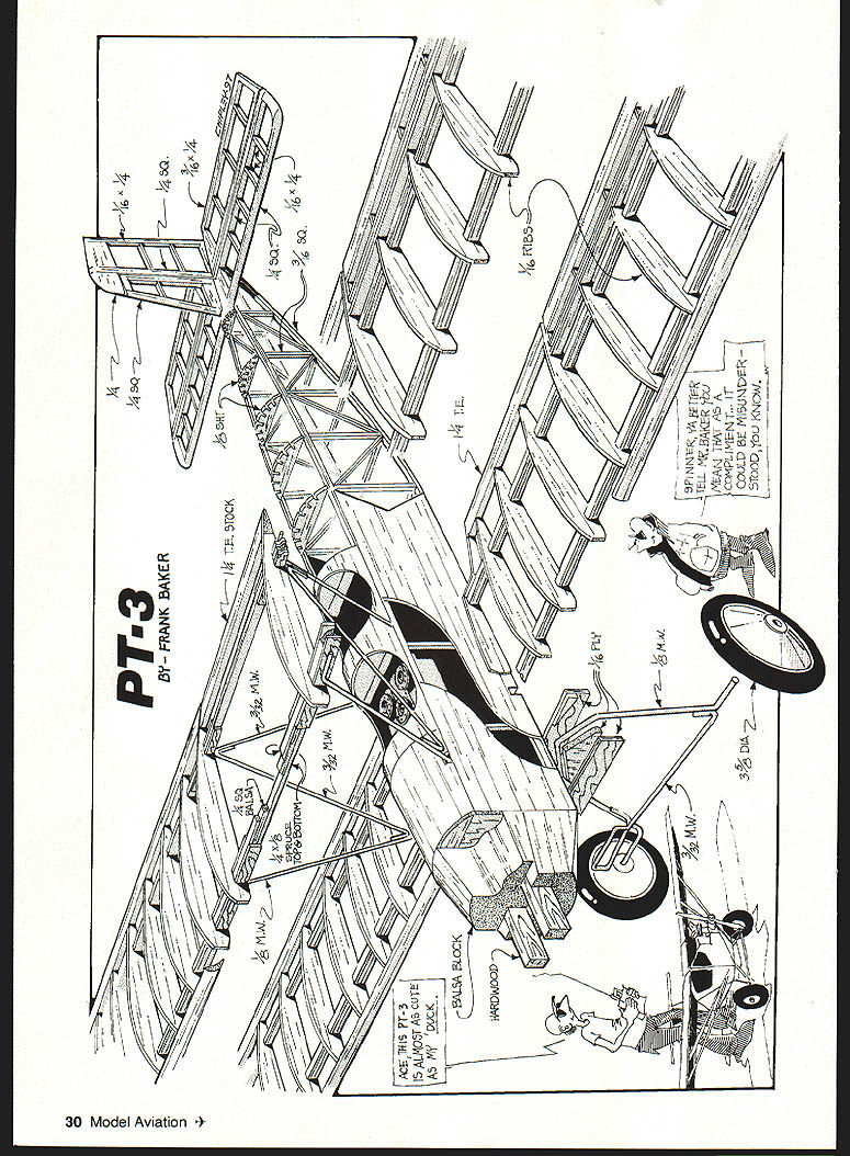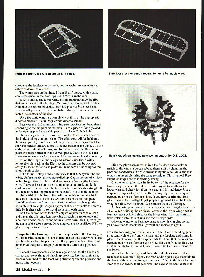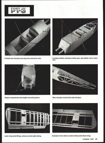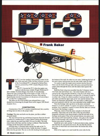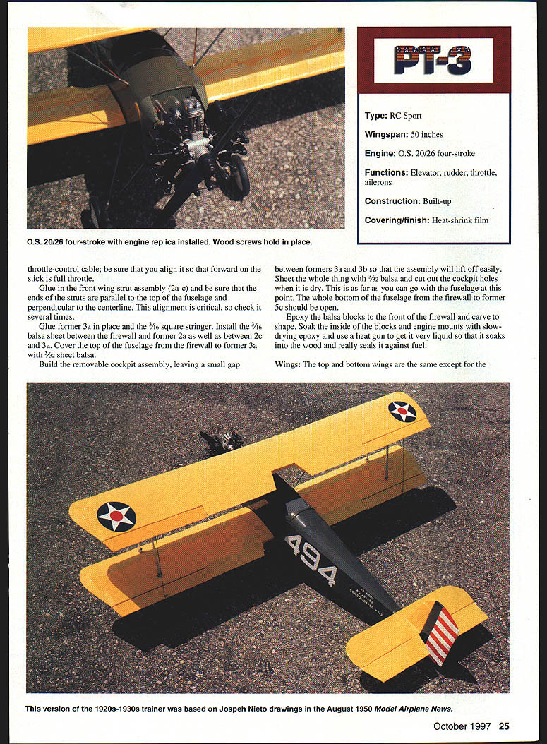 U Frank Baker PT-3 standard Army primary trainer late i920s early 1930s Its basic airframe Consolidated PT-i designed Ruben Fleet powered WW surplus Hispano-Suiza engine PT-i became PT-3 engine replaced reliable Wright Whirlwind 15 number small changes made allocated Approved Type Certificate #83 November 1928 PT-i hanging US Air Force Museum Dayton Ohio Experimental Aircraft Association process converting PT-ito PT-3 configuration plans Scale model enlarged very detailed set drawings Joseph Nieto August i950 Model Airplane News CONSTRUCTION Construction PT-3 pretty straightforward number things have done proper order Fuselage sides built over pians just like rubberpowered model area between top bottom longerons firewall station 6 medium hard 3A6 sheet Before joining fuselage sides make gas tank K&S 254 easy tin sheet long strip bent iines overlap soidered bend overlaps front piece soider Drill three 1/s diameter holes lay tank 3A6 piywood firewall mark hoies Solder three 1/ copper tubes gas tank left looking forward goes bottom tank other two vents Soidering back tank place pressure-test tank under water leaks Use epoxy giue maple motor mounts firewall coat front gas tank epoxy push three copper tubes through holes until tank hard against firewail Build front wing strut assembly diameter music wire front strut formers 2a-c center former 2b has cutout wing strut should snug fit music wire Coat both sides 2b epoxy place A6 formers 2a 2c either side Clamp whole assembly used bench vise make sure upper ends wire bottom former horizontal paraliel end result three-layer plywood sandwich wire strut embedded middle layer Place fuseiage sides top-down plans install fonners 3 4 Sc 3A6 square cross-pieces former 6 position Use carpenters square ensure sides vertical front fusciage square dry remove plans glue firewali assembly make cuts sides top bottom longerons former 6 just deep enough tail ends fuselage can glued Glue top bottom cross pieces formers 5b-9 instail stringers Aiso glue triangle pieces fuselage sides ends top bottom cross pieces station 6 Install servo rails 3A2 piywood aileron piate making sure fit particular servos sure aileron servo arm wheel does extend below bottom line fuselage Slide engine servo instail nylon tube 24 Model Aviation rottle-control cable sure align forward stick full throttle Glue front wing strut assembly 2a-c sure ends struts parallel top fuselage perpendicular centerline alignment critical check several times Glue former 3a place 3A6 square stringer Install /16 balsa sheet between firewall former 2a well between 2c 3a Cover top fuselage firewall former 3a 3A2 sheet balsa Build removable cockpit assembly leaving small gap between formers 3a 3b assembly will lift off easily Sheet whole thing /2 balsa cut out cockpit boles dry far can go fuselage point whole bottom fuselage firewall former 5c should open Epoxy balsa blocks front firewall carve shape Soak inside blocks engine mounts slowdrying epoxy use heat gun get very liquid soaks wood really seals against fuel Wings The top bottom wings same except October 1997 25 PT-S Type RC Sport Wingspan 50 inches Engine OS 20/26 four-stroke Functions Elevator rudder throttle ailerons Construction Built-up Covering/finish Heat-shrink film OS 20/26 four-stroke engine replica installed Wood screws hold place version 1920s-1930s trainer based Jospeh Nieto drawings August 1950 ModelAirplane News Cockpit area showing rear wing strut servo railsFuselage bottom showing landing gear aileron servo hatch rails Engine compartment engine mounting beamsRear fuselage construction stringers Lower wing strut fittings aileron control cable tubingExample aileron control tubing exits lower wing October1997 27 cutouts fuselage bottom wing has nylon tubes cables drive ailerons wing spars laminated 1/8 X ce balsa core square front spars 1/8 x building lower wing install glue ribs adjacent fuselage may need adjust later Note bottom aileron piece 1A6 sheet balsa Use small plane trim two balsa false spars ailerons match contour ribs Once basic wings complete cut appropriate dihedral breaks Glue plywood dihedral braces Fabricate 015 aluminum wing strut brackets bend according diagram plan Place piece /16 plywood open gap use drill press drill /32 bolt hole Use triangular file make two small notches side horizontal legs both sides brackets will held onto wing spars short pieces copper wire wrap around spar bracket twisted together inside wing Clip ends leaving about 2-3 turns fold down ends sure place proper bracket correct place Glue 1A6 balsa sheet around bracket will used anchor covering Install hinges wing ailerons use removable pin such Klett ailerons can covered easily Glue A6 balsa plates bottom wing aileron push cables like use Hobby Lobby bulk pack #HLH 805 nylon tube cable Unfortunately comes rolled up Cut nylon tube few inches longer will needed insert /i6 length music wire Use heat gun get tube hot around let cool Remove wire tube should reasonably straight repeat heating process careful melt tube Use 9/64 drill bit cut holes bottom wing ribs cable holes last two ribs before bottom plate should above front spar tube exits through balsa plate angle As approach ribs make holes little bit higher rib smooth path Bolt aileron horns A6 plywood plate aileron install ailerons Run cable through nylon tube tape end outer end aileron horn just get angle tube correct Once aligned use clear silicon RTV glue nylon tube place Completing Fuselage four components landing gear will fabricated next sure bend landing gear wires points indicated plans proper direction Use some pincher clothespins roughly assemble wires plywood parts Place components fuselage bends correct thing will hook up properly Use laminating process described front wing strut epoxy plywood music wire together Slide plywood sandwich fuselage check match wires can rebend bit clamping plywood sandwiches vise bending wire Make rear wing strut assembly using same technique old Free Fligh