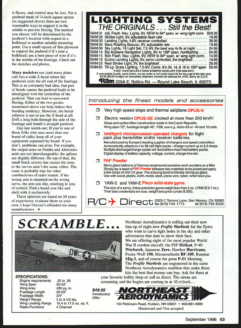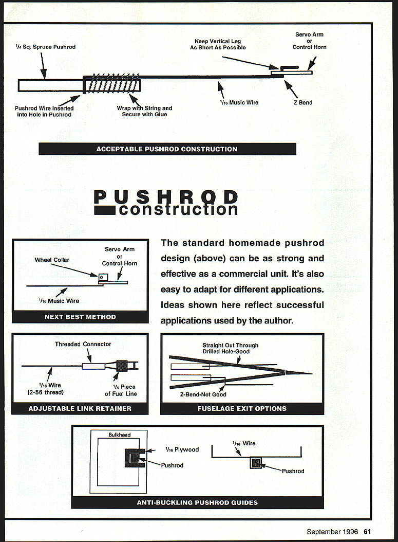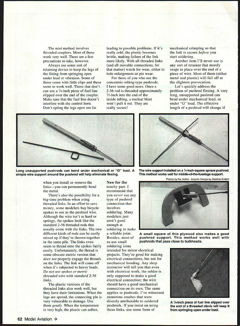 PUSIROD eepe m rs U IVAN MUNNINGHOFF Its obvious cant keep pushrods connected ervo end control-surface end theres going nasty mishap nearly ways secure pushrod ways put finish model Some methods work very well others less satisfactory Let start off disclaimer An article such may conceivably offend manufacturers pushrod keepers accessories Please keep mind following comments personal opinion therefore necessarily represent last word use suitability particular productthey simply reflect experience said lets cover some ways secure end pushrod Its important note its possible pushrod threaded device both ends rotate under just right vibration conditions slowly unwind fittings Admittedly its remote possibility Ive seen happen conclusion use threaded fittings both ends same pushrod unless some positive means prevent pushrod rotation small jam nut better nothing isnt necessarily foolproof Overall best pushrod end old-favorite Z bend cant unwind unless wire breaks no conceivable failure mode just works great bends can created small pair sturdy pliers commercially available devices designed make such bends Just keep vertical right-angle section short possible Perhaps next-best method 900 bend wire small wheel collar secure Most wire used pushrods 1A6 music wire sturdy enough installations important thing make absolutely certain collar tight servo arm short enough bring wire through servo side arm will capture wire between arm servo should collar fall off wire stays place 60 Model Aviation Sq Spruce Pushrod Servo Arm Keep Vertical Leg Short As PossibleControl Horn 1111111111 Pushrod Wire Inserted Hole Pushrod Wrap String Secure Glue 1/16 Music Wire Servo Arm Wheel CollaControl Horn V 1116 Music Wire standard homemade pushrod design above can strong effective commercial unit Its also easy adapt different applications Ideas shown reflect successful applications used author 4 1/16 Plywood ~Pushrod 1/ie Wire Pushrod September 1996 61 Z Bend Threaded Connector 1/161/4 Piece 2-56 threadof Fuel Line Straight Out Through Drilled Hole-Good nd-Not Good Bulkhead next method involves threaded couplers Most work very well few precautions take however Always use some sort retaining device keep legs fitting springing open under load vibration Some come little clips seem work well dont can use -inch piece fuel line slipped over end coupler Make sure fuel line doesnt interfere control horn Dont spring legs open too far leading possible problems its really cold plastic becomes brittle making failure link likely threaded links movable connections matter watch wear either hole enlargement pin wear use concentric-tubing-type pushrods have some good news Once 2-56 rod threaded approximately 1/2-inch end inside tubing nuclear blast wont pull out really secure mechanical crimping link secure before start soldering Another item Ill never use sort retainer merely snaps place over end piece wire Most either metal plastic will fall off slightest provocation Lets quickly address problem pushrod flexing very long unsupported pushrod can bend under mechanical load under U load effective length pushrod will change install remove linksyou can permanently bend metal Theres also possibility big-time problem using threaded links effort save money some modelers buy bicycle spokes use pushrod wire Although wire isnt hard springy spokes look like standard 2-56 threaded rods usually come links two different kinds rods can easily mixed up theyre thrown together same pile links seem thread onto spokes fairly easily Unfortunately thread some obscure metric version does properly engage threads links link will come off its subjected heavy loads use spokes metric threaded wire standard 2-56 links plastic versions threaded links also work well have limitations legs spread connecting pin very vulnerable damage Use gently temperature very high plastic can soften Now touchy part recommend never use type pushrod connection involves soldering modelers just arent good enough soldering make reliable joint Besides us use small soldering irons intended minor electrical projects Theyre good making electrical connections mechanical bonding Any shop instructor will tell electrical work solder supposed make good electrical connection wire should have good mechanical connection its own same applies pushrods Ive witnessed numerous crashes directly attributable soldered pushrods insist using links use some form 62 Model Aviation unsupported pushrods can bend under mechanical G load simple wire support around pushrod will help eliminate flexing wire support installed /4lqm spruce pushrod method works well middle-of-the-fuselage support small square thin plywood also makes good pushrod support method works well pushrods pass close bulkheads A-inch piece fuel line slipped over end threaded clevis will keep springing open under load flexes control may lost pushrod made -inch-square spruce suggested above two reasonable ways support middle prevent flexing method choose will determined pushrods location respect bulkhead another suitable mounting point Use small square thin plywood support pushrod its near bulkhead use bent piece wire its middle fuselage Check out sketches photos modelers use plans call wide Z-bend pushrods exits aft end fuselage extremely bad idea pair bends causes pushrod loads misaligned centerline pushrod can lead unwanted flexing Either two guides mentioned above can help reduce bending tendency However better solution use Z-bend Drill long hole through side fuselage install straight pushrod last watch-out youre folks uses brand radio keep equipment separated brand dont problems can arise example output arms Futaba Airtronics units interchangeable splines slightly different top small black screws secure arms servos arent same either same probably true other combinations radio brands wrong arm mounted wrong servo arm can slip resulting loss control Find brand like stick exclusively opinions based 30 years experience evaluate own hope havent offen