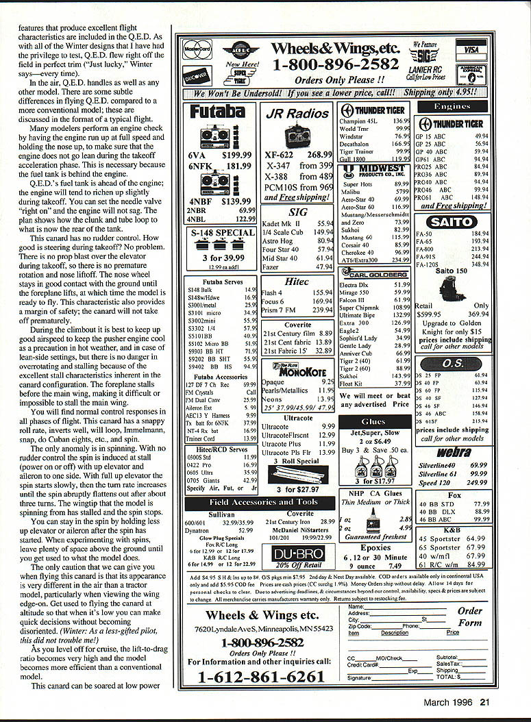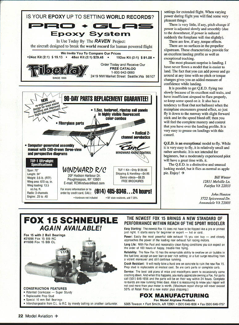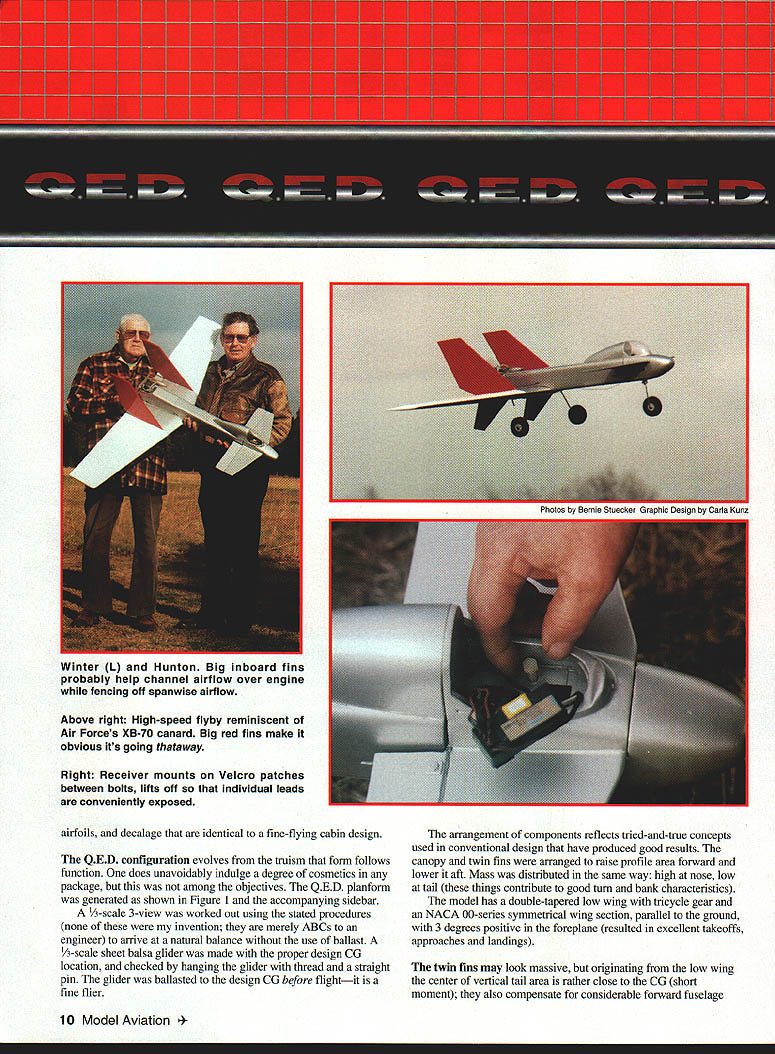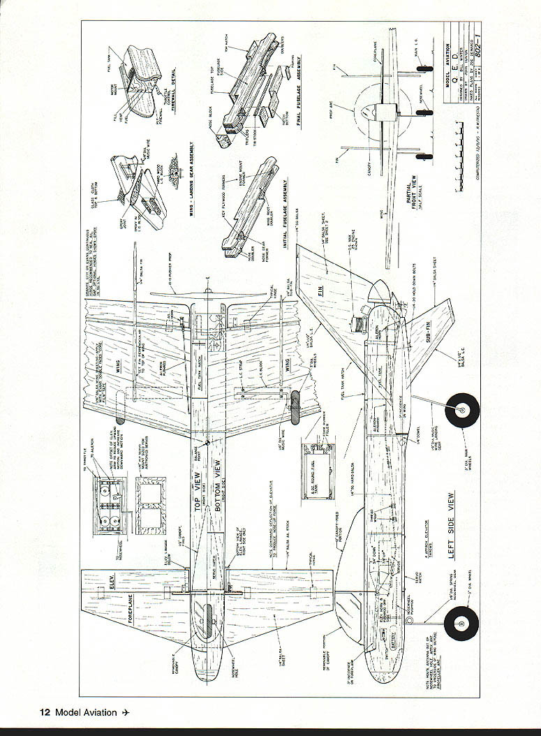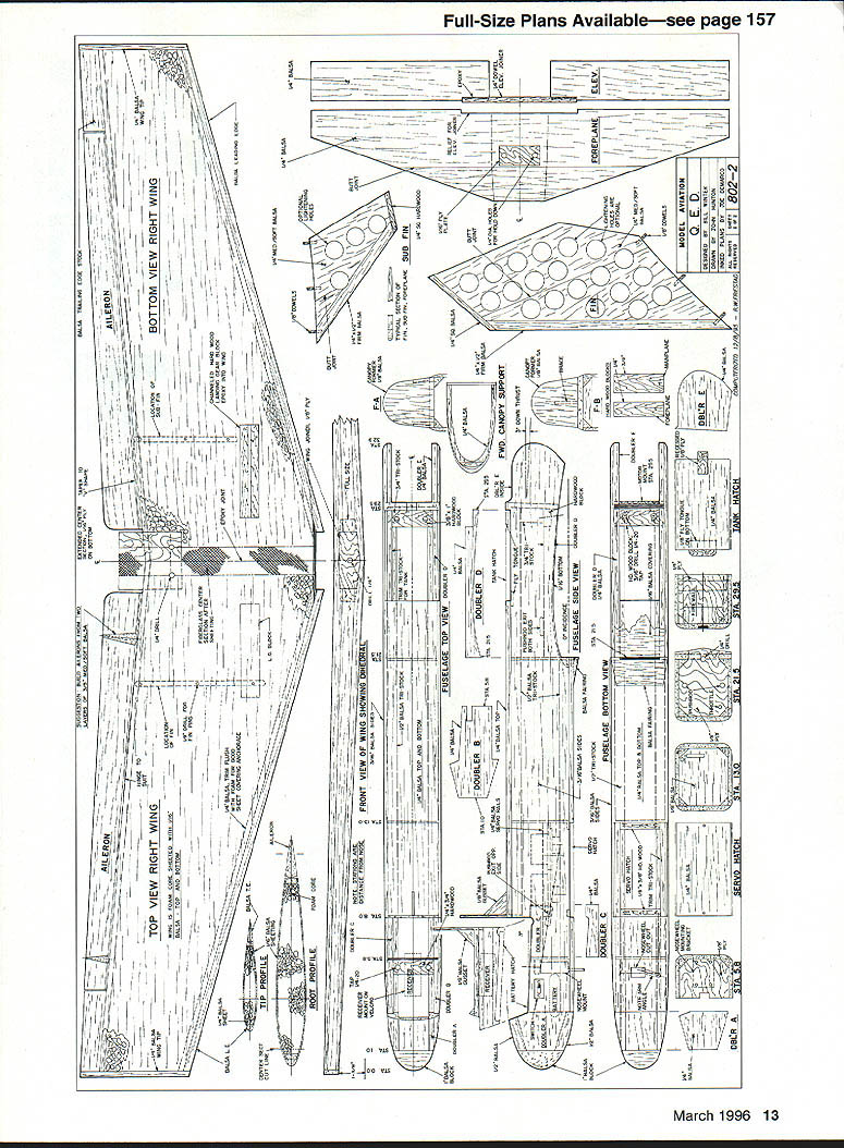NO OCR TEXT NO OCR TEXT Above right High-speed flyby reminiscent Air Forces XB-70 canard Big red fins make obvious its going thataway Right Receiver mounts Velcro patches between bolts lifts off individual leads conveniently exposed airfoils decalage identical fine-flying cabin design QED configuration evolves truism form follows function does unavoidably indulge degree cosmetics package among objectives QED planform generated shown Figure 1 accompanying sidebar -scale 3-view worked out using stated procedures invention merely ABCs engineer arrive natural balance use ballast 1/3-scale sheet balsa glider made proper design CG location checked hanging glider thread straight pin glider ballasted design CC before flightit fine flier arrangement components reflects tried-and-true concepts used conventional design have produced good results canopy twin fins arranged raise profile area forward lower aft Mass distributed same way high nose low tail things contribute good turn bank characteristics model has double-tapered low wing tricycle gear NACA 00-series symmetrical wing section parallel ground 3 degrees positive foreplane resulted excellent takeoffs approaches landings twin fins may look massive originating low wing center vertical tail area rather close CC short moment also compensate considerable forward fuselage 10 Model Aviation 4rnoros DV ernte ~uecer uraDnic uesian DV Aria runz Winter L Hunton Big inboard fins probably help channel airflow over engine fencing off spanwise airflow profile area large 12-inch canopy contributes turn excellence Tests hand-launched glider confirmed vertical area could reduced reduction stability Fins fenced propeller preferred over tip fins place closer centerline make less subject damage simplification rudder control used has missed nosewbeel steerable Downthrust 30 identical cabin model balsa-skinned foam wing used good airfoil accuracy strength easy building remainder model conventional built-up balsa Making model balance design CC anticipated problem because weight pusher engine fuel tank modest wing sweep used approximately 150 LE 30 TE center-wing cutout prop rejected too complex airplane still paper battery pack placed nose group four servos placed immediately behind foreplane proved balance system perfectly juncture Sig Manufacturing introduced Tri-Star canard Struck similarities methodology compared notes designer Ray Satterlee obtained advance kit its ingenious design flies very well Roys experience confirmed approach provided confirmation building QED prototype Figure 1 illustrates sequence steps used develop QED. drawing also arranged enable building quickie A-scale sheet balsa test glider should thrown hard like normal handlaunched gliders rather must released gently dead ahead velocity gauged duplicate its natural glide angle Figure 1 does imply canard different requiring determination Mean Aerodynamic Center its relation Wingspan 54 inches Flying Weight 4 lb 12 oz Engine OS 25 Functions Throttle aileron elevator nose wheel Construction Built-up Covering/finish Coverite 20th Century film paint March 1996 11 FIGI sTABLrry ACALYSIS OF 050 Nose wheel engine servos top left aileron servo bottom right elevator servo short pushrod horn outside fuselage six-ounce Du-Bro tank fully accessible typical hatch retained sides pieces foam Type RC Sport Canard FOR E P LANE HEHODOBLEI IlK # ILS0 TSHOEGHA TO GALTHTO IV HUNTFA02 BA QLHIH/1 FIREWALL DETAIL ITOP VIEWcE/ IRIGHT SlOE VIEW ITHOLY IBATE DOIAGDEAHD DEFLECT ON OPEEOGTORI TO PHOBUCE HOHE-OP TOTBA OIO HID I ILID ROLSO OIL TIOCEj\5C0HOLSO HOITCTTHTH OTTIT1OPTdIJ-- HOTTEHY-#____________________ -104-DO BIOS HOGS BOLTS HO FOHEELATE/ WING LANSING GEAR ASSEMBLY NOSE B OCEHONE DDE OP 1100 0LTBDHO FOBBEBSODE TOSW&ACGTI-l2rO 010 HOSE - HOOSLER~ no FORMERWING RHOT o AT11jHOJ ETS FINAL FUSELAGE ASSEMBLY INITIAL FUSELAGE ASSEMBLY / II PARTIAL FRONT VIEW ---- HOLT SCOLEHOBAWCEEL MUSEL AVIATION QED_ IIIIOEHIONEK HOSILL W NOAH INHEO PLOTS DT OE OEHOROO COBPCCIeOIZ0O 12OO5 RECTYIECOAO BEBERHEDI WA802 1 0 0 CD ESTION BUILDflYDEXTESBED CENTER TAPER BRBALSA TRAILING EDGE LAGERS GE SA WEE SOEr BALSASECTION LIA PLYD SHAPE AILERON --ci--=---_ _ __ I-___________IDA BALSA ____SAGE GE-Tor----Jfl3 WING TlP IDA BALSATOP VIEW RIGHT WING ED GRILLLGCAT1GS GEBOTTOM VIEW RIGHT WING ____ ___ii- WING SIPLOCATII WING IS EGUM CGAE SABErED WYRA VISGE PIN ES ASILL FOB4CENTER SECTTIP PROFILE SHARDS ONRONT VIEW OF WING SHOWING DIN A-VELCROoAASC BALSG SAGS ASLo -z1rg- -_---- ft D BALSA PSTSTOCID CRIB GEI-SCOCSGAS TRIGGECS I, 711 __________________ O TANS V-V--- 44 -ED BALSA COP ANG BArSOB ER BALSA —----- --- 0 --ED II SEC BASSWOODIDLOBALSA DOUBLER B__________ lAW BALSATOP EU DOWEL SERVO BAILSIEWBALSAELED JOINER F-AFORMER FUSELAIE TOP VIEW DROOLER LOR BALSA 7OGRUWOOD DOUBLER 0EBB IDA m___ISSIEWFWD CANOPY SUPPORT II______CANOED AR BALSA __C____GERBER ALOESIT BALSA SERVOSAlK GALNAIAUTSI-SSDCBOTA Al SDOCELES [iIIiIilIIIk~BALVUGURCIISIDED / ____________________________ DOUBLER C7USEE BMEWlAG -NI - lAG RALSASESILL ED DOROGER ___94B BALA DOERIBASTA 255 DBCRAERBASA08 R E I/AlAB PLY TONGUEI BALSA2_____________/ BOTTOM ST SSTA 295 HATCH JISERVO DUTCH DOTE GAR IK IARGSEB GSWDOD LT S qTA RRFRVO HATCH BATHVBAIEPPOR // ELEV I *xi LE I/ / -7K -S 7 415FLSP U5LJALLr PEROGA-I CN BELIEVE FRc* FRENCfFhPR FLJ-JE DUCK4DSURE Pr N N BILL WNTER& JOHN iUNION -L 0 0 CD 0 7NJi - BAL$I I k BALSA 4 BLA TOP TOCK ,/4SQ / I ji4MLBRSHT / / L - BILS BOTTOM - BiL5A models fly generally know experience CG MAC must located CONSTRUCTION Proper selection wood can provide easier construction considerable weight savings several balsa supply houses offer selected light wood small additional fee sure order wood actually need have ample supply select Wood thicknesses noted plans addressed text Use cyanoacrylate CyA glue general assembly Titebond slow-drying glue needed Fuselage fuselage basic box construction front rear Pin sides together cutting foreplane wing slots will identical La
