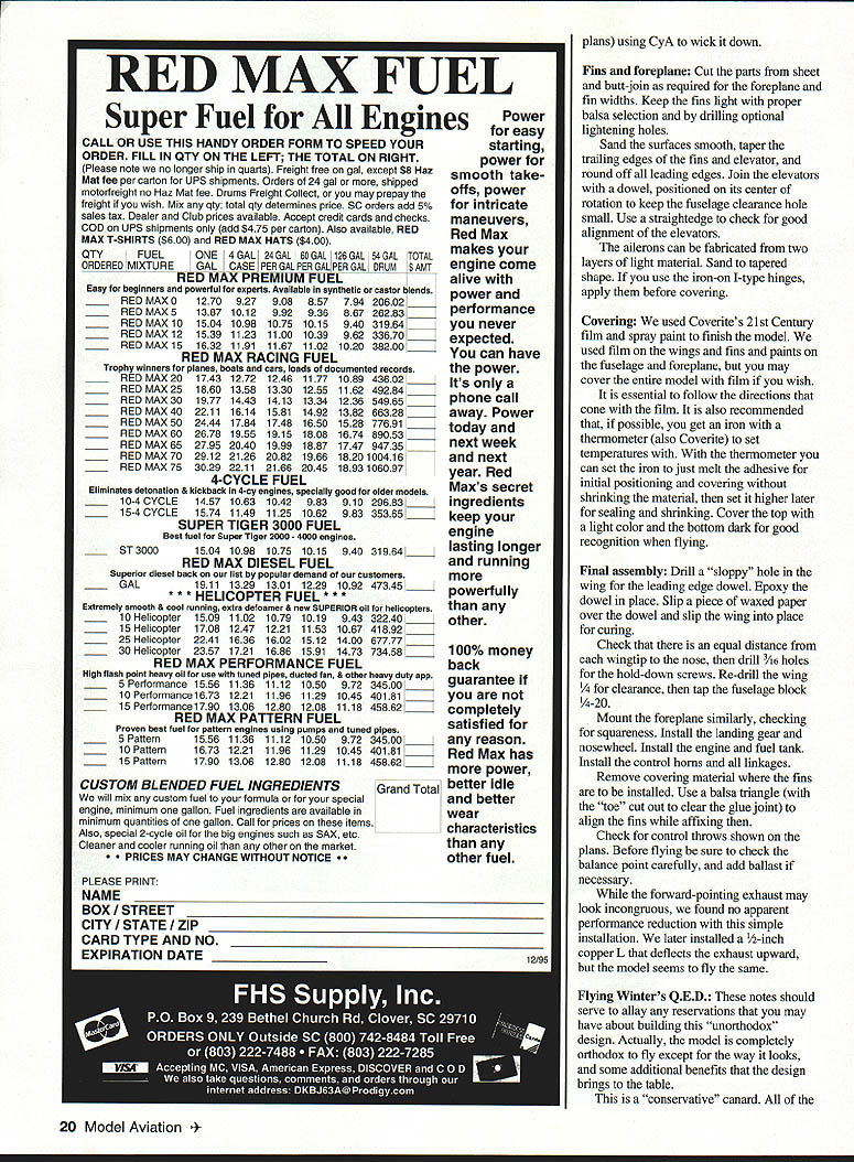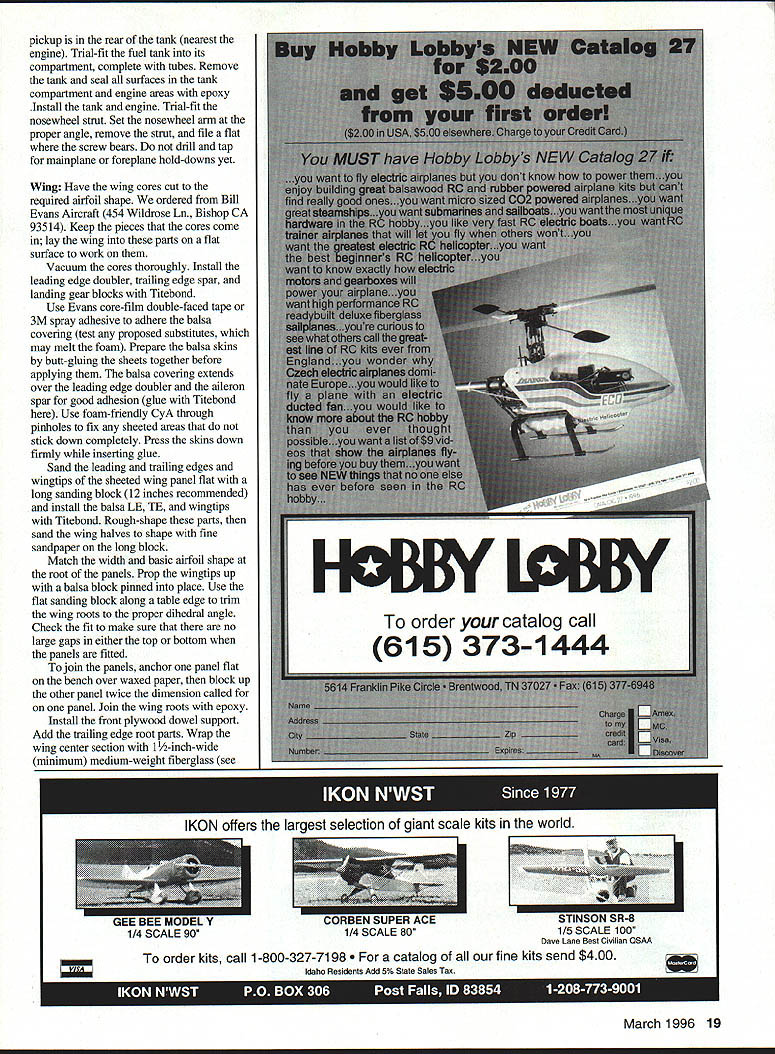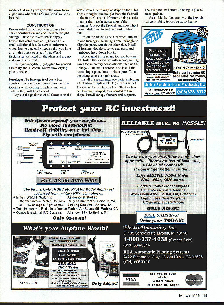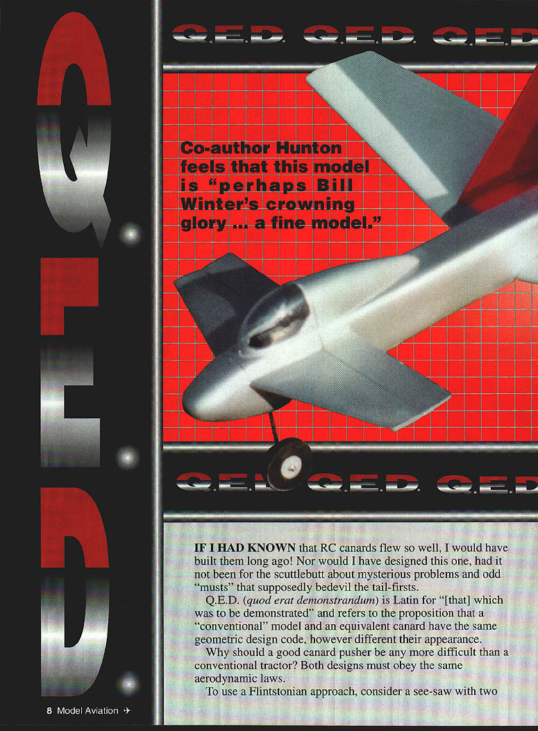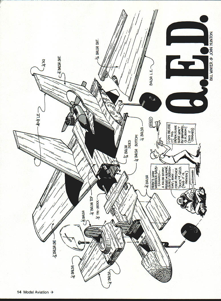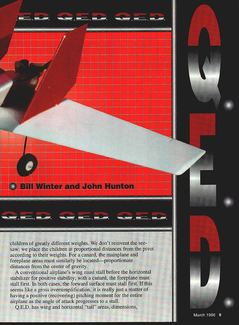 NO OCR TEXT NO OCR TEXT Above right High-speed flyby reminiscent Air Forces XB-70 canard Big red fins make obvious its going thataway Right Receiver mounts Velcro patches between bolts lifts off individual leads conveniently exposed airfoils decalage identical fine-flying cabin design QED configuration evolves truism form follows function does unavoidably indulge degree cosmetics package among objectives QED planform generated shown Figure 1 accompanying sidebar -scale 3-view worked out using stated procedures invention merely ABCs engineer arrive natural balance use ballast 1/3-scale sheet balsa glider made proper design CG location checked hanging glider thread straight pin glider ballasted design CC before flightit fine flier arrangement components reflects tried-and-true concepts used conventional design have produced good results canopy twin fins arranged raise profile area forward lower aft Mass distributed same way high nose low tail things contribute good turn bank characteristics model has double-tapered low wing tricycle gear NACA 00-series symmetrical wing section parallel ground 3 degrees positive foreplane resulted excellent takeoffs approaches landings twin fins may look massive originating low wing center vertical tail area rather close CC short moment also compensate considerable forward fuselage 10 Model Aviation 4rnoros DV ernte ~uecer uraDnic uesian DV Aria runz Winter L Hunton Big inboard fins probably help channel airflow over engine fencing off spanwise airflow profile area large 12-inch canopy contributes turn excellence Tests hand-launched glider confirmed vertical area could reduced reduction stability Fins fenced propeller preferred over tip fins place closer centerline make less subject damage simplification rudder control used has missed nosewbeel steerable Downthrust 30 identical cabin model balsa-skinned foam wing used good airfoil accuracy strength easy building remainder model conventional built-up balsa Making model balance design CC anticipated problem because weight pusher engine fuel tank modest wing sweep used approximately 150 LE 30 TE center-wing cutout prop rejected too complex airplane still paper battery pack placed nose group four servos placed immediately behind foreplane proved balance system perfectly juncture Sig Manufacturing introduced Tri-Star canard Struck similarities methodology compared notes designer Ray Satterlee obtained advance kit its ingenious design flies very well Roys experience confirmed approach provided confirmation building QED prototype Figure 1 illustrates sequence steps used develop QED. drawing also arranged enable building quickie A-scale sheet balsa test glider should thrown hard like normal handlaunched gliders rather must released gently dead ahead velocity gauged duplicate its natural glide angle Figure 1 does imply canard different requiring determination Mean Aerodynamic Center its relation Wingspan 54 inches Flying Weight 4 lb 12 oz Engine OS 25 Functions Throttle aileron elevator nose wheel Construction Built-up Covering/finish Coverite 20th Century film paint March 1996 11 FIGI sTABLrry ACALYSIS OF 050 Nose wheel engine servos top left aileron servo bottom right elevator servo short pushrod horn outside fuselage six-ounce Du-Bro tank fully accessible typical hatch retained sides pieces foam Type RC Sport Canard FOR E P LANE HEHODOBLEI IlK # ILS0 TSHOEGHA TO GALTHTO IV HUNTFA02 BA QLHIH/1 FIREWALL DETAIL ITOP VIEWcE/ IRIGHT SlOE VIEW ITHOLY IBATE DOIAGDEAHD DEFLECT ON OPEEOGTORI TO PHOBUCE HOHE-OP TOTBA OIO HID I ILID ROLSO OIL TIOCEj\5C0HOLSO HOITCTTHTH OTTIT1OPTdIJ-- HOTTEHY-#____________________ -104-DO BIOS HOGS BOLTS HO FOHEELATE/ WING LANSING GEAR ASSEMBLY NOSE B OCEHONE DDE OP 1100 0LTBDHO FOBBEBSODE TOSW&ACGTI-l2rO 010 HOSE - HOOSLER~ no FORMERWING RHOT o AT11jHOJ ETS FINAL FUSELAGE ASSEMBLY INITIAL FUSELAGE ASSEMBLY / II PARTIAL FRONT VIEW ---- HOLT SCOLEHOBAWCEEL MUSEL AVIATION QED_ IIIIOEHIONEK HOSILL W NOAH INHEO PLOTS DT OE OEHOROO COBPCCIeOIZ0O 12OO5 RECTYIECOAO BEBERHEDI WA802 1 0 0 CD ESTION BUILDflYDEXTESBED CENTER TAPER BRBALSA TRAILING EDGE LAGERS GE SA WEE SOEr BALSASECTION LIA PLYD SHAPE AILERON --ci--=---_ _ __ I-___________IDA BALSA ____SAGE GE-Tor----Jfl3 WING TlP IDA BALSATOP VIEW RIGHT WING ED GRILLLGCAT1GS GEBOTTOM VIEW RIGHT WING ____ ___ii- WING SIPLOCATII WING IS EGUM CGAE SABErED WYRA VISGE PIN ES ASILL FOB4CENTER SECTTIP PROFILE SHARDS ONRONT VIEW OF WING SHOWING DIN A-VELCROoAASC BALSG SAGS ASLo -z1rg- -_---- ft D BALSA PSTSTOCID CRIB GEI-SCOCSGAS TRIGGECS I, 711 __________________ O TANS V-V--- 44 -ED BALSA COP ANG BArSOB ER BALSA —----- --- 0 --ED II SEC BASSWOODIDLOBALSA DOUBLER B__________ lAW BALSATOP EU DOWEL SERVO BAILSIEWBALSAELED JOINER F-AFORMER FUSELAIE TOP VIEW DROOLER LOR BALSA 7OGRUWOOD DOUBLER 0EBB IDA m___ISSIEWFWD CANOPY SUPPORT II______CANOED AR BALSA __C____GERBER ALOESIT BALSA SERVOSAlK GALNAIAUTSI-SSDCBOTA Al SDOCELES [iIIiIilIIIk~BALVUGURCIISIDED / ____________________________ DOUBLER C7USEE BMEWlAG -NI - lAG RALSASESILL ED DOROGER ___94B BALA DOERIBASTA 255 DBCRAERBASA08 R E I/AlAB PLY TONGUEI BALSA2_____________/ BOTTOM ST SSTA 295 HATCH JISERVO DUTCH DOTE GAR IK IARGSEB GSWDOD LT S qTA RRFRVO HATCH BATHVBAIEPPOR // ELEV I *xi LE I/ / -7K -S 7 415FLSP U5LJALLr PEROGA-I CN BELIEVE FRc* FRENCfFhPR FLJ-JE DUCK4DSURE Pr N N BILL WNTER& JOHN iUNION -L 0 0 CD 0 7NJi - BAL$I I k BALSA 4 BLA TOP TOCK ,/4SQ / I ji4MLBRSHT / / L - BILS BOTTOM - BiL5A models fly generally know experience CG MAC must located CONSTRUCTION Proper selection wood can provide easier construction considerable weight savings several balsa supply houses offer selected light wood small additional fee sure order wood actually need have ample supply select Wood thicknesses noted plans addressed text Use cyanoacrylate CyA glue general assembly Titebond slow-drying glue needed Fuselage fuselage basic box construction front rear Pin sides together cutting foreplane wing slots will identical La