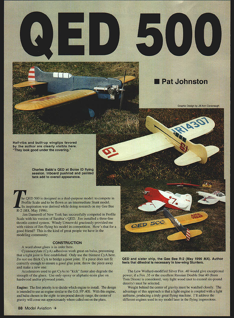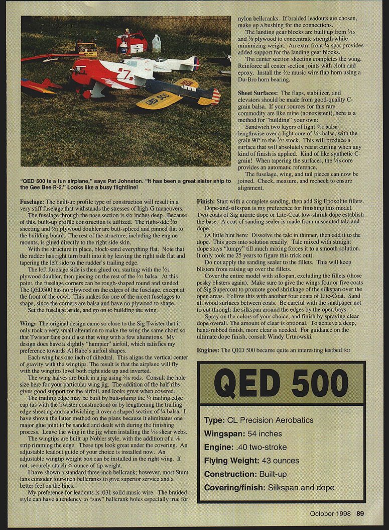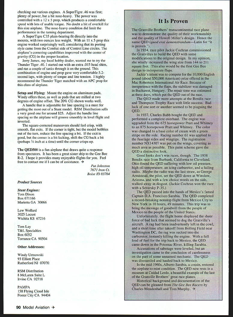NO OCR TEXT NO OCR TEXT checking out various engines SuperTigre 46 first plenty power bit nose-heavy power controlled 12 x 5 prop produces comfortable speed lots usable torque No doubt bit overkill size airplane nose-heavy condition did limit performance turning department Superigre C35 plain-bearing fit directly mounts two ounces less weight 11 x 5 prop engine worked surprisingly well considering its porting style came Combat side Control Line circles airplanes cornering capabilities improved center gravity CC proper location Jerry James local hobby dealer wanted try Thunder Tiger 40 started out extra 015 head shim ran couple tanks through ground combination engine prop gave very comfortable 52second laps plenty torque line tension highly recommend Thunder Tiger matched APC prop class airplane Setup Flying Mount engine aluminum pads Windy offers well pads milled two degrees engine offset 20% CC shown works well handle adjustable line spacing must getting out Stunt model RSM Distribution sells very good around $25 Adjust handle line spacing airplane will groove smoothly level flight inverted square-cornered maneuvers should feel crisp smooth flat exits corner tight model bobbles out turn reduce line spacing bit exit good corner bit lacking shift CC back bit perhaps /s inch time until corner crisps up QED500 fun airplane draws quite response spectators has great sister ship Gee Bee R-2 hope provides enjoyable flights Feel free contact can assistance Johnston 7671 Iron Ct Boise ID 83704 Product Sources Stunt Engines Tom Dixon Box 671166 Marietta GA 30066 Lew Wollard 3025 Locust Wichita KS 67216 Tom Lay T&L Specialties Box 6052 Torrance CA 90504 Other Addresses Windy Urtnowski 93 Elliott Place Rutherford NJ 07070 RSM Distribution 8 McLaren Suite L Irvine CA 92718 PAMPA 158 Flying Cloud Isle Foster City CA 94404 90 Model Aviation ARE HOLD OP FRUW 1/16 CORE WISH 1/A LAMINATED UN RUAR SIDES OHIO WILL ALOW NORM FUR RAE LEADUDO UDACS RIM THE DIP WIOR 1/lA EU AID IN COVERING 1/16 YIP GUSSETS 0/N DO DF MNIDWY ON OUDBDARO RIDHD RANG SHEER HENS DRAILING EDGE SALEDING 1/4 B 3/N SHAPED DRAILING EDGE CAPMAIN RIBS HAKE 16 1/lA SHEAH HENS Lj-L MRIN ARI F RIBS RARE IA AL RINS 1/16 8USD 1E YL 3L TENSES SECRIUB RIBS MAKE S 1/A LIGAD BALSA FLUFY AYE C CR015 IF AGAS USE I/C SYU NORCHES IS ONE SLY UNY 1/2 SQUARE CROING EDGE 1/4 SOJARE SPARS PLYWOOD NEL [CRANK MOLNY 11r U L/D BLOCKS NUILD DP FROM[I 1/16 AND 1/N PTWOUU JIII 1/4 SQUARE C/C SPAN BOYDUM UNLY ____IL NA YE 1 AJILD WINGS EQUAL SPAN 3/30 WIRE OJBRO REARING 1/H SCOUNE SCRAP FUR NINGE POCKLIS 1/U AGED ORESA STABILIRER RNB ELERA 11100 [IOU C GRAIN IF ARAILARLE 11-IIK OPTIONAL MEDNUS DY PRODUCING CDRAIN BALSA 1/16 RASF~3O BALSA UNINUDE YHC 3/32 BALSA OVER ONE 1/lA CENTER SECDIUNROLSA DRE l/lN BRSA IS PLACED CROSS RULE RIBSGRAINBE CAREFUL SO CHOOSE ACHY LIGHY MAKF BAULSA DO CUNYRUL THE OVERALL HEIGHT BUILD RH REDDER FLAY ORE RISRY SIDE II o/ 3/OR 1/0 MAPLE1/B RARE GEAR-/ /1 0 oTRANDER TIGER NO1/16 PLY GEAR DOURS OS RUFPS/URETER BRASS CLIPS DR I/B ED Cr LE SDAA BRRYTBOR GEAR DARNS WIDO COUNTERSUNK BAILS VERY LIGHT IN THE RAIL/NHO SLUTTEB CRP SCREWS RD KEEP TRE DC IN THE CORRECT 7 QITD5OO3/32 BALSA SIDES POSITION OBTAIN 0540s FIHRMI 6DM DIRON R PAY JUANSTON PR BOA 601166 3 LIURT HEIGND SS/35AO ENAIRES MARIETTA GA TRUNK WREELS43 oz M/ THUNDER RIDER RU