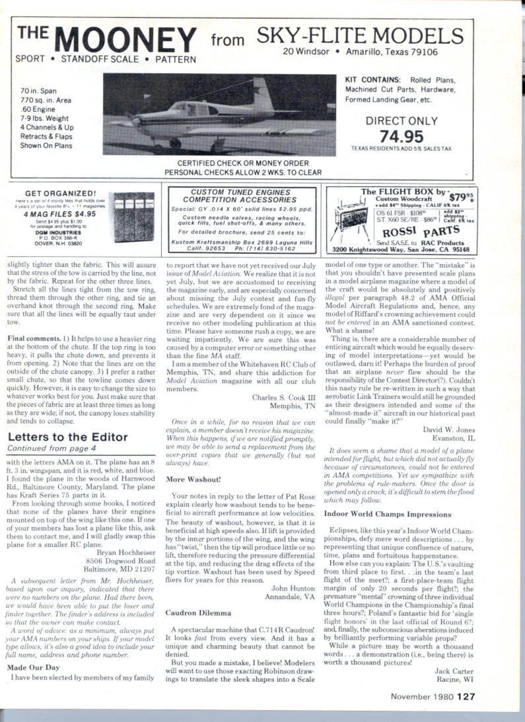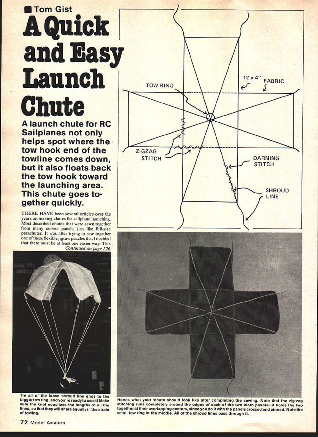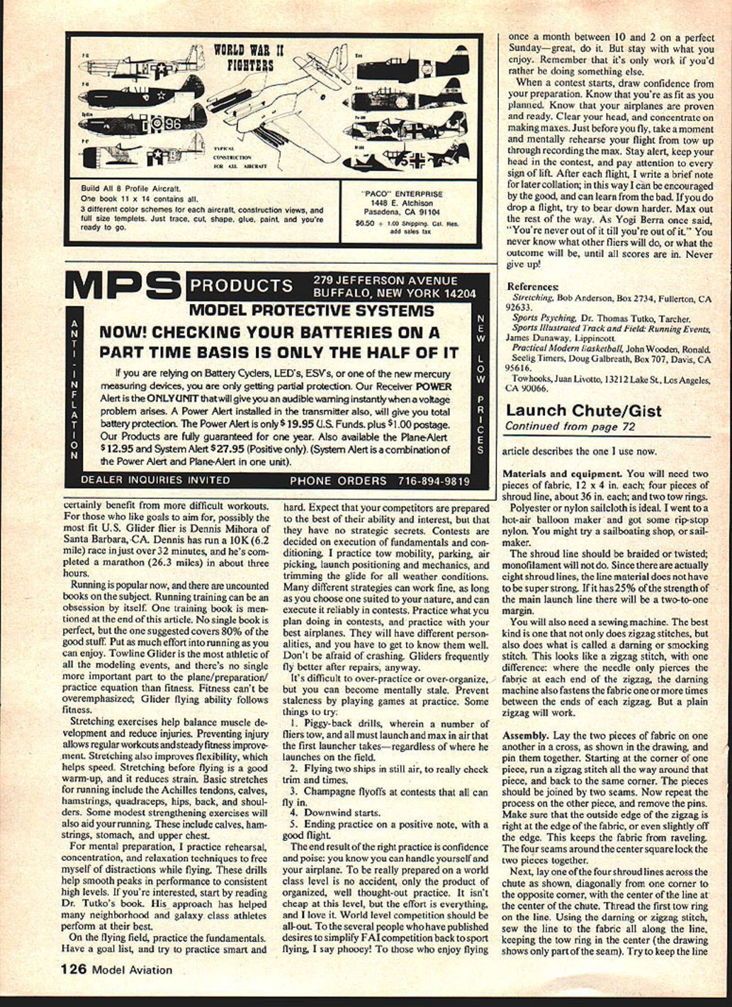 STom Gist AQuick Easy Launch Chute launch chute RC Sailpianes helps spot tow hook end towline comes down also floats back tow hook toward launching area chute goes gether quickly THERE HAVE several articles over years making chutes sailplane launching Most described chutes sewn together curved panels just like full-size parachutes after trying sew together ofthese flexible jigsaw puzzles decided must least easier way nn tinned nn r f TOW RING ZIGZAG STITCH 12 x 4 FABRIC 4 S N DARNING / STITCH SHROUD LINE 72 Model Aviation loose snroud line ends Diggersow ring youre readyto use Make sure knot equalizes lengths lines sothastheywill share equally strain towing nere e worn cnuse snouio lOOK IIK aster compiesing tne sewing zig-zag stitching runs completely around edges of two cloth panelsit holds two together overlapping centers since panels crossed pinned Note small tow ring middle shroud lines pass through Build 8 Profile Aircraft ENTERPRISE book 11 14 contains 8 E Atchison 3 different color schemes aircraft construction views Pasadena CA 91104 full size templets Just trace cut shape glue paint youre$650 5hppin5 Cal Rex ready goadd sales tax MPS uJ IUIUI S MODEL PROTECTIVE SYSTEMS NOW CHECKING YOUR BATTERIES ON PART TIME BASIS IS ONLY THE HALF OF IT relying Battery Cyclers LEDs ESVs new mercuty measuring devices getting partial protection Receiver POWER Alert ONLY UNIT will give audible wammg instantly witen voltage problem arises Power Alert installed transmitter also will give total battery protection Power Alert $1995 us Funds plus $100 postage Products fully guaranteed year Also available PlaneAlert $1295 System Alert $2795 Positive System Alert isa combination Power Alert PlaneAlert unit certainly benefit difficult workouts like goals aim possibly moat fit US Glider flier Dennis Mihora Santa Barbara CA Dennis has run 10K 62 mile race just over 32 minutes hes com pleted marathon 263 miles about three hours Running popular now uncounted books subject Running training can obsession itself training book men tioned end article No single book perfect suggested covers 80% good stuff Put much effort running can enjoy Towline Glider athletic modeling events theres no single important part plane/preparation practice equation fitness Fitness cant overemphasized Glider flying ability follows fitness Stretching exercises help balance muscle de velopment reduce injuries Preventing injuty allows regular workouts steady fitness improve ment Stretching also improves flexibility helps speed Stretching before flying good warm-up reduces strain Basic stretches running include Achilles tendons calves hamstrings quadraceps hips back shoul ders Some modest strengthening exercises will also aid running include calves ham strings stomach upper chest mental preparation practice rehearsal concentration relaxation techniques free myself distractions flying drills help smooth peaks performance consistent high levels youre interested start reading Dr Tutkos book approach has helped neighborhood galaxy class athletes perform best flying field practice fundamentals Have goal list try practice smart hard Expect competitors prepared best ability interest have no strategic secrets Contests decided execution fundamentals con ditioning practice tow mobility parking air picking launch positioning mechanics trimming glide weather conditions different strategies can work fine long choose suited nature can execute reliably contests Practice what plan doing contests practice best airplanes will have different person alities have get know well Dont afraid crashing Gliders frequently fly better after repairs anyway Its difficult over-practice over-organize can become mentally stale Prevent staleness playing games practice Some things try 1 Piggy-back drills wherein number fliers tow must launch max air first launcher takesregardless launches field 2 Flying two ships still air really check trim times 3 Champagne flyoffs contests can fly 4 Downwind starts 5 Ending practice positive note good flight end result right practice confidence poise know can handle yourself airplane really prepared world class level no accident product organized well thought-out practice isnt cheap level effort everything love World level competition should all-out several people have published desires simplify FAI competition back sport flying say phooey enjoy flying once month between 10 2 perfect Sundaygreat stay what enjoy Remember its work youd rather doing something else contest starts draw confidence preparation Know youre fit planned Know airplanes proven ready Clear head concentrate making maxes Just before fly take moment mentally rehearse flight tow up through recording max Stay alert keep head contest pay attention sign lift After flight write brief note later collation way can encouraged good can learn bad drop flight try bear down harder Max out rest way As Yogl Berra once said Youre never Out till youre out never know what other fliers will what outcome will until scores Never give up Reference Stretching Bob Anderson Box 2734 Fullerton CA 92633 Sports Psyching Dr Thomas Tutko Tarcher Sports Illustrated Track Field RunningEvents James Dunaway Lippincott Practical Modern liasketball John Wooden Ronald Seclig Timers Doug Gaibreath Box 707 Davis CA 95616 Towbooks Juan Livotto 13212 take Sr Los Angeles CA 90066 Launch Chute/Gist Continued page 72 article describes use now Materials equipment will need two pieces fabric 12 x 4 four pieces shroud line about 36 two tow rings Polyester nylon sailcloth ideal went hot-air balloon maker got some rip-stop nylon might try sailboating shop sailmaker shroud line should braided twisted monofilament will Since actually eight shroud lines line material does have super strong has 25% strength main launch line will two-to-one margin will also need sewing machine best kind does zigzag stitches also does what called darning smocking stitch looks like zigzag stitch difference needle pierces fabric end zigzag darni