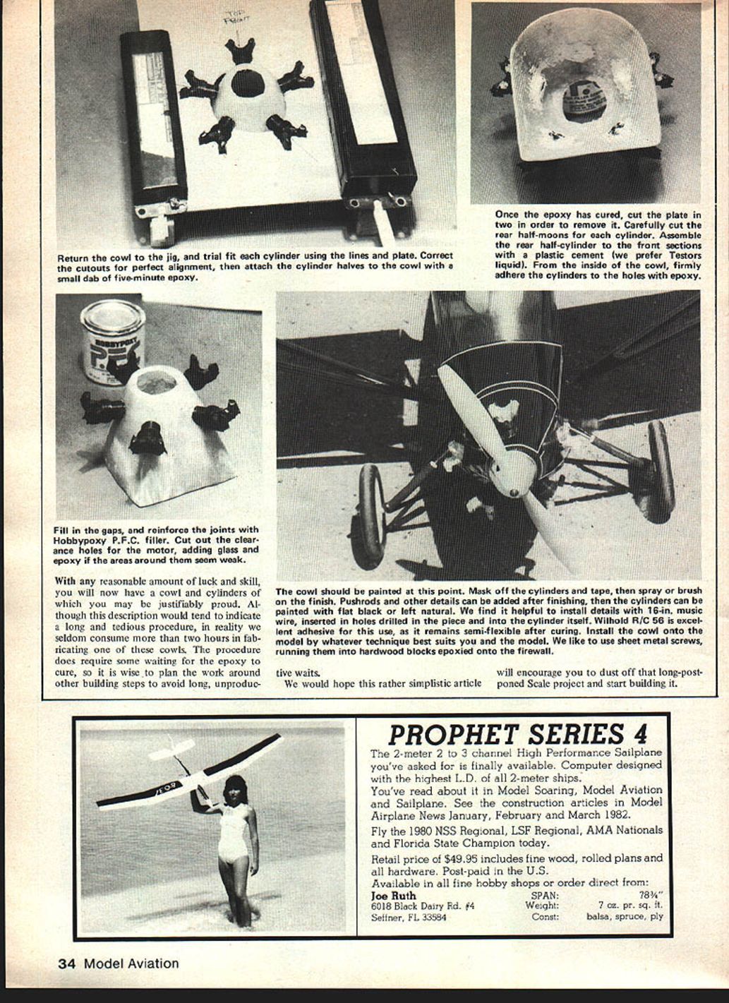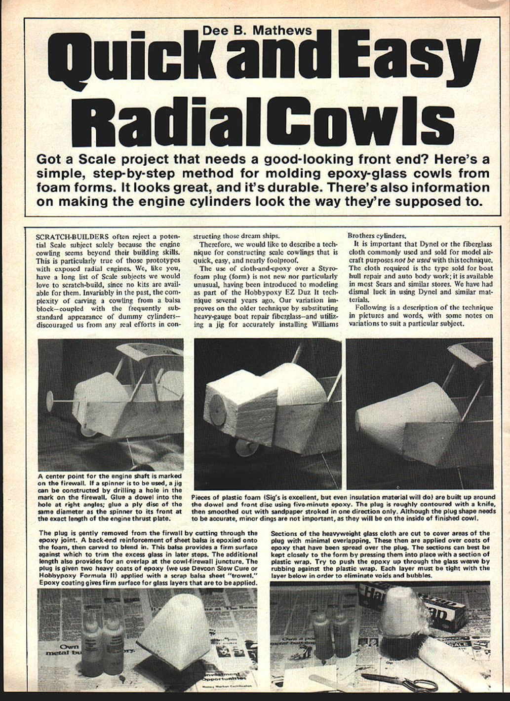 I adial Mathe nd Got Scale project needs good-looking front end Heres simple step-by-step method molding epoxy-glass cowls foam forms looks great its durable Theres also information making engine cylinders look way theyre supposed SCRATCH-BUILDERS often reject poten tial Scale subject solely because engine cowling seems beyond building skills particularly true prototypes exposed radial engines like have long list Scale subjects would love scratch-build since no kits avail able Invariably past com plexity carving cowling balsa blockcoupled frequently sub standard appearance dummy cylinders discouraged us real efforts constructing dream ships Therefore would like describe tech nique constructing scale cowlings quick easy nearly foolproof use cloth-and-epoxy over Styro foam plug form new nor particularly unusual having introduced modeling part Hobbypoxy EZ Duz tech nique several years ago variation im proves older technique substituting heavy-gauge boat repair fiberglassand utiliz ing jig accurately installing Williams Brothers cylinders important Dynel fiberglass cloth commonly used sold model air craft purposes used technique cloth required type sold boat hull repair auto body work available Sears similar stores have dismal luck using Dynel similar mat terials Following description technique pictures words some notes variations suit particular subject center point tor engine stiaft marked firewall spinner used jig can constructed drilling hole mark firewall Glue dowel Pieces plastic foam Sigs excellent insulation material will built up around hole right angles glue ply disc the dowel front disc using five-minute epoxy plug roughly contoured knife same diameter spinner its front smoothed out sandpaper stroked direction Although plug shape needs exact length engine thrust plate accurate minor dings important will inside finished cowl plug gently removed firwall cutting through epoxy joint back-end reinforcement sheet balsa epoxied Onto foam carved blend balsa provides firm surface against trim excess glass later steps additional length also provides overlap cowl-firewall juncture plug given two heavy coats epoxy use Devcon Slow Cure Hobbypoxy Formula Ill applied scrap balsa sheet trowel Epoxy coating gives firm surface glass layers applied Sections heavyweight glass cloth cut cover areas plug minimal overlapping applied over coats epoxy have spread over plug sections can best kept closely form pressing place section plastic wrap Try push epoxy up through glass weave rubbing against plastic wrap layer must tight layer below order eliminate voids bubbles U large least 12-in balloon used step Apply thick coat epoxy over surface particularly nose balloon will tend roll some epoxy toward back balloon inflated pushed down over plug now wet epoxy certain inner face balloon ex tends below bottom plug Slowly deflate balloon pushed down mak ing certain pulls under bottom edge plug inflated balloon spreads epoxy evenly gives smooth surface After epoxy completely cured remove balloon stripping off Should areas glass completely covered epoxy unlikely unless too little used repeat previous step Minor holes voids can filled Hobbypoxy PFC filler sanded smooth Front back views shown stage point will have surprisingly satisfactory cowl Should using technique subject does have ex posed cylinders cowl ready painting epoxy polyurethane dope com pletely fuel proof remarkably strong yet very light roomy Cut section foam board cardboard large enough clear perimeter cowl several inches Mark center using 180-deg protractor divide circum ference number required sections other words three-cylinder engine used divide plate three 120-deg slices five cylinders 72 deg 360 deg di vided five equals 72 deg etc Draw line center mark through outer marks lines used align rslmndor haiac Cylinders stallation dummy cylinders can frustrating ex perience Attempt ing eyeball positions virtually impossible ria bly producing cylin ders out position unsight ly The fact Williams Brothers cylinders sup plied halves can converted advantage Heres Cut out center plate allow pass over cowl front Position plate blocks level mid-line cy linders Obviously important plate parallel cowl back order cylinders same vertical plane position should checked ruler shims should used needed Position unassembled cylinder halves line marks long axis Mark half-circle cylinder onto fiberglass using Magic Marker pencil Remove cowl cut out half-moons cylinder half carbide CEnSOr srtramnh hand, hara h.t itnifa flip will uffiea liepeat previous step until areas nave least three layers glass-epoxy Areas holes will cut such motor intake will require fourth layer strength Overhanging glass can cut away edges scissors metal shears Fill coffee can similar gasoline Cut away ply front disc balsathen immerse cowl foam will back plate carbide cutter Dremeldissolve liquid can flushed out Moto Tool knife filewith additional gasoline WARNING residue step toxic should discarded sealed container landfill AND THE PROCESS SHOULD BE DONE OUTDOORS Under no circumstances should foam dissolved closed space disposable rubber gloves should used avoid skin contact After dissolving foam interior cowl may rough spiney can sanded smoothed after gasoline vaporizes tive waitswill encourage dust off long-postWe would hope rather simplistic articleponed Scale project start building 34 Model Aviation Return cowl sne jig trial fit cylinder using lines plate Correct cutouts perfect alignment attach cylinder halves cowl small dab five-minute epoxy Once epoxy has cured cut plate two order remove Carefully cut rear half-moons cylinder Assemble rear half-cylinder front sections plastic cement prefer Testors liquid inside cowl firmly adhere cylinders holes epoxy Fill gaps reinforce joints Hobbypoxy PFC filler Cut out clear ance holes motor adding glass epoxy areas around seem weak reasonable amount luck skill will now have cowl cylinders cowl should painted point Mask off cylinders tape spray brush may