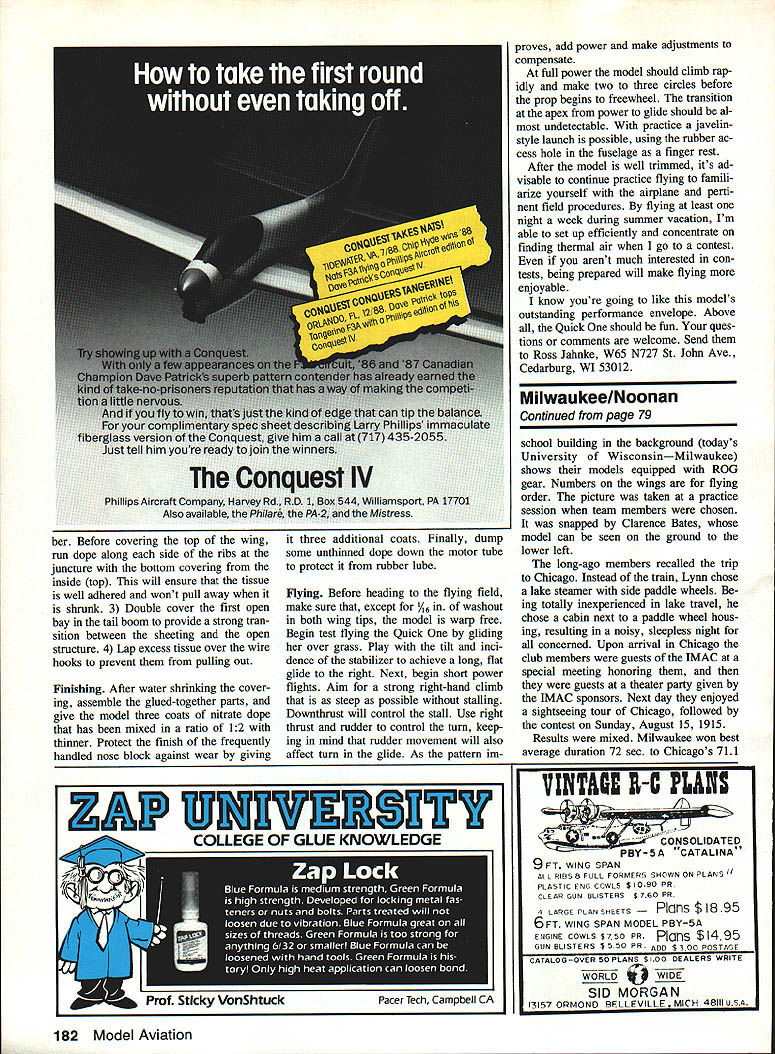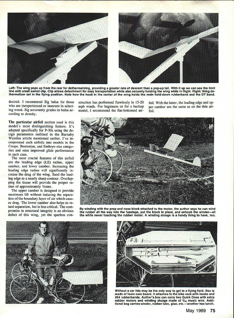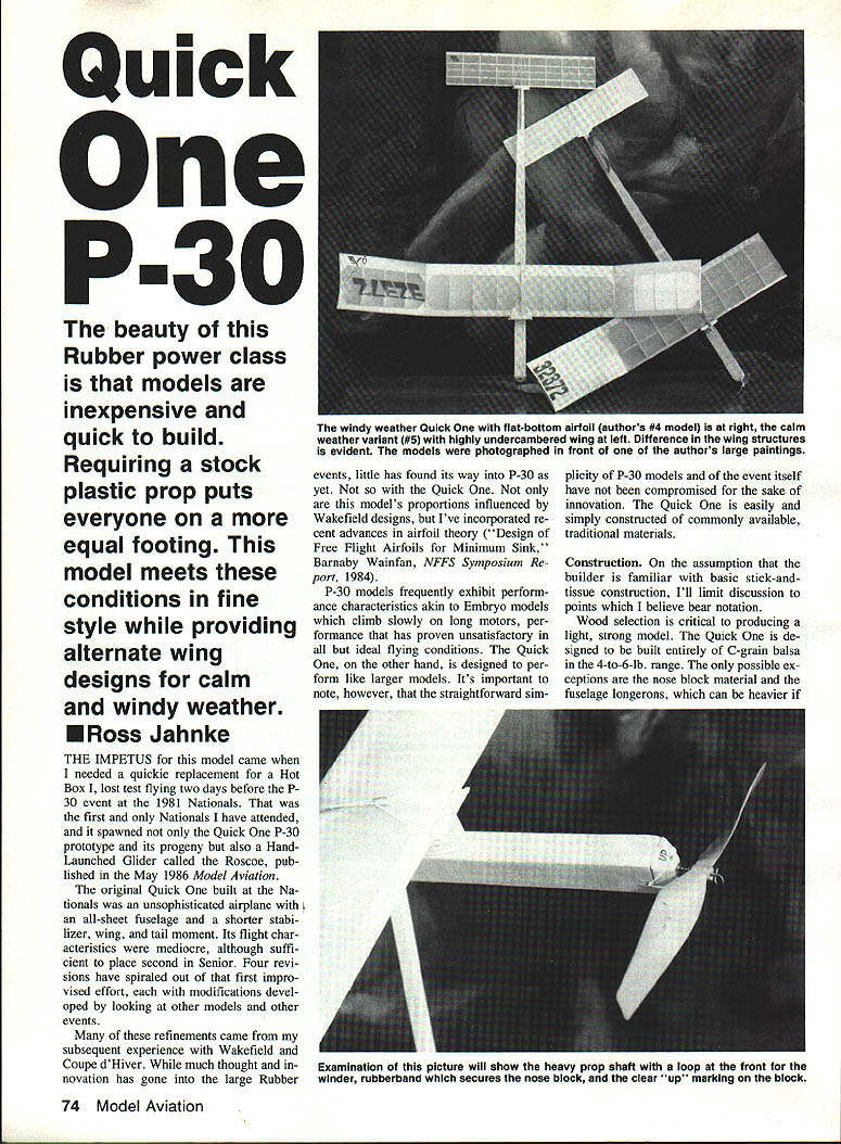 Quick beauty Rubber power class models inexpensive quick build Requiring stock plastic prop puts everyone equal footing model meets conditions fine style providing alternate wing designs calm windy weather ERoss Jahnke THE IMPETUS model came needed quickie replacement Hot Box lost test flying two days before P 30 event 1981 Nationals first Nationals have attended spawned Quick P-30 prototype its progeny also HandLaunched Glider called Roscoe pub lished May 1986 Model Aviation original Quick built Na tionals unsophisticated airplane all-sheet fuselage shorter stabi lizer wing tail moment Its flight char acteristics mediocre although suffi cient place second Senior Four revi sions have spiraled out first impro vised effort modifications devel oped looking other models other events refinements came subsequent experience Wakefield Coupe dHiver much thought novation has gone large Rubber events little has found its way P-30 yet Quick models proportions influenced Wakefield designs Ive incorporated re cent advances airfoil theory Design Free Flight Airfoils Minimum Sink Barnaby Wainfan NFFS Symposium Re port 1984 P-30 models frequently exhibit perform ance characteristics akin Embryo models climb slowly long motors per formance has proven unsatisfactory ideal flying conditions Quick other hand designed per form like larger models Its important note however straightforward sim plicity P-30 models event itself have compromised sake innovation Quick easily simply constructed commonly available traditional materials Construction assumption builder familiar basic stick-andtissue construction Ill limit discussion points believe bear notation Wood selection critical producing light strong model Quick de signed built entirely C-grain balsa 4-to-6-lb range possible ex ceptions nose block material fuselage longerons can heavier 74 Model Aviation P-30 windy weather Quick flat-bottom airfoil authors #4 model right calm weather variant #5 highly undercambered wing left Difference wing structures evident models photographed front authors large paintings Examination picture will show heavy prop shaft loop front winder rubberband secures nose block clear up marking block Left The wing pops up rear dethermalizing providing greater rate descent pop-up tail up can see limit line small swivel clip Clip allows detachment easy transportation also securely holding wing flight Right Wing de thermalizer set flying position Note hook center wing holds main hold-down rubberband DT band desired recommend Sig balsa struction has performed flawlessly 15-20 foil latter leading edge upwho inexperienced insecure select- mph winds beginners backup per camber same thin air ing wood Sig accurately grades its balsa ac- model recommend flat-bottomed air- foil cording density particular airfoil section used models distinguishing feature Its adapted specifically P-30s using de sign parameters outlined Barnaby Wainfan article mentioned earlier Ive corporated such airfoils models Coupe Bostonian Embryo size catego ries seen improved glide performance case crucial features airfoil leading edge LE radius upper camber lower camber Increasing leading edge radius will significantly crease drag wing Sand lead ing edge nearly sharp contour Overlap ping tissue will provide proper ra dius approximately mm upper camber designed provide maximum lift inducing separa tion boundary layer air caus es drag lower camber also helps re tard separation less critical com promise structural integrity obvious defect wing yet sparless conBy winding prop nose block attached motor author says can wind rubber way fuselage put block place unhook winderall never touching rubber motor winding stooge handy thing have too Without car may way get flying field Box made foam core board attaches bike rack hooks #64 rubberbands Authors box can carry two Quick Ones extra rubber motors winding stooge made c wire Addi tional bag carries winder rubber lube glue etcanother has lunch May 1989 75 Ce QUICK ONE P30 SODS tOSS 4RSNC WOO 025 57 JOHN AVA CSDSARG5502 II Li Li i 0 0 Li C LiI 2 ii ii F F] EL ii Li II CA E 0 LiA ~jLi Li Li Li Li Li J Li i I -I Building wing quite simple sure notch leading trailing edges prior construction Doing greatly increases contact area glue joints adding considerable strength cut off wing tips dihedral break carefully sand LE TE fit together form proper dihedral angle Since wing 32 long least 4 dihedral required under tip bring pro jected span down 30 Fuselage judgment good fuselage must satisfy four criteria First must sufficiently durable both structure its componentsnose dethermalizer DT wing mounts etcperform reliably predictably several seasons Sec ond its weight must distributed well eliminate need ballast Third fu selage must have tough motor tube able withstand motor breakage torque Fourth must have trustworthy dether malizer will work 100% time bring model down first official flight P-30 Nats lasted over seven min utes stab DTed fuselage model designed nose heavy allow wing po sitioned farther forward center-ofgravity near center rubber motor cross-grained sheeting motor tube helps shift weight ward its also rigid resistant break age motor should blow type construction standard Wakefields before rolled tubes came use make sheeting cut sheet A2 x 3-in balsa 4-in lengths glue side side After drying carefully cut assembly four strips two 5A6and 1-in widths Make some extra sheeting build pylon nose block critical mechani cal soundness model Too often m sufficient attention paid construction nose block resulting inconsistent flights constant readjustment fore stall problems use harder wood block minimize wear chose /16 music wire prevent bent prop shafts brass wire soldered front bearing keep pushing out block model comes down nose first DTed stout front end war ranted Since winding model often awk ward chore particularly heat com petition used winding loop front shaft also suggest clearly marking keying top nose block en sure its always insert