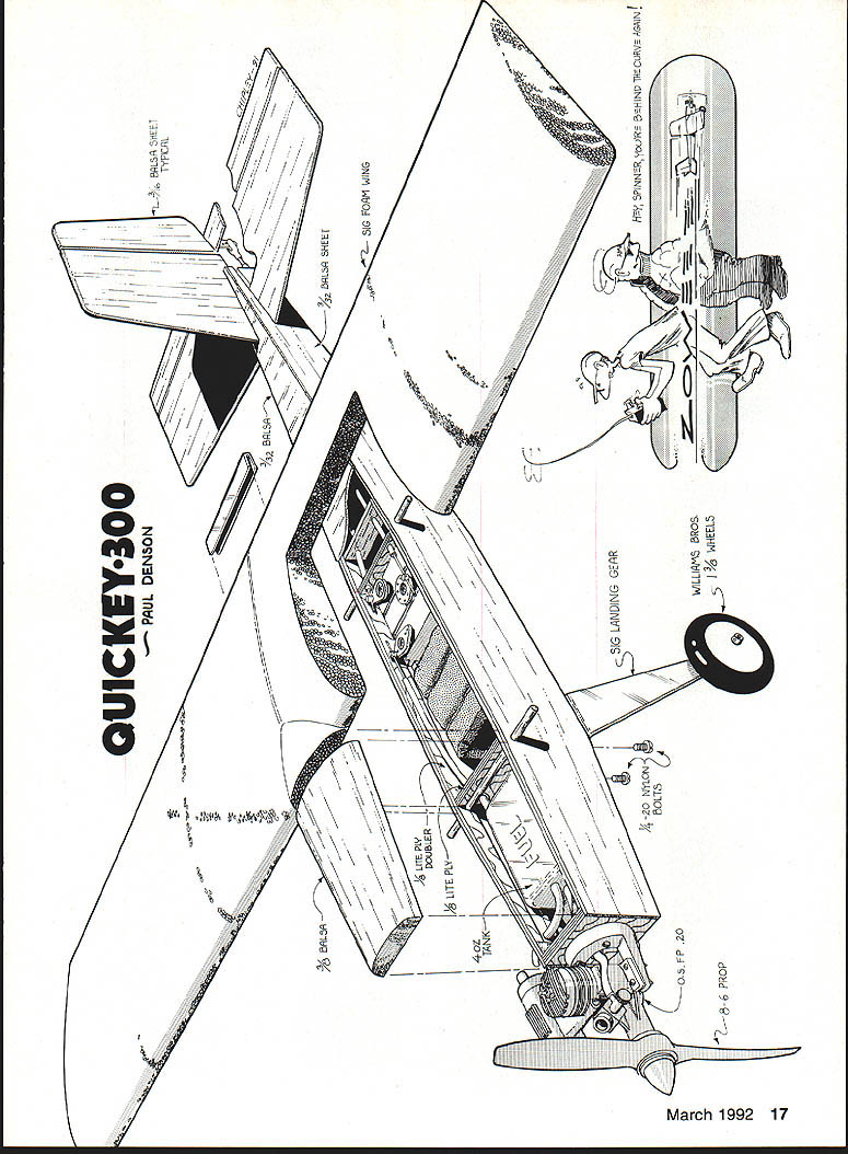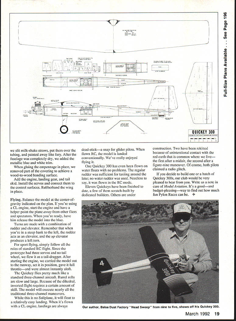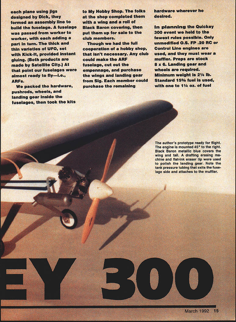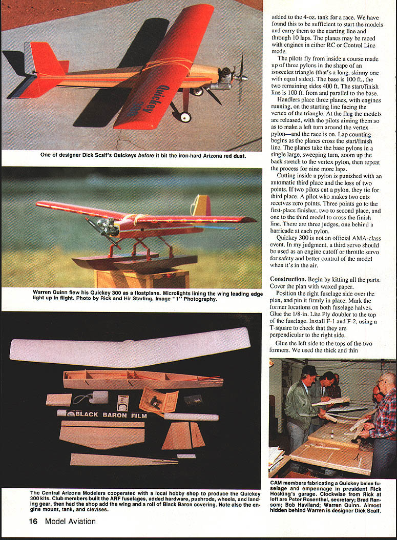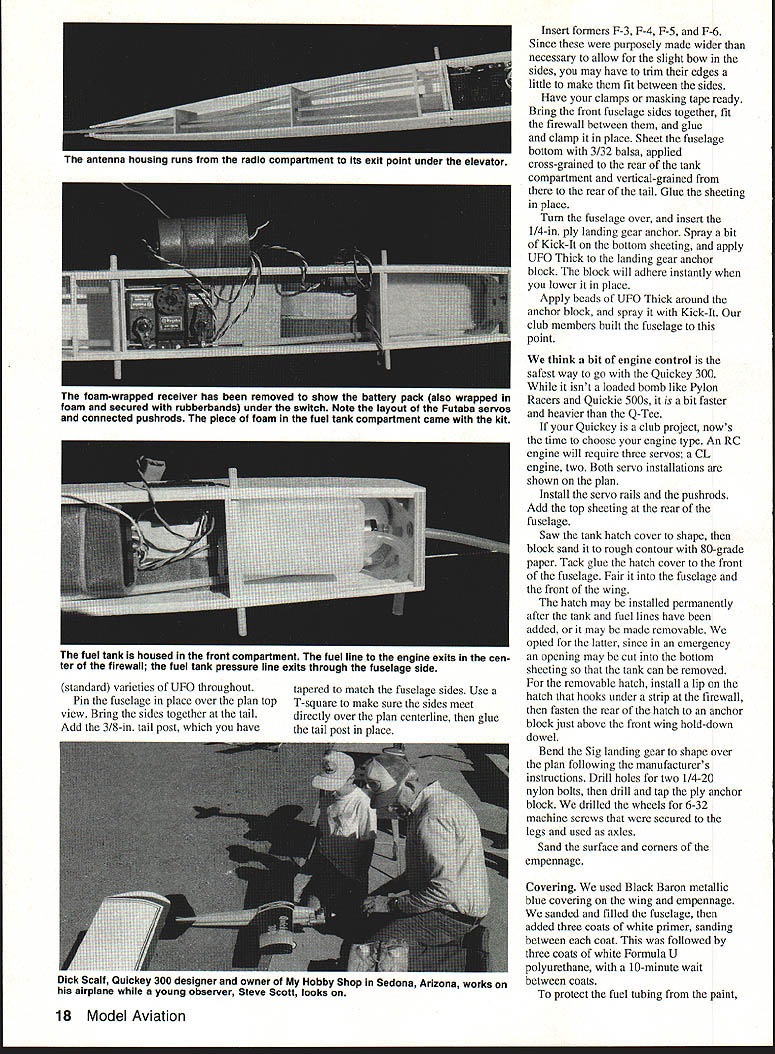DESIGNED Dick Scaif owner Hobby Shop Qulckey 300 intended event planned alternative 0-Tee racing 4500-ft. eievatlon north central Arizona flying Cox Biack Widowpowered 0-Tee rather difficult racing almost impossibie theres wind Dick adhered 0-Tee racing concept designlone engine pilots ability luck cost plane determining winner Quickey 300 also seen low-cost model beginning RC Pylon Racer plane covering engine comes about $100 less its mass produced club need now add threechannel radio Flying Ouickey 300 Control Une engine guaranteed keep toes other hand club members have discovered using RC engine throttling back bit turns true fun flier youve finished race want use up extra fuei tank before landing few minutes hotdogging heartily recommended youre intermediate bullderlflier couple slow-flying learner airplanes under belt might try Quickey 300 sharpen up reaction time learn few three-channel acrobatic maneuvers Add tail wheel make taxiing little easier Quickey 300 designed Central Arizona Modelers Inc. CAM club project kitting building flying Participating members got together presidents garage After cutting out parts plane using jigs designed Dick formed assembly line bulid fuselage fuselage passed worker worker adding part turn thick thin varieties UFO set Kick-It provided instant gluing Both products made Satellite City point fuselages almost ready flyIe ARFs packed hardware pushrods wheels landing gear inside fuselages took kits Hobby Shop folks shop completed wing roll Black Baron covering put up sale club members Though full cooperation hobby shop Isnt necessary Any club couid make ARF fuselage cut out empennage purchase wings landing gear Sig member could purchase remaining hardware wherever desired planning Qulckey 300 event held fewest rules possible Only unmodified 0S FP 20 RC Control Une engines used must wear muffler Props stock S x 6 Landing gear wheels required Minimum weight 152 lb Standard 15% fuel used 1 oz fuel authors prototype ready flight engine mounted 45 right Black Baron metallic blue covers wing tail drafting erasing ma chine flat-ink eraser tip used polish landing gear Note tank pressure tubing exits fuse lage side attaches muffler added 4-oz tank race have found sufficient start models carry starting line through 10 laps planes may raced engines either RC Control Line mode pilots fly inside course made up three pylons shape isosceles triangle thats long skinny equal sides base 100 ft two remaining sides 400 ft start/finish line 100 ft parallel base Handlers place three planes engines running starting line facing vertex triangle flag models released pilots aiming make left turn around vertex pylonand race Lap counting begins planes cross start/finish line planes take base pylons single large sweeping turn zoom up back stretch vertex pylon repeat process nine laps Cutting inside pylon punished automatic third place loss two points two pilots cut pylon tie third place pilot makes two cuts receives zero points Three points go first-place finisher two second place third model cross finish line three judges behind barricade pylon Quickey 300 official AMA-class event judgment third servo should used engine cutoff throttle servo safety better control model its air Construction Begin kitting parts Cover plan waxed paper Position right fuselage side over plan pin firmly place Mark former locations both fuselage halves Glue 1/8-in Lite Ply doubler top fuselage Install F-l F-2 using T-square check perpendicular right side Glue left side tops two formers used thick thin 16 Model Aviation designer Dick bcaivs UUICKY5 Delore bit tfle iron-hard Arizona red dust Warren Quinn flew Quickey 3uu THoalpiane MlcrolIgnts lining wing leading edge light up flight Photo Rick Hir Starling Image 1 Photography Central Arizona Modelers cooperated local hobby shop iu pruuu uuiwwy 300 kits Club members built ARF fuselages added hardware pushrods wheels land ing gear shop add wing roll Black Baron covering Note also en gine mount tank devises CAM members fabricating uuicey Dalsa Tu selage empennage president Rick Hoskings garage Clockwise Rick left Peter Rosenthal secretary Brad Ran som Bob Haviland Warren Quinn Almost hidden behind Warren designer Dick Scaif /1 QU1CKEY300I DEN5ONIr9BLSSrEiT /I P\CL c0 65 I %urE-PLY DOUBLER PLY 4oZ TANKI\\ 6 SIG LANDING GERR /-YSRNNRXJRE INVCURVEAGAINf OS FR 20_____ 0WILLMS EROS________ PROP 0 0 standard varieties UFO throughout Pin fuselage place over plan top view Bring sides together tail Add 3/8-in tail post have tapered match fuselage sides Use T-square make sure sides meet directly over plan centerline glue tail post place Insert formers F-3 F-4 F-S F-6 Since purposely made wider necessary allow slight bow sides may have trim edges little make fit between sides Have clamps masking tape ready Bring front fuselage sides together fit firewall between glue clamp place Sheet fuselage bottom 3/32 balsa applied cross-grained rear tank compartment vertical-grained rear tail Glue sheeting place Turn fuselage over insert 1/4-in ply landing gear anchor Spray bit Kick-It bottom sheeting apply UFO Thick landing gear anchor block block will adhere instantly lower place Apply beads UFO Thick around anchor block spray Kick-It club members built fuselage point think bit engine control safest way go Quickey 300 isnt loaded bomb like Pylon Racers Quickie 500s bit faster heavier Q-Tee Quickey club project nows time choose engine type An RC engine will require three servos CL engine two Both servo installations shown plan Install servo rails pushrods Add top shecting rear fuselage Saw tank hatch cover shape block sand rough contour 80-grade paper Tack glue hatch cover front fuselage Fair fuselage front wing hatch may installed permanently after tank fuel lines have added may made removable opted latter since emergency opening may cut bottom sheeting tank can removed removable hatch install lip hatch hooks under strip firewall fasten rear hatch anchor block just above front w