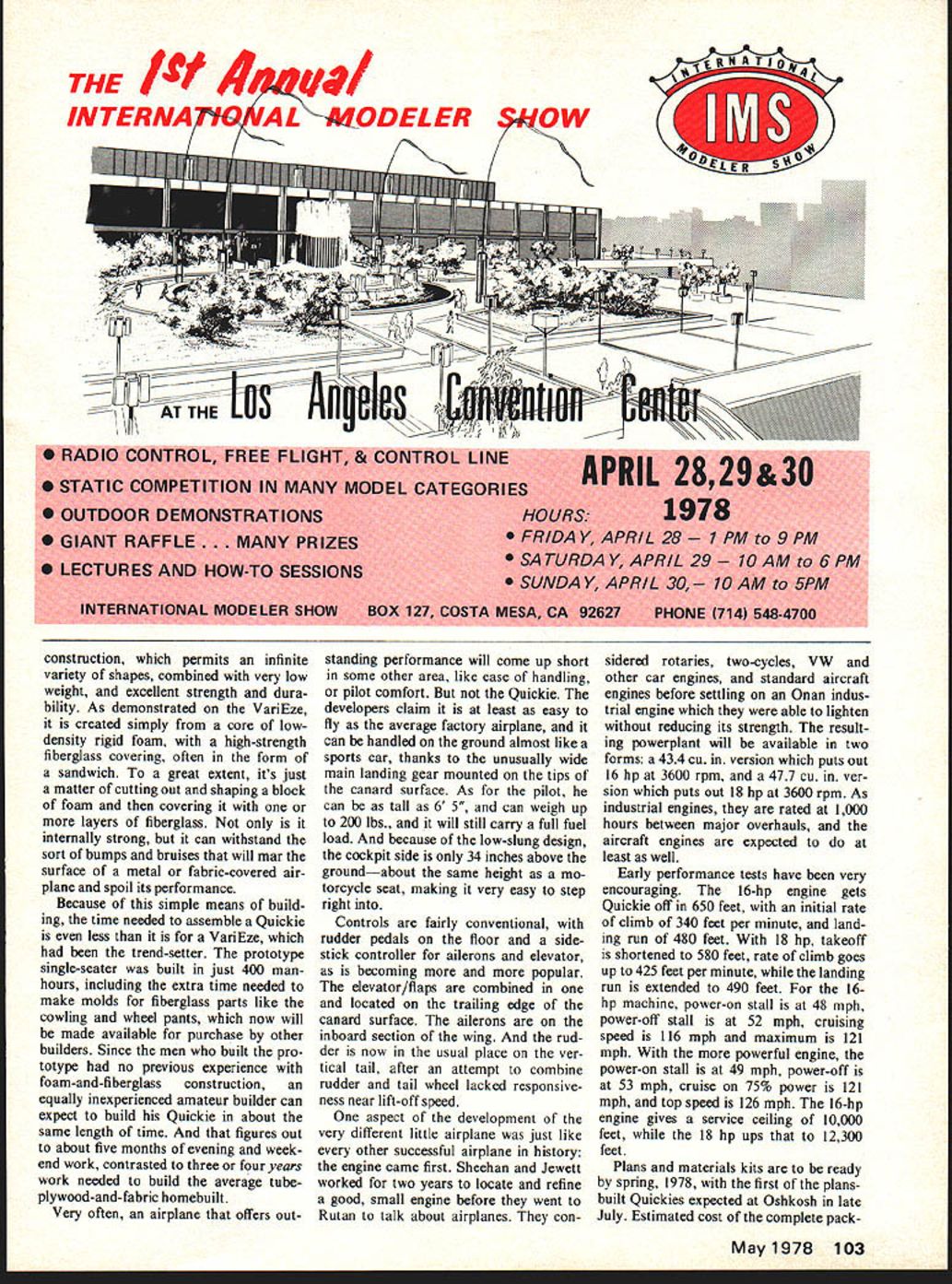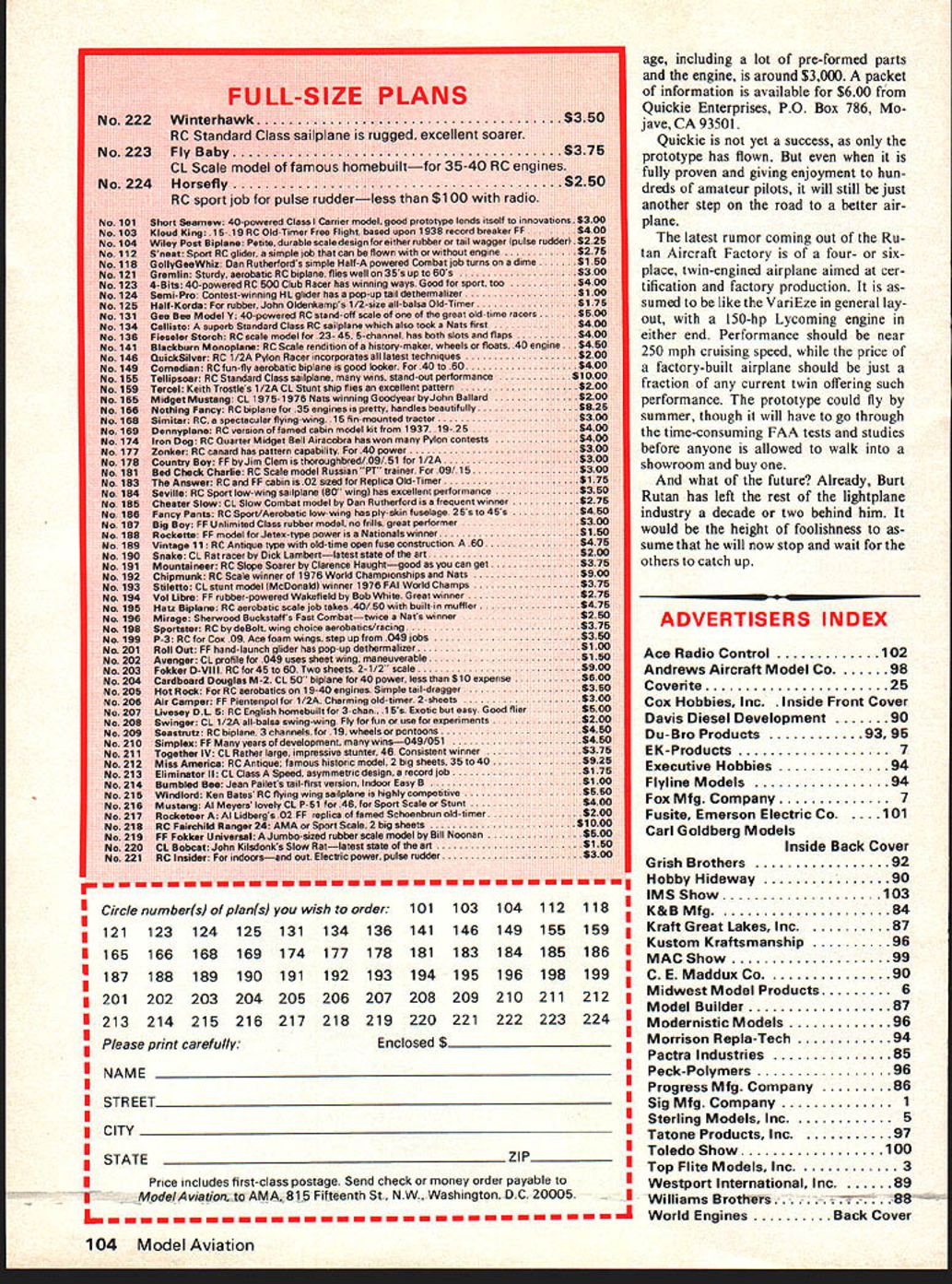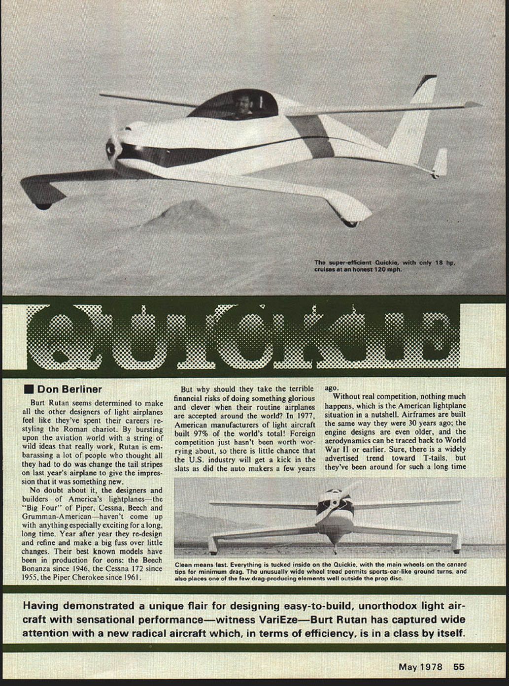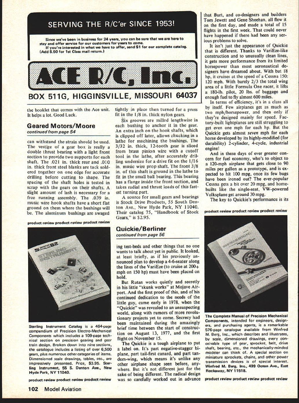 NO OCR TEXT Ut __ built i3ut now long vative cautious Rurt ing DI fat few years own design better builder t Rutan light day double ial Swedu fighter anyones excel aravicristiCS Lfltcd Though said Throwina conventic iward a better aii EAA n limited b -pretty appearanc4 considered ho obviously p ut 1975 star began very steeply VariEze appeare Kosh Fly-In after home base jump ci gle day drawing o orums design us truly original lipi package c building time equally big iii mance sleek ASA-designed winglci ny people mu Cessna 150 i 200 mph tI sin manage 120 dde Enterprises came instruction foam enasne ne tiny implebu oro ir hi days mebujit ht line indeed before ii past wa tan sit ba VariEze demonstra doing er attt rs Fore tion counts uumo vheel will replal wings ai BOX 511G HIGGINSVILLE MISSOURI 64037 booklet comes Ace unit helps lot Good Luck Geared Motors/Moore continued page 54 can withstand strain should used vestige gear box really double thrust bearing light front section provide two supports shaft 021 thick rear 010 thick front steel blanks tack sold ered together edge accurate drilling before cutting shape spacing shaft holes tested scrap gears shafts slight amount lash necessary free running assembly 039 music wire hook shafts have short flat ground bushings will aluminum bushings swaged Sterling Instrument Catalog 464-page compendium Precision Electro-Mechanical Components includes 109-page tech nical section precision gearing gear train design Broken down nine sections catalogue includes listing over 6500 gears plus numerous other categories items Dimensioned scale drawings tables etc impressively presented Price $395 Ster ling Instrument 55 S Denton Ave New Hyde Park NY 11040 product review product review product review tightly place turned press fit 1/8 thick nylon gears Six grooves milled lengthwise bushing anchor gear An extra inch hook shafts clipped off later allows chucking lathe machining bushings 3/32 thick 12-tooth gear sliced brass pinion wire cutoff tool lathe after accurately dril ling undersize drive fit 1/16 m music wire prop shaft front 3/8 shaft ground lathe fit small ball bearing bearing has flange inside front section takes radial thrust loads fast est turning part source small gears bearings Stock Drive Products 55 South Denton Ave New Hyde Park NY 11040 catalog 75 Handbook Stock Gears $295 Quickie/Berliner continued page 56 ing test-beds other things no wants talk about yet public looked least briefly previously nounced plan develop 4-6-seater along lines VariEze cruise 200 mph 150 hp must have placed hold Rut Rutan works quietly secretly little skunk works Mojave Air port first proof continued dedication needs little guy came early 1978 Quickie revealed unsuspecting world along rumors revolu tionary projects yet come Secrecy maintained during amazingly brief time between start construc tion August 13 1977 first flight November 15 Quickie tough airplane put label Its part negative-stagger bi plane part tail-first canard part tan dem-wing means its unlike other airplane shape seen before its different just sake being different radical design carefully worked out advance Burt co-designers builders Tom Jewett Gene Sheehan flew first day made total 15 flights first week could never have happened ser ious problems solve isnt just appearance Quickie different Thanks VariEze-like construction unusually clean lines gets performance its limited horsepower aeronautical de signers have dreamed about 18 hp cruises speed Cessna 150 120 mph barely 2/3 total wing area little Formula racer lifts 180-lb pilot 20 lbs baggage enough fuel fly almost 600 miles terms efficiency its class itself Few airplanes get much two mph/horsepower theyre designed mainly speed Fac tory-built lightplanes still struggling get mph hp Quickie gets almost seven mph horse developed its highly-modified durability 2-cylinder 4-cycle industrial engine days ever greater con cern fuel economy whos object 120-mph airplane gets close 90 miles per gallon prototype ex pected hit 100 mpg once its few bugs have ironed out ever-popular Cessna gets bit over 20 mpg home builts like single-seat VW-powered Volksplane get around 30 mpg key Quickies performance its product review product review product review Complete Manual Precision Mechanical Components intended engineers design ers purchasing agents remarkable 576-page catalogue available Winfred M Berg Inc describes illustrates scale dimensioned drawings con ceivable type gear sprocket belt drive shaft bearing etc mechanically-minded modeler can think special section miniature sprockets chains other power transmission devices special interest Winf red M Berg Inc 499 Ocean Ave East Rockaway NY 11518 product review product review product review 102 Model Aviation Since weve business 24 years can sure stay offer service customers years come youre interested what have offer send Si complete catalog Add 550 1st Class mail return Ak IlL Em product review product review product review THE 4U1 4~g/ AL ODELER ow RADIO CONTROL FREE FLIGHT & CONTROL LINEAPRIL 2829&30 STATIC COMPETITION IN MANY MODEL CATEGORIES OUTDOOR DEMONSTRATIONSHOURS1978 GIANT RAFFLE. MANY PRIZES FRIDAY APRIL 28 9PM SATURDAY APRIL29 10AM 6PM LECTURES AND HOW-TO SESSIONS SUNDAY APRIL 30 10 AM 5PM INTERNATIONAL MODELER SHOW BOX 127 COSTA MESA CA 92627 PHONE 4714 548-4700 construction permits infinite variety shapes combined very low weight excellent strength dura bility As demonstrated VariEze created simply core lowdensity rigid foam high-strength fiberglass covering often form sandwich great extent its just matter cutting out shaping block foam covering layers fiberglass internally strong can withstand sort bumps bruises will mar surface metal fabric-covered air plane spoil its performance Because simple means build ing time needed assemble Quickie less VariEze trend-setter prototype single-seater built just 400 man hours including extra time needed make molds fiberglass parts like cowling wheel pants now