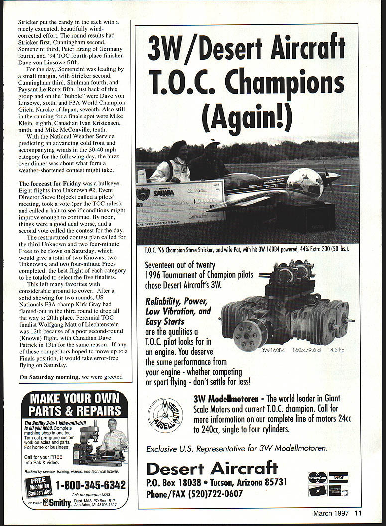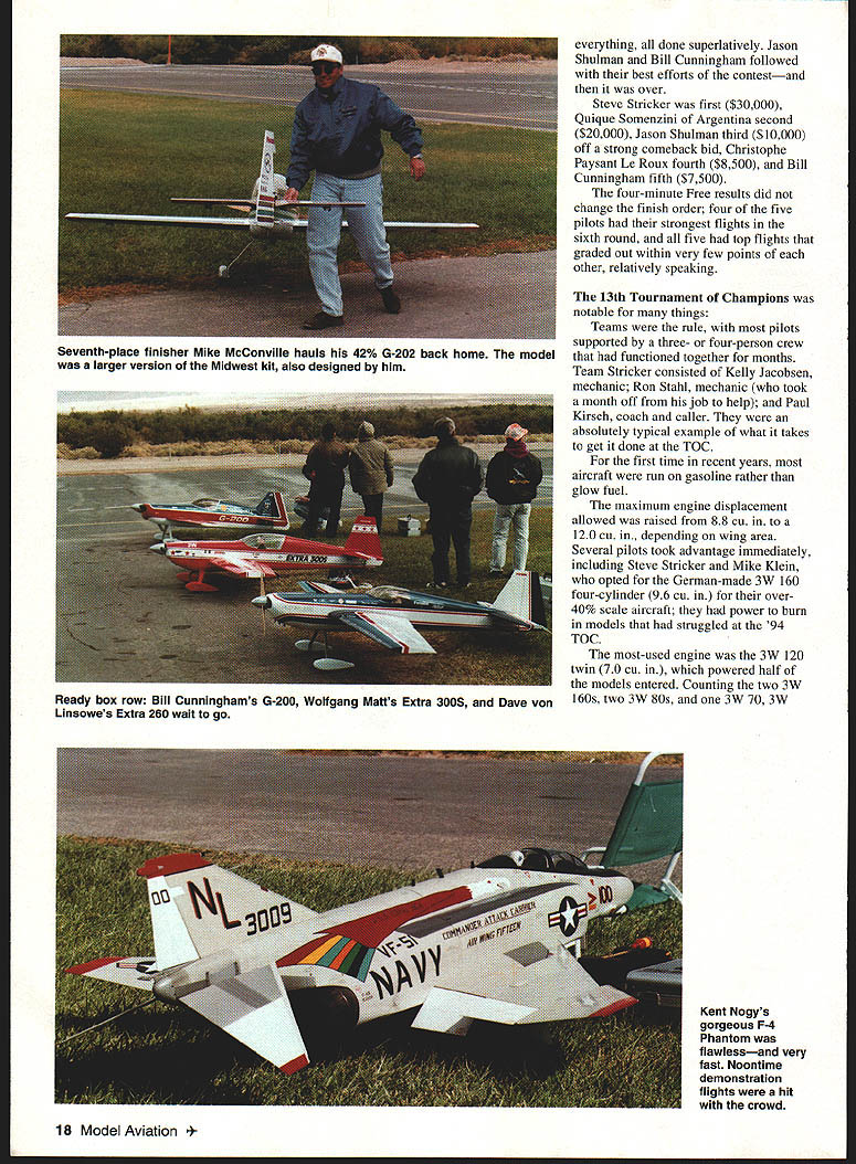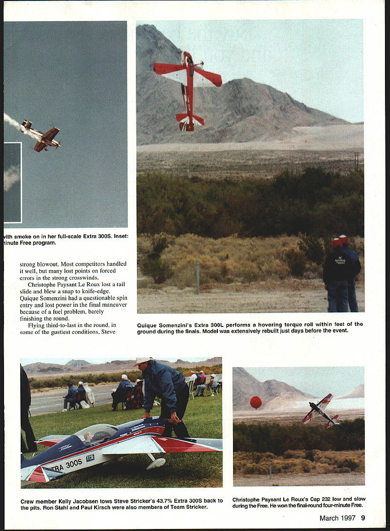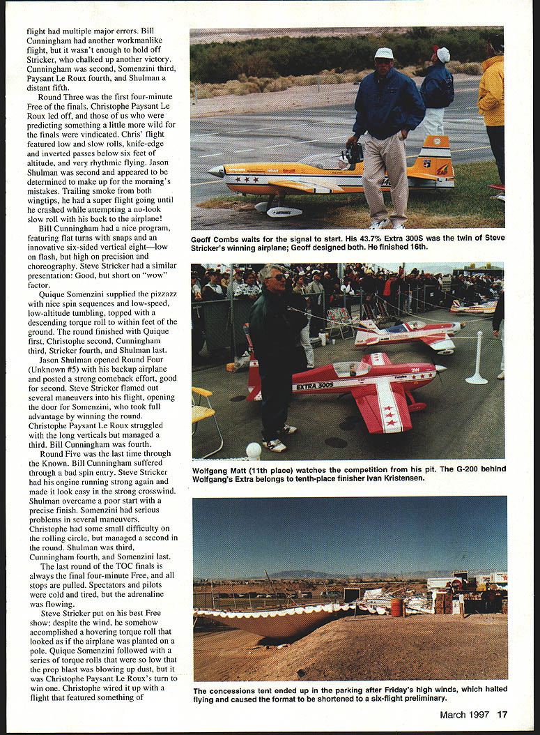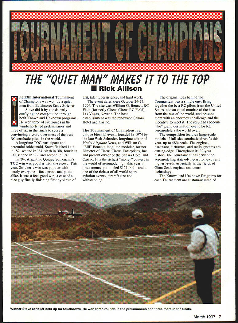 TAlE QUIET MAN MAKES IT TO TAlE TOP U Rick Allison 13th International Tournament mof Champions won quiet man Baltimore Steve Stricker m Steve did consistently outflying competition through both Known Unknown programs won three six rounds wind-shortened preliminaries three six finals score convincing victory over best RC aerobatic pilots world longtime TOC participant perennial bridesmaid Steve finished 14th 82 second 84 sixth 88 fourth 90 second 92 second 94 94 Argentine Quique Somenzinis TOC win popular crowd year Strickers win popular nearly everyonefans press pilots alike feel-good win case nice guy finally finishing first virtue grit talent persistence hard work event dates October 24-27 1996 site William G Bennett RC Field formerly Circus Circus RC Field Las Vegas Nevada host establishment renowned Sahara Hotel Casino Tournament Champions unique biennial event founded 1974 late Walt Schroder longtime editor Model Airplane News William G Bill Bennett longtime modeler former Director Circus Circus Enterprises Inc present owner Sahara Hotel Casino richest money contest world aeromodelingthis years prize money pot totaled $151000and richest world sport aviation events aircraft size withstanding original idea behind Tournament simple Bring together best RC pilots United States add equal number best rest world present enormous challenge incentive meet result has become grand destination event RC aeromodelers world over competition features large-scale models full-size aerobatic aircraft year up 48% scale engines hardware airframes radio systems cutting-edge Throughout its 22-year history Tournament has driven aeromodeling state-of-the-art newer higher levels especially fields Giant Scale engines control technology Known Unknown Programs Tournament custom-assembled March 1997 7 Winner Steve Stricker sets up touchdown won three rounds preliminaries three finals FAI Aresti catalog aerobatic figures contest management judges mix full-scale International Aerobatic Club judges experienced RC Pattern judges first time recent memory no special flight score bonuses based aircraft size type contest format calls three days qualifying flights total nine rounds three Known Compulsory Program Unknown Compulsory Programs handed contestants night before must flownno practice allowed four-minute Free Program qualifying leads six-round finals top five pilots again evenly divided among two Knowns Unknown #s 4 5 two Free programs preliminaries finals lowest scoring flight program type dropped scoring modified JAC rules weighted follows 50% Unknowns 30% Knowns balance 20% four-minute Free Defending Champion Quique Somenzini won opening-round Unknown decisively serving notice road big payday would go through him Jason Shulman second strong effort Veterans Bill Cunningham Steve Stricker third fourth young French phenom Christophe Paysant Le Roux fifth Round Two tough Known program practiced contestants months previous competition Ivan Kristensen opened round clean effort failed hold up Quique Somenzini jacked up ante beautiful flight marred some difficulty spin Several flights later Steve Stricker uncorked nearly flawless burner put round away Quique dropped second place round Christophe Paysant Le Roux third Shulman fourth Cunningham fifth start Round Three second Known program wind picking up Bill Cunningham set standard early strong flight few problems except missed snap knife-edge As round progressed became evident weather conditions changing 8 Model Aviation r Erangs beautiful Wigens Z-250 makes crass-runway departure smoke start Free flight Inset electrically-fired smoke canisters Patty Wagstaff heads lunchtime show cente Mike McConvilles G-202 trails smoke during foi TOC rookie Benoit Paysant Le Roux ninth place waits beside Cap 232 Both Le Roux brothers flew well would have done better horsepower rith smoke full-scale Extra 300S Inset mute Free program strong blowout Most competitors handled well lost points forced errors strong crosswinds Christophe Paysant Le Roux lost tail slide blew snap knife-edge Quique Someuzini questionable spin entry lost power final maneuver because fuel problem barely finishing round Flying third-to-last round some gustiest conditions Steve Quique Somenzinis Extra 300L performs hovering torque roll within feet ground during finals Model extensively rebuilt just days before event Crew member Kelly Jacobsen tows Steve Strickers 437% Extra 300S back Christophe Paysant Le Rouxs Cap 232 low slow pits Ron Stahl Paul Kirsch also members Team Stricker during Free won final-round four-minute Free March 1997 9 Stricker put candy sack nicely executed beautifully windcorrected effort round results Stricker first Cunningham second Somenzini third Peter Erang Germany fourth 94 TOC fourth-place finisher Dave von Linsowe fifth day Somenzini leading small margin Stricker second Cunningham third Shulman fourth Paysant Le Roux fifth Just back group bubble Dave von Linsowe sixth F3A World Champion Giichi Naruke Japan seventh Also still running finals spot Mike Klein eighth Canadian Ivan Kristensen ninth Mike McConville tenth National Weather Service predicting advancing cold front accompanying winds 30-40 mph category following day buzz over dinner about what form weather-shortened contest might take forecast Friday bullseye Eight flights Unknown #2 Event Director Steve Rojecki called pilots meeting took vote per TOC rules called halt see conditions might improve enough continue noon things good deal worse second vote called contest day restructured contest plan called third Unknown two four-minute Frees flown Saturday would give total two Knowns two Unknowns two four-minute Frees completed best flight category totaled select five finalists left favorites considerable ground cover After solid showing two rounds US Nationals F3A champ Kirk Gray flamed-out third round drop way 20th place Perennial TOC finalist Wolfgang Matt Liechtenstein 12th because poor second-round Known flight Canadian Dave Pa