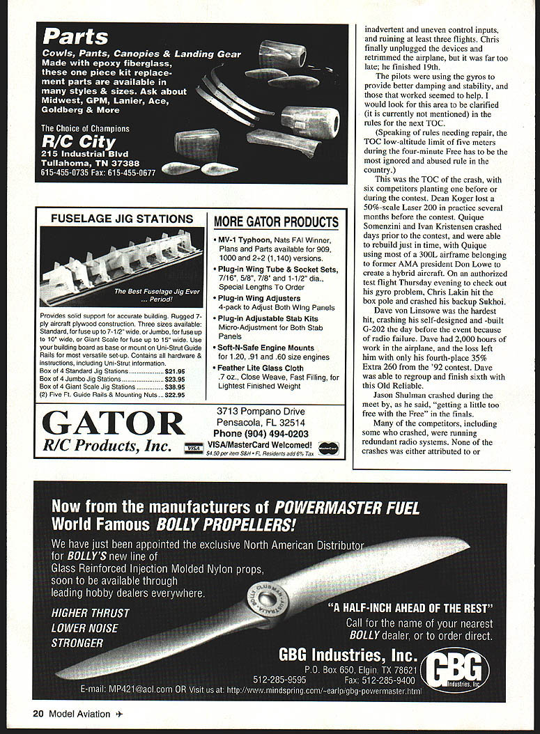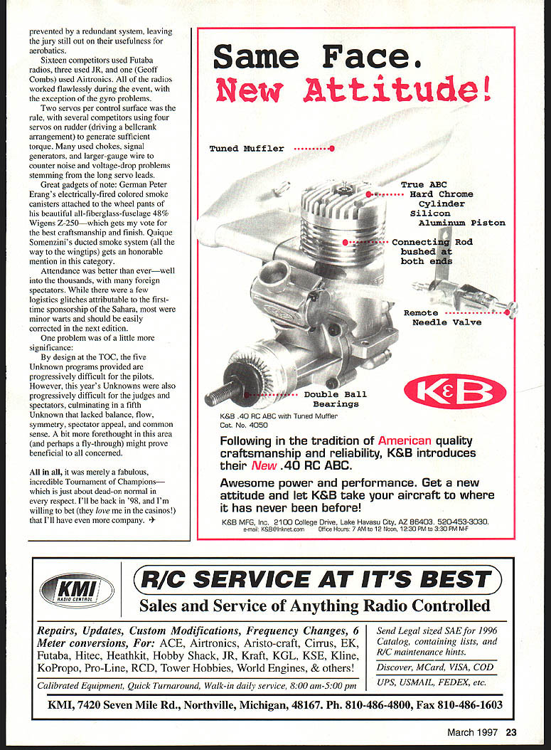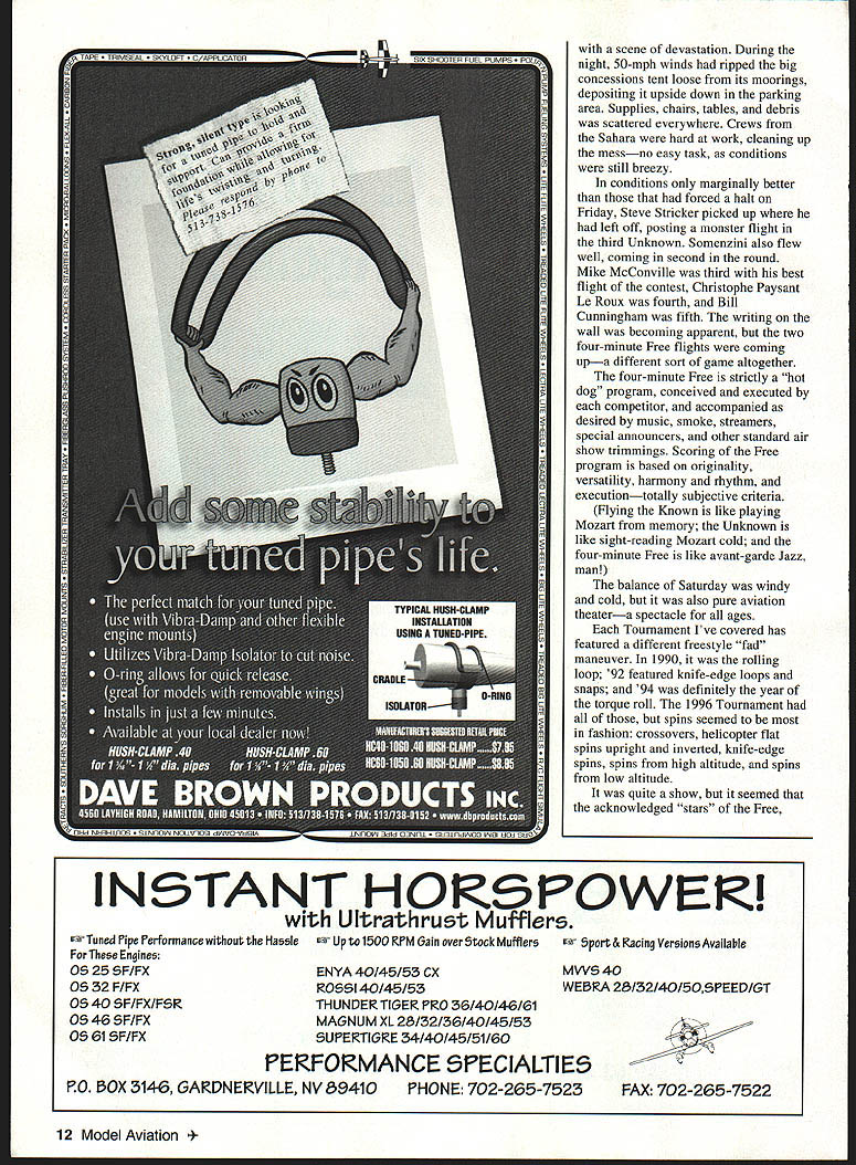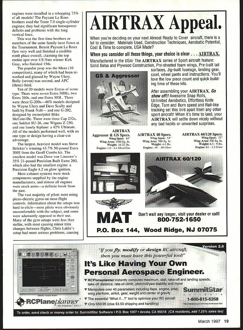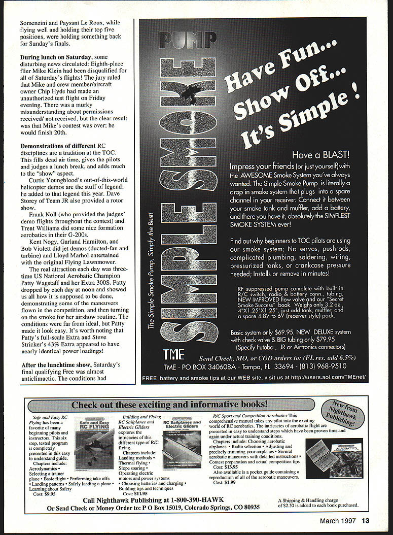TAlE QUIET MAN MAKES IT TO TAlE TOP U Rick Allison 13th International Tournament mof Champions won quiet man Baltimore Steve Stricker m Steve did consistently outflying competition through both Known Unknown programs won three six rounds wind-shortened preliminaries three six finals score convincing victory over best RC aerobatic pilots world longtime TOC participant perennial bridesmaid Steve finished 14th 82 second 84 sixth 88 fourth 90 second 92 second 94 94 Argentine Quique Somenzinis TOC win popular crowd year Strickers win popular nearly everyonefans press pilots alike feel-good win case nice guy finally finishing first virtue grit talent persistence hard work event dates October 24-27 1996 site William G Bennett RC Field formerly Circus Circus RC Field Las Vegas Nevada host establishment renowned Sahara Hotel Casino Tournament Champions unique biennial event founded 1974 late Walt Schroder longtime editor Model Airplane News William G Bill Bennett longtime modeler former Director Circus Circus Enterprises Inc present owner Sahara Hotel Casino richest money contest world aeromodelingthis years prize money pot totaled $151000and richest world sport aviation events aircraft size withstanding original idea behind Tournament simple Bring together best RC pilots United States add equal number best rest world present enormous challenge incentive meet result has become grand destination event RC aeromodelers world over competition features large-scale models full-size aerobatic aircraft year up 48% scale engines hardware airframes radio systems cutting-edge Throughout its 22-year history Tournament has driven aeromodeling state-of-the-art newer higher levels especially fields Giant Scale engines control technology Known Unknown Programs Tournament custom-assembled March 1997 7 Winner Steve Stricker sets up touchdown won three rounds preliminaries three finals FAI Aresti catalog aerobatic figures contest management judges mix full-scale International Aerobatic Club judges experienced RC Pattern judges first time recent memory no special flight score bonuses based aircraft size type contest format calls three days qualifying flights total nine rounds three Known Compulsory Program Unknown Compulsory Programs handed contestants night before must flownno practice allowed four-minute Free Program qualifying leads six-round finals top five pilots again evenly divided among two Knowns Unknown #s 4 5 two Free programs preliminaries finals lowest scoring flight program type dropped scoring modified JAC rules weighted follows 50% Unknowns 30% Knowns balance 20% four-minute Free Defending Champion Quique Somenzini won opening-round Unknown decisively serving notice road big payday would go through him Jason Shulman second strong effort Veterans Bill Cunningham Steve Stricker third fourth young French phenom Christophe Paysant Le Roux fifth Round Two tough Known program practiced contestants months previous competition Ivan Kristensen opened round clean effort failed hold up Quique Somenzini jacked up ante beautiful flight marred some difficulty spin Several flights later Steve Stricker uncorked nearly flawless burner put round away Quique dropped second place round Christophe Paysant Le Roux third Shulman fourth Cunningham fifth start Round Three second Known program wind picking up Bill Cunningham set standard early strong flight few problems except missed snap knife-edge As round progressed became evident weather conditions changing 8 Model Aviation r Erangs beautiful Wigens Z-250 makes crass-runway departure smoke start Free flight Inset electrically-fired smoke canisters Patty Wagstaff heads lunchtime show cente Mike McConvilles G-202 trails smoke during foi TOC rookie Benoit Paysant Le Roux ninth place waits beside Cap 232 Both Le Roux brothers flew well would have done better horsepower rith smoke full-scale Extra 300S Inset mute Free program strong blowout Most competitors handled well lost points forced errors strong crosswinds Christophe Paysant Le Roux lost tail slide blew snap knife-edge Quique Someuzini questionable spin entry lost power final maneuver because fuel problem barely finishing round Flying third-to-last round some gustiest conditions Steve Quique Somenzinis Extra 300L performs hovering torque roll within feet ground during finals Model extensively rebuilt just days before event Crew member Kelly Jacobsen tows Steve Strickers 437% Extra 300S back Christophe Paysant Le Rouxs Cap 232 low slow pits Ron Stahl Paul Kirsch also members Team Stricker during Free won final-round four-minute Free March 1997 9 Stricker put candy sack nicely executed beautifully windcorrected effort round results Stricker first Cunningham second Somenzini third Peter Erang Germany fourth 94 TOC fourth-place finisher Dave von Linsowe fifth day Somenzini leading small margin Stricker second Cunningham third Shulman fourth Paysant Le Roux fifth Just back group bubble Dave von Linsowe sixth F3A World Champion Giichi Naruke Japan seventh Also still running finals spot Mike Klein eighth Canadian Ivan Kristensen ninth Mike McConville tenth National Weather Service predicting advancing cold front accompanying winds 30-40 mph category following day buzz over dinner about what form weather-shortened contest might take forecast Friday bullseye Eight flights Unknown #2 Event Director Steve Rojecki called pilots meeting took vote per TOC rules called halt see conditions might improve enough continue noon things good deal worse second vote called contest day restructured contest plan called third Unknown two four-minute Frees flown Saturday would give total two Knowns two Unknowns two four-minute Frees completed best flight category totaled select five finalists left favorites considerable ground cover After solid showing two rounds US Nationals F3A champ Kirk Gray flamed-out third round drop way 20th place Perennial TOC finalist Wolfgang Matt Liechtenstein 12th because poor second-round Known flight Canadian Dave Pa