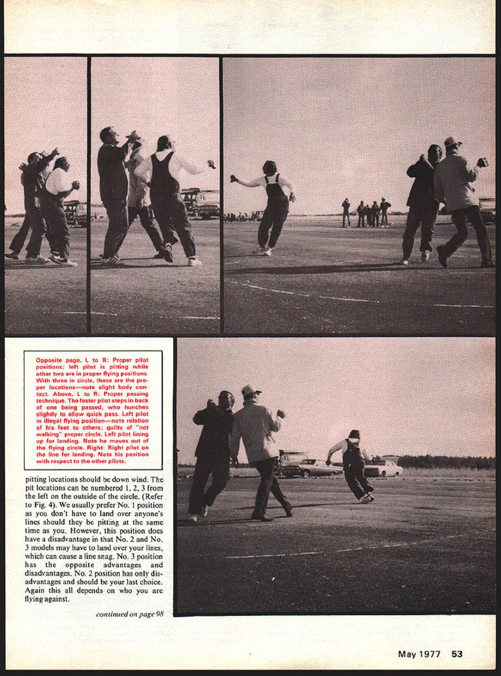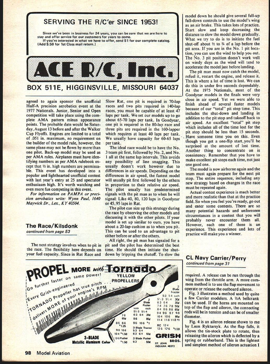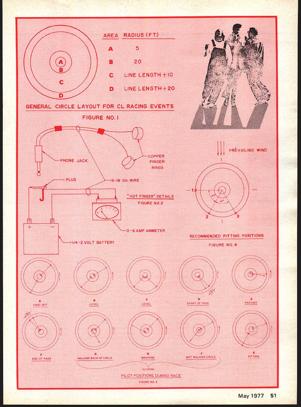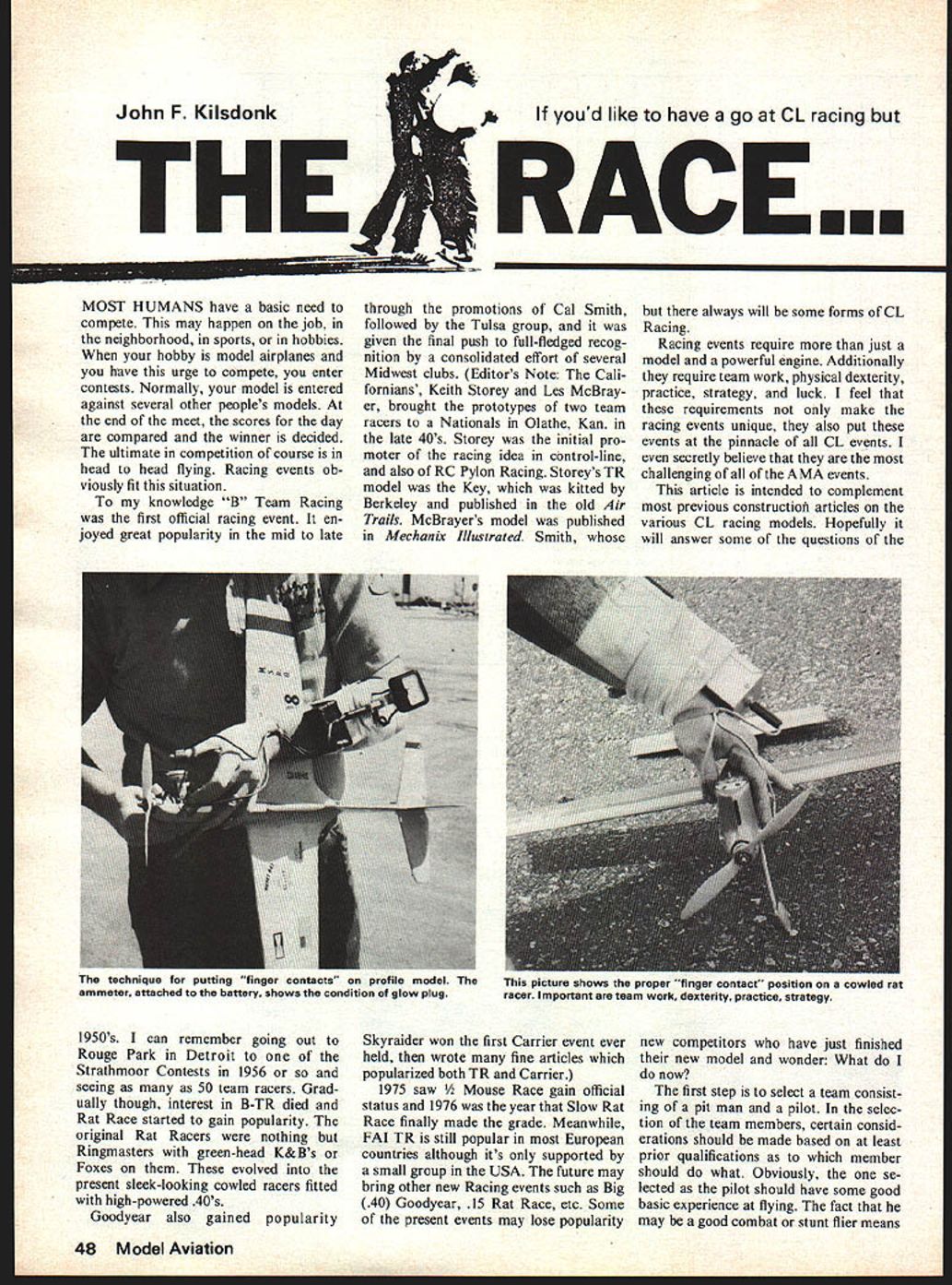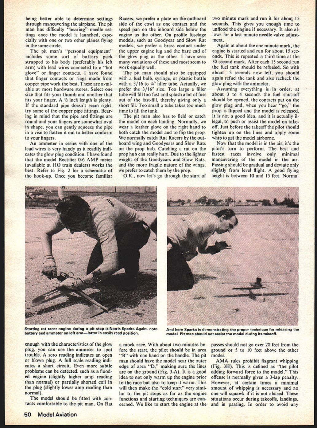 John F Kilsdonk THE youd like have go CL racing RACE. MOST HUMANS have basic need compete may happen job neighborhood sports hobbies hobby model airplanes have urge compete enter contests Normally model entered against several other peoples models end meet scores day compared winner decided ultimate competition course head head flying Racing events ob viously fit situation knowledge B Team Racing first official racing event en joyed great popularity mid late 1950s can remember going out Rouge Park Detroit Strathmoor Contests 1956 seeing 50 team racers Grad ually though interest B-TR died Rat Race started gain popularity original Rat Racers nothing Ringmasters green-head K&Bs Foxes evolved present sleek-looking cowled racers fitted high-powered 40s Goodyear also gained popularity through promotions Cal Smith followed Tulsa group given final push full-fledged recog nition consolidated effort several Midwest clubs Editors Note Cali fornians Keith Storey Les McBray er brought prototypes two team racers Nationals Olathe Kan late 40s Storey initial pro moter racing idea control-line also RC Pylon Racing Storeys TR model Key kitted Berkeley published old Air Trails McBrayers model published Mechanix Illustrated Smith Skyraider won first Carrier event ever held wrote fine articles popularized both TR Carrier 1975 saw e Race gain official status 1976 year Slow Rat Race finally made grade Meanwhile FAI TR still popular European countries although its supported small group USA future may bring other new Racing events such Big 40 Goodyear 15 Rat Race etc Some present events may lose popularity always will some forms CL Racing Racing events require just model powerful engine Additionally require team work physical dexterity practice strategy luck feel requirements make racing events unique also put events pinnacle CL events secretly believe challenging of AMA events article intended complement previous constructiofi articles various CL racing models Hopefully will answer some questions new competitors have just finished new model wonder What now first step select team consist ing pit man pilot selec tion team members certain consid erations should made based least prior qualifications member should what Obviously se lected pilot should have some good basic experience flying fact may good combat stunt flier means 48 Model Aviation technique putting finger contacts profile model ammeter attached battery shows condition glow plug picture shows proper finger contact position cowlea rai racer Important team work dexterity practice strategy feel put down inexperience experts briefing will prove invaluable flyit very little actual flying maneuver ing racing planes requires little skill Usually planes quite insensi tive wont maneuver very well way However pilot must have de velop good deal physical dexterity reflexes case Rat Race must have some brute physical strength Additionally taller pilot also ad vantage although absolutely neces sary Left-handed pilots big disad vantage Physical dexterity knowing what feet rest body something must developed Being able run fast important cause dont want run around circle want walk tight circle later General physical con dition quite important fast events such Rat Race Goodyear John Ballard claims runs five miles per day stay shape Personally some jogging mile couple days week addition some tennis although gen eral well-being flying order put team mem bers proper position necessary understand basic field layout racing events Fig 1 Depending facilities available configuration may vary However basic layout should used whenever possible events ex cept events use slightly dif ferent dimensions can consult rule book Area flying zone Pilots should stay area flying landings takeoffs should stay Area B Area C no-no zone Nobody should area during race Area D pitting zone pitting including ini tial starts confined area During landings takeoffs pilot should maintain crouched position Area B avoid snagging head other fliers lines plane being serviced should squat down keep flying handle near ground lines ground OK now youve gotten team together whats next Practice Practice single im portant thing preparation race Both pilot pit man must learn practice individual respon sibilities also must work together team First off must get familiar model practice flying alone Prac tice flying alone until basic systems routines working well get someone else fly Fly ing two other people circle lot different flying alone Although both pilot pit man comprise team both have different distinct re sponsibilities pit man team leader should call shots must very familiar operating char acteristics engine fuel shutoff addition personal equipment battery system fuel refilling device Additionally pit mans responsi bility monitor lap count deter best race strategy pit stops thing isnt obvious though pilot best able determine needle valve settings pilot hears steady drone engine addition May1977 49 Author shown tilling fuel tank prior start race Note fuel bulb right hand battery pack strapped left arm Norris Sparks demonstrates proper technique catching rat racer its oatboard wing Note leather glove used protect hand being better able determine settings through maneuvering airplane pit man has difficulty hearing needle set tings once model launched espe cially two other planes flying same circle pit mans personal equipment includes some sort battery pack strapped body preferably left arm lead wires connected hot glove finger contacts have found finger contacts rings made copper pipe work best avail able hardware stores Select size fits thumb another fits finger length plenty standard pipe doesnt seem right try some copper pipe fittings Bear ing mind pipe fittings round fingers somewhat oval shape can gently squeeze pipe vise flatten out better conform fingers An ammeter series lead wires very handy readily indi cates glow plug condition have found model Rectifier 0-6 AMP meter available HO train dealers works
