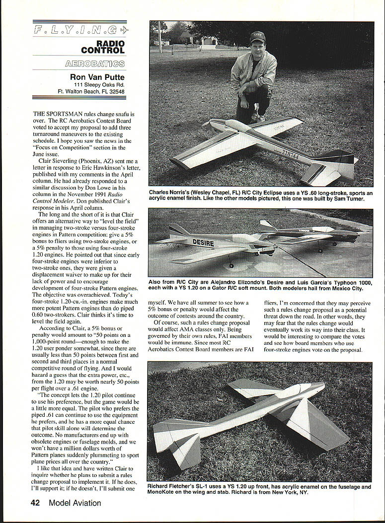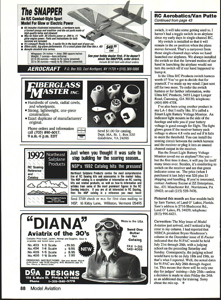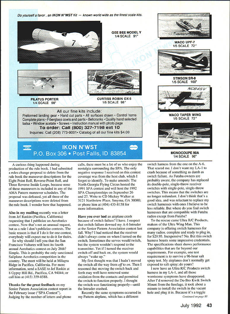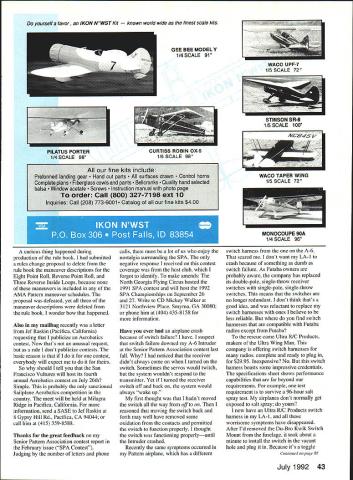 L0 OVOO7O RADIO ____ ___CONTROL Ron Van Putte 111 Sleepy Oaks Rd Ft Walton Beach FL 32548 THE SPORTSMAN rules change snafu over RC Aerobatics Contest Board voted accept proposal add three turnaround maneuvers existing schedule hope saw news Focus Competition section June issue Clair Sieverling Phoenix AZ sent letter response Eric Hawkinsons letter published comments April column already responded similar discussion Don Lowe column November 1991 Radio Control Modeler Don published Clair s response April column long short Clair offers alternative way level field managing two-stroke versus four-stroke engines Pattern competition give 5% bonus fliers using two-stroke engines 5% penalty using four-stroke 120 engines pointed out since early four-stroke engines inferior two-stroke ones given displacement waiver make up lack power encourage development four-stroke Pattern engines objective overachieved Todays four-stroke 1 20-cu-in engines make much potent Pattern engines piped 060 two-strokers Clair thinks its time level field again According Clair 5% bonus penalty would amount 50 points 1000-point roundenough make 120 user ponder somewhat since usually less 50 points between first second third places normal competitive round flying would hazard guess extra power etc 120 may worth nearly 50 points per flight over 61 engine concept lets 120 pilot continue use preference game would little equal pilot prefers piped 61 can continue use equipment prefers has equal chance pilot skill alone will determine outcome No manufacturers end up obsolete engines fuselage molds wont have million dollars worth Pattern planes suddenly plummeting sport plane prices over country like idea have written Clair inquire whether plans submit rules change proposal implement does Ill support doesnt Ill submit myself have summer see 5% bonus penalty would affect outcome contests around country course such rules change proposal would affect AMA classes Being governed own rules FAI members would immune Since RC Aerobatics Contest Board members FAI fliers Im concerned may perceive such rules change proposal potential threat down road other words may fear rules change would eventually work its way class would interesting compare votes see board members use four-stroke engines vote proposal 42 Model Aviation Charles Norriss Wesley Chapel FL R/C City Eclipse uses VS 60 long-stroke sports acrylic enamel finish Like other models pictured built Sam Turner Also RIC City Alejanaro uizonaos Liesire Luls Uarcias Typhoon 1000 VS 120 Gator R/C soft mount Both modelers hail Mexico City Richard Fletchers SL-1 uses VS 120 up front has acrylic enamel fuselage aria Mono Kote wing stab Richard New York NV yourself favor IKON NY/ST Kit n world wide finest scale kits GEE BEE MODEL Y 1/4 SCALE 91 curious thing happened during production rule book submitted rules change proposal delete rule book maneuver descriptions Eight Point Roll Reverse Point Roll Three Reverse Inside Loops because maneuvers included AMA Pattern maneuver schedules proposal defeated yet three maneuver descriptions deleted rule book wonder happened Also mailbag recently letter Jef Raskin Pacifica California requesting publicize Aerobatics contest Now thats unusual request rule dont publicize contests basic reason contest everybody will expect So should tell San Francisco Vultures will host its fourth annual Aerobatics contest July 26th Simple probably sanctioned Sailplane Aerobatics competition country meet will held Milagra Ridge Pacifica California information send SASE Jef Raskin 8 Gypsy Hill Rd Pacifica CA 94044 call him 415 359-8588 Thanks great feedback Senior Pattern Association contest report February issue SPA Contest Judging number letters phone calls must lot us enjoy nostalgia surrounding SPA negative response received contest coverage host club forgot identify make amends North Georgia Flying Circus hosted 1991 SPA contest will host 1992 SPA Championships September 26 27 Write CD Mickey Walker 3121 Northview Place Smyrna GA 30080 phone him 404 435-8158 information Have ever airplane crash because switch failure have suspect switch failure downed A-6 Intruder Senior Pattern Association contest last fall noticed receiver didnt always come turned switch Sometimes servos would twitch system wouldnt respond transmitter Yet turned receiver switch off back system would always wake up first thought hadnt moved switch way off reasoned moving switch back forth may well have removed some oxidation contacts permitted switch function properly thought switch functioning properlyuntil Intruder crashed Recently same symptoms occurred Pattern airplane has different STINSON SR-B 1/5 SCALE 100 switch harness the A-6 scared dont want LA- 1 crash because something dumb switch failure As Futaba owners probably aware company has replaced its double-pole single-throw receiver switches single-pole single-throw switches means switches no longer redundant dont think thats good idea reluctant replace switch harnesses ones believe less reliable find switch harnesses compatible Futaba radios except Futaba rescue came Ultra R/C Products makers Ultra Wing Man company offering switch harnesses radios complete ready plug $2995 Inexpensive No switch harness boasts some impressive credentials specifications sheet shows performance capabilities far beyond requirements example test requirement survive 96-hour salt spray test airplanes dont normally get exposed salt spray yours now have Ultra R/C Products switch harness LA-i worrisome symptoms have disappeared After Id removed Du-Bro Kwik Switch Mount fuselage took about minute install switch vacant hole plug Because its toggle Continued page 88 July1992 43 WACO UPF7 1/5 SCALE 72 PILATUS PORTERCURTISS ROBIN OX-5 1/4 SCALE 98115 SCALE 98 WCLI#sv 6 fine kits include Preformed landing gear Hand cut parts aces drawn Control horns Complete plans Fiberglass cowls pants Bellcranks ity hand selected balsa ow acetate ws ruction manual photo page order Call 800 32