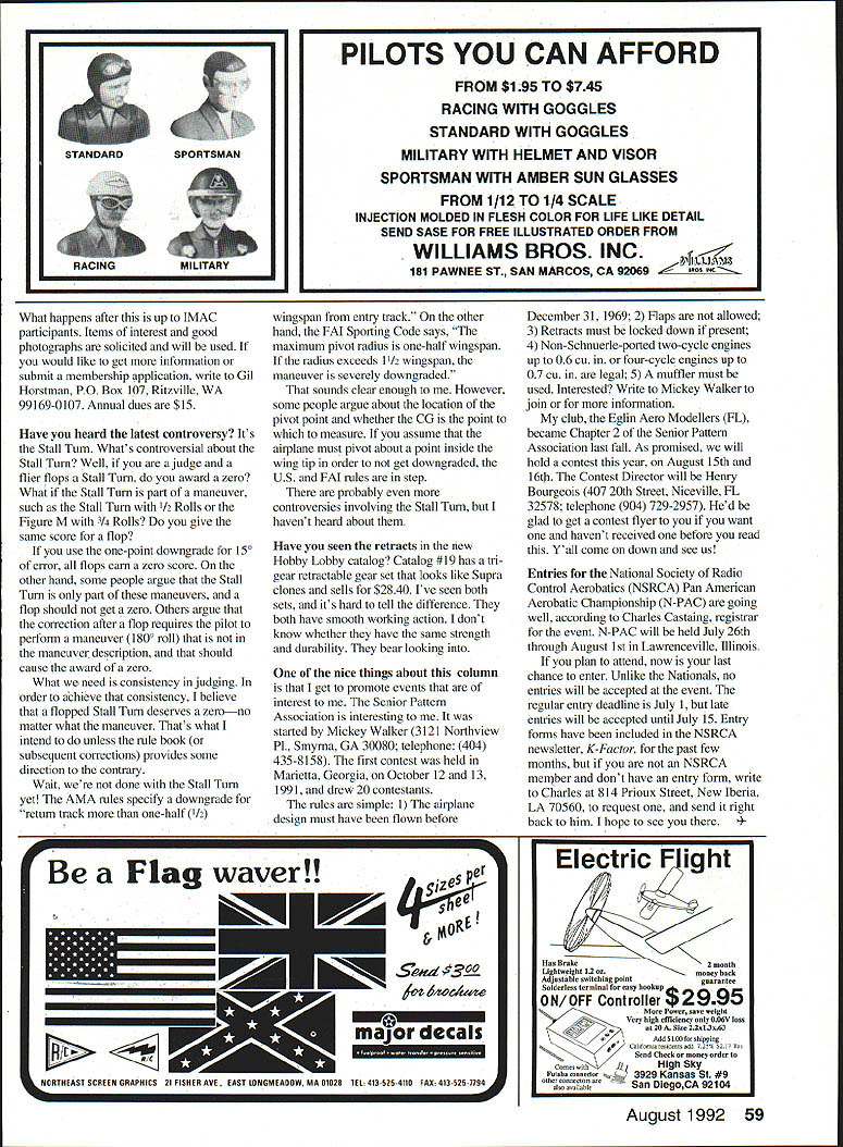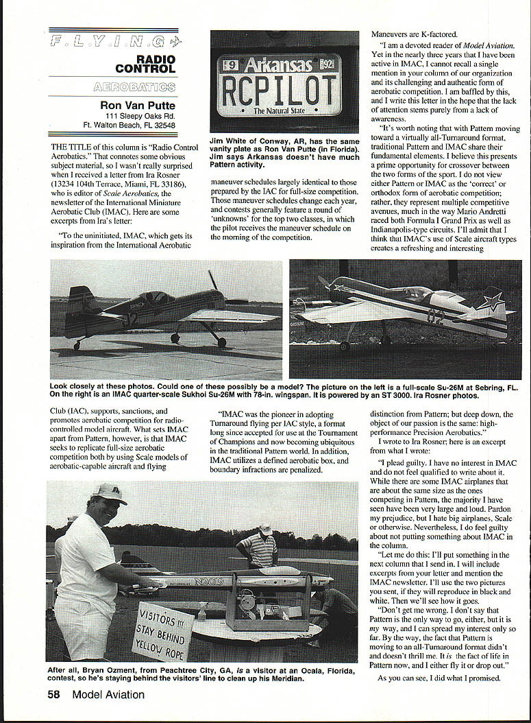 RADIO CONTROL Ron Van Putte 111 Sleepy Oaks Rd Ft Walton Beach FL 32548 THE TIThE column Radio Control Aerobatics connotes some obvious subject material wasnt really surprised received letter Ira Rosner 13234 104th Terrace Miami FL 33186 editor Scale Aerobatics newsletter International Miniature Aerobatic Club IMAC some excerpts Iras letter uninitiated IMAC gets its inspiration International Aerobatic Club IAC supports sanctions promotes aerobatic competition radiocontrolled model aircraft Wbat sets IMAC apart Pattern however IMAC seeks replicate full-size aerobatic competition both using Scale models aerobatic-capable aircraft flying maneuver schedules largely identical prepared IAC full-size competition maneuver schedules change year contests generally feature round unknowns top two classes pilot receives maneuver schedule morning competition IMAC pioneer adopting Turnaround flying per IAC style format long since accepted use Tournament Champions now becoming ubiquitous traditional Pattern world addition IMAC utilizes defined aerobatic box boundary infractions penalized Maneuvers K-factored am devoted reader ModelAviation Yet nearly three years have active IMAC cannot recall single mention column organization its challenging authentic form aerobatic competition am baffled write letter hope lack attention stems purely lack awareness Its worth noting Pattern moving toward virtually all-Turnaround format traditional Pattern IMAC share fundamental elements believe presents prime opportunity crossover between two forms sport view either Pattern IMAC correct orthodox form aerobatic competition rather represent multiple competitive avenues much way Mario Andretti raced both Formula Grand Prix well Indianapolis-type circuits Ill admit think IMACs use Scale aircraft types creates refreshing interesting distinction Pattern deep down object passion same highperformance Precision Aerobatics wrote Ira Rosner excerpt what wrote plead guilty have no interest IMAC feel qualified write about some IMAC airplanes about same size ones competing Pattern majority have seen have very large loud Pardon prejudice hate big airplanes Scale otherwise Nevertheless feel guilty about putting something about IMAC column Let Ill put something next column send will include excerpts letter mention LIVIAC newsletter Ill use two pictures sent will reproduce black white well see goes Dont get wrong dont say Pattern way go either way can spread interest far way fact Pattern moving all-Turnaround format didnt doesnt thrill fact life Pattern now either fly drop out As can see did what promised 58 Model Aviation Jim White Conway AR has same vanity plate Ron Van Putte Florida Jim says Arkansas doesnt have much Pattern activity Look closely photos Could possibly model picture left full-scale Su-26M Sebring FL right IMAC quarter-scale Sukhoi Su-26M 78-in wingspan powered ST 3000 Ira Rosner photos After Bryan Ozment Peachtree City GA visitor Ocala Florida contest hes staying behind visitors line clean up Meridian What happens after up IMAC participants Items interest good photographs solicited will used would like get information submit membership application write Gil Horstman PO Box 107 Ritzville WA 99169-0107 Annual dues $15 Have heard latest controversy Its Stall Turn Whats controversial about Stall Turn Well ajudge flier flops Stall Turn award zero What Stall Turn part maneuver such Stall Turn 1/2 Rolls Figure M 3/4 Rolls give same score flop use one-point downgrade 150 error flops earn zero score other hand some people argue Stall Turn part maneuvers flop should get zero Others argue correction after flop requires pilot perform maneuver 1800 roll maneuver description should cause award zero What need consistency judging order achieve consistency believe flopped Stall Turn deserves zerono matter what maneuver Thats what intend unless rule book subsequent corrections provides some direction contrary Wait done Stall Turn yet AMA rules specify downgrade return track one-half 1/2 wingspan entry track other band FAI Sporting Code says maximum pivot radius one-half wingspan radius exceeds 11/2 wingspan maneuver severely downgraded sounds clear enough However some people argue about location pivot point whether CC point measure assume airplane must pivot about point inside wing tip order get downgraded US FAI rules step probably controversies involving Stall Turn havent heard about Have seen retracts new Hobby Lobby catalog Catalog #19 has tri gear retractable gear set looks like Supra clones sells $2840 Ive seen both sets its hard tell difference both have smooth working action dont know whether have same strength durability bear looking nice things about column get promote events interest Senior Pattern Association interesting started Mickey Walker 3121 Northview P1 Smyrna GA 30080 telephone 404 435-8158 first contest held Marietta Georgia October 12 13 1991 drew 20 contestants rules simple 1 airplane design must have flown before December 31 1969 2 Flaps allowed 3 Retracts must locked down present 4 Non-Schnuerle-ported two-cycle engines up 06 cu four-cycle engines up 07 cu legal 5 muffler must used Interested Write Mickey Walker join information club Eglin Aero Modellers FL became Chapter 2 Senior Pattern Association last fall As promised will hold contest year August 15th 16th Contest Director will Henry Bourgeois 407 20th Street Niceville FL 3257 8 telephone 904 729-2957 Hed glad get contest flyer you want havent received before read Yall come down see us Entries National Society Radio Control Aerobatics NSRCA Pan American Aerobatic Championship N-PAC going well according Charles Castaing registrar event N-PAC will held July 26th through August 1st Lawrenceville Illinois plan attend now last chance enter Unlike Nationals no entries will accepted event regular entry deadline July 1 late entries will accepted until July 15 Entry forms have included NSRCA newsletter K-Factor past few months NSRCA member dont have entry form write