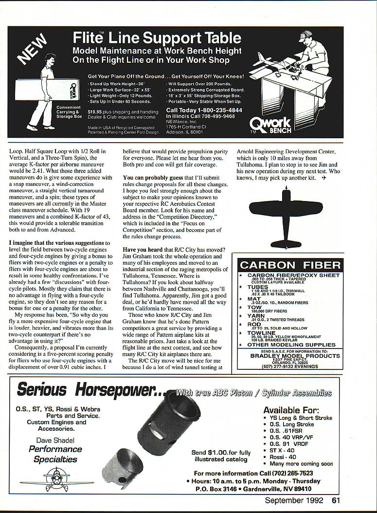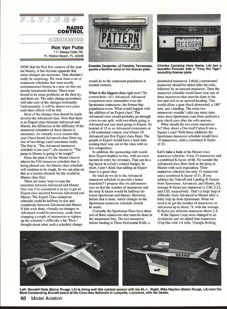 L ILL V E D IO CONTROL Ron Van Putte 111 Sleepy Oaks Rd Ft Walton Beach FL 32548 NOW first few contests year history has become apparent some changes necessary shouldnt really surprising went set maneuver schedules mostly nontumaround format new set mostly turnaround format bound some problems first try rules change procedures will take care changes eventually Unfortunately will almost two years until effects will felt Most changes should made involve Advanced class Now no Expert class between Advanced Master difference difficulty maneuver schedules classes enormous virtually contest year have heard Advanced class fliers say two things sometimes both first Advanced maneuver schedule too easy second jump Master going tough Since plan Master class inherit FAI maneuver schedule being phased out Master class schedule will continue tough So can plan known obstacle would-be Master class flier ways ease transition between Advanced Master way Ive considered try get Expert class inserted between Advanced Master Expert Class maneuver schedule could halfway size complexity between Advanced Master done virtually no changes Advanced would necessary aside changing couple maneuvers tighten up schedules difficulty bit thought about what such schedule change would contestant population normal contests What biggest class right now No contest hereits Advanced Advanced competitors now outnumber Sportsman contestants former bigpopulation event What would happen addition Expert class Advanced class would probably go through two-to-one split two-thirds going Advanced one-third going Expert So instead 15 Advanced contestants 50-contestant contest youd have 10 Advanced five Expert class fliers people Expert would have hard time earning way out class few competitors addition sponsoring club would have Expert trophies buy no extra income entry fee revenues can big factor clubs contest budget short dont think adding Expert class good idea So what Advanced maneuver schedule provide better transition propose add maneu vers number maneuvers total K-factor would halfway tween Sportsman Master However before done minor changes Sportsman maneuver schedule should made Currently Sportsman fliers have three sets three maneuvers must done turnaround box last maneuver before landing Three Horizontal Rolls downwind maneuver think turnaround maneuver should added after rolls followed upwind maneuver maneuver schedule would have four sets three maneuvers must done box end upwind heading would allow gear check downwind 1 80 turn landing extra two maneuvers wouldnt take time since Sportsman class fliers perform gear check pass after rolls anyway What should two extra maneuvers about One-half Cuban 8 Square Loop additions Sportsman maneuver schedule would have 14 maneuvers combined K-factor 25 Lets take look Master class maneuver schedule has 23 maneuvers combined K-factor 66 No wonder Advanced class fliers look jump Master such trepidation maneuver schedule has 15 maneuvers combined K-factor 31 subtract Takeoff Landing K-factors Sportsman Advanced Master average K-factor per maneuver 200 223 305 respectively Thats large leap difficulty Advanced Master after baby step up Sportsman What need get number maneuvers Advanced up about 19 average K-factor per airborne maneuver above 24 Square Loop changed Avalanche added four maneuvers Top Hat 1/4 rolls Triangle Rolling Everette Carpenter Franklin Tennessee sports familiar word license plate Charles Castaing New Iberia LA has beautiful Porsche Tony Tiger sounding license plate Left Wendell Dietz Baton Rouge LA doing well contest season SL-1 Right Mike Hayden Baton Rouge LA won Most Outstanding Aircraft award Coon-Ass Nationals Lafayette Louisiana Desire 60 Model Aviation Loop Half Square Loop 1/2 Roll Vertical Three-Turn Spin average K-factor per airborne maneuver would 241 What three added maneuvers give some experience snap maneuver wind-correction maneuver straight vertical turnaround maneuver spin types maneuvers currently Master class maneuver schedule 19 maneuvers combined K-factor 43 would provide tolerable transition both Advanced imagine various suggestions level field between two-cycle engines four-cycle engines giving bonus fliers two-cycle engines penalty fliers four-cycle engines about result some healthy confrontations Ive already few discussions fourcycle pilots Mostly claim no advantage flying four-cycle engine dont see reason bonus penalty other response has So fly expensive four-cycle engine louder heavier vibrates its two-cycle counterpart theres no advantage using Consequently proposal Im currently considering five-percent scoring penalty fliers use four-cycle engines displacement over 091 cubic inches believe would provide propulsion parity Arnold Engineering Development Center everyone Please let hear 10 miles away Both pro con will get fair coverage Tullahoma plan stop see Jim new operation during next test knows may pick up another kit probably guess Ill submit rules change proposals changes hope feel strongly enough about subject make opinions known respective RC Aerobatics Contest Board member Look name address Competition Directory included Focus Competition section become part rules change process Have heard R/C City has moved Jim Graham took whole operation employees moved industrial section raging metropolis Tullahoma Tennessee Tullahoma look about halfway between Nashville Chattanooga youll find Tullahoma Apparently Jim got good deal hed hardly have moved way California Tennessee know RIC City Jim Graham know hes done Pattern competitors great service providing wide range Pattern airplane kits reasonable prices Just take look flight line next contest see R/C City kit airplanes R/C City move will nice because lot wind tunnel testing Serious Horsepower11 0S ST YS Rossi & Webra Parts Service Custom Engines Accessories Dave Shadel Performance Specialties j t / $10Ofor fully illustrated catalog Available VS Long & Short Stroke 06 Long Stroke 0S 6IFSR 05 40 VRP/VF