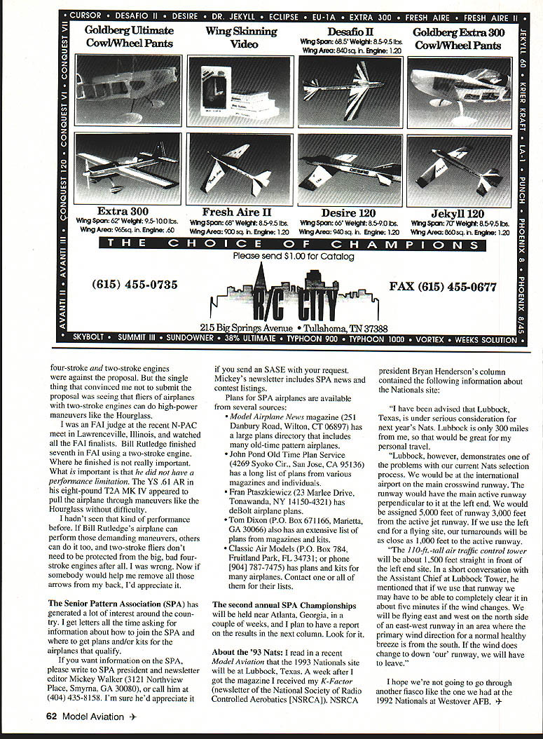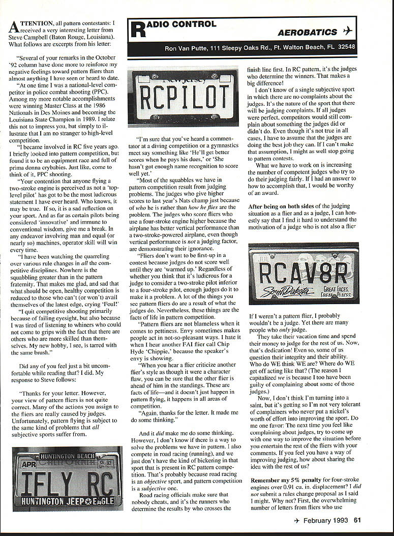 ATTENTION pattern contestants received very interesting letter Steve Campbell Baton Rouge Louisiana What follows excerpts letter Several remarks October 92 column have done reinforce negative feelings toward pattern fliers almost anything have seen heard date time national-level com petitor police combat shooting PPC Among notable accomplishments winning Master Class 1986 Nationals Des Moines becoming Louisiana State Champion 1989 relate impress simply il lustrate am no stranger high-level competition became involved RC five years ago briefly looked pattern competition found equipment race full prima donna crybabies Just like come think PPC shooting contention anyone flying two-stroke engine perceived top level pilot has got ludicrous statement have ever heard knows may true sad reflection sport far certain pilots being considered innovative immune conventional wisdom give break endeavor involving man equal nearly machines operator skill will win time have watching quarreling over various rule changes com petitive disciplines Nowhere squabbling greater pattern fraternity makes glad sad what should open healthy competition reduced cant wont avail themselves latest edge crying Foul quit competitive shooting primarily because failing eyesight also because tired listening whiners could come grips fact others skilled selves new hobby see tarred same brush Did feel just bit uncom fortable reading did response Steve follows Thanks letter However view pattern fliers quite correct actions assign fliers really caused judges Unfortunately pattern flying subject same kind problems subjective sports suffer RADIO CONTROL IRCPLOTI Im sure youve heard commen tator diving competition gymnastics meet say something like Hell get better scores pays dues hasnt got enough name recognition score well yet Most squabbles have pattern competition result judging problems judges give higher scores last years Nats champ just because rather flies problem judges score fliers use four-stroke engine higher because airplane has better vertical performance two-stroke-powered airplane though vertical performance judging factor demonstrating ignorance Fliers dont want first-up contest because judges score well until warmed up Regardless whether think its ludicrous judge consider two-stroke pilot inferior four-stroke pilot enough judges make problem lot things see pattern fliers result what judges Nevertheless things facts life pattern competition Pattern fliers blameless comes pettiness Envy sometimes makes people act not-so-pleasant ways hate hear another FAI flier call Chip Hyde Chippie because speakers envy showing hear flier criticize another fliers style though character flaw can sure other flier ahead him standings facts lifeand doesnt just happen pattern flying happens areas competition Again thanks letter made some thinking did make some thinking However dont know way solve problems have pattern also compete road racing running just dont have kind bickering sport present RC pattern compe tition Thats probably because road racing objective sport pattern competition subjective Road racing officials make sure nobody cheats its runners determine results crosses AEROBATICS sh line first RC pattern its judges determine winners makes big difference dont know single subjective sport no complaints about judges Its nature sport will judging complaints judges perfect competitors would still com plain about something judges did didnt though its true cases have assume judges doing best job can cant make assumption might well stop going pattern contests What have work increasing number competent judges try judging fairly answer to accomplish would worthy award After being both sides judging situation flier judge can hon estly say find hard understand motivation judge also flier werent pattern flier probably wouldnt ajudge Yet people judge take vacation time spend money judge rest us Now thats dedication some us question integrity ability WE think WE WE get off acting like reason capitalized because too have guilty complaining about some judges Now dont think Im turning saint its getting Im very tolerant complainers never put nickels worth effort improving sport favor next time feel like complaining about judges try come up way improve situation before entertain rest fliers comments feel have way improving judging about sharing idea rest us Remember 5% penalty four-stroke engines over 091 cu displacement did submit rules change proposal said might First overwhelming number letters fliers use uary 1993 61 GoldbergUltimate Cowl/Wheel Pants Wing Skinning Video Desaflo II 685 WeIgh 85-95 lbs 840sc120 GoldbergF 300 CowY Wheel Pants Please send $100 Catalog 615 455-0735 r% FAX 615 455-0677 215 Bi Springs Avenue ahoma TN 37388 four-stroke two-stroke engines against proposal single thing convinced submit proposal seeing fliers airplanes two-stroke engines can high-power maneuvers like Hourglass FAI judge recent N-PAC meet Lawrenceville Illinois watched FAI finalists Bill Rutledge finished seventh FAI using two-stroke engine finished really important What important did have performance limitation YS 61 AR eight-pound T2A MK IV appeared pull airplane through maneuvers like Hourglass difficulty hadnt seen kind performance before Bill Rutledges airplane can perform demanding maneuvers others can too two-stroke fliers dont need protected big bad fourstroke engines after wrong Now somebody would help remove arrows back Id appreciate Senior Pattern Association SPA has generated lot interest around coun try get letters time asking information about join SPA get plans and/or kits airplanes qualify want information SPA please write SPA president newsletter editor Mickey Walker 3121 Northview Place Smyrna GA 30080 call him 404 435-8158 Im sure hed appreciate send SASE request Mickeys newsletter includes SPA news contest listings Plans SPA airplanes available several sources Model Airplane News magazine 251 Danbury Road Wilton CT 06897 has large plan