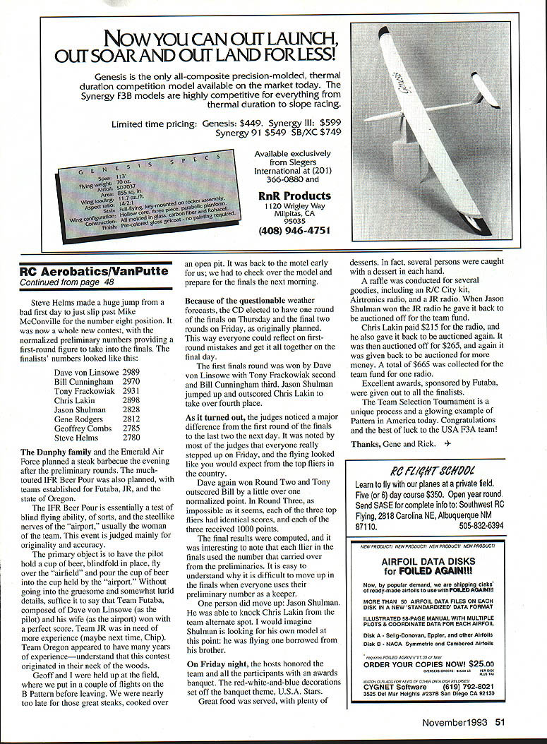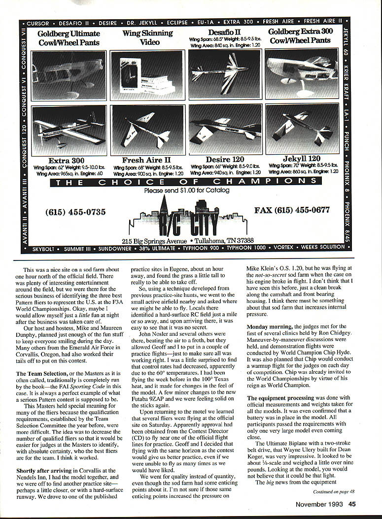 RADIO CONTROL AEROBATICS THIS MONTHS COLUMN will report F3A Team Selection Finals prepared Gene Rodgers Ft Worth Texas competitors Gene flew well qualified finals finished sixth called him report receipt text matrix congratulated him placing responded something like just goes show blind pig can find food once know took pictures However captioned sent NSRCAs president Rick Allison also Pattern columnist Model Builder Rick too thrilled Model Aviations publication schedule would probably help scoop him reporting Team Selection results Nevertheless gentleman about sent pictures anyway Okay Gene its yours June 5 19931 flew great Northwest 1993 F3A Team Selection Contest held Corvallis Oregon week June 7-11 normal questions zoomed through head walked off airplane Portland Did model make damage didnt bring heavier clothing cool temperatures was supposed meet partnerat gate baggage claim area Some questions quickly answered saw Geoff Combs waiting gate just short walk baggage claim equipment model box seems getting bigger time fly out town arrived damage no time practice site near Salem know everyone must have secret site can get away everyone else practice way no can see maneuver having problems laugh whatever supposed concerned 44 Model Aviation allis Oregon Don Weitz James Mike Klein gets Nemesis ready go Bennett Dave von Linsowe bundle up case OS 120 broke flight Gene Rodgers puts finals flight Geoff Combs calling 93 US F3A Team & mechanics L-R Greg Frohreich Tony Frackowiak Bill CUnIIngllum nwas nris L8KI5 I-ascrnation Tor Dave von Linsowe Janell von Linsowe Bill Cunningham Chris Lakin sound check Lakin just missed F3A team Gene Rodgers Geoff Combs get Geoffs SL-iR ready official attemptThe pits Corvaiiis I-5A team eIectIon Finals Goklberg Ultimate Cowl/Wheel Pants Wing Sldnning Video Desaflo U Wing Span 685 WeIgli 85-95 WInaAra840sah 120 GeldbergEzbi 300 Cowl/Wheel Pants Please send $100 Catalog FAX 615 455-0677 UTb 111111 215 Bg Springs Avenue homa TN 37388 nice site sod farm about hour north official field plenty interesting entertainment around field serious business identifying three best Pattern fliers represent US F3A World Championships Okay maybe would allow myself just little fun night after business taken care host hostess Mike Maureen Dunphy planned just enough fun stuff keep everyone smiling during day others Emerald Air Force Corvallis Oregon also worked tails off put contest Team Selection Masters often called traditionally completely run bookthe FAI Sporting Code case always perfect example what serious Pattern contest supposed Masters held special meaning fliers because qualification requirements established Team Selection Committee year before difficult idea decrease number qualified fliers would easier judges Masters identify absolute certainty best fliers team think worked Shortly after arriving Corvallis Nendels Inn model together off find another practice siteperhaps little closer hard-surface runway drove published practice sites Eugene about hour away found grass little tall really able take off So using technique developed previous practice-site hunts went small active airfield nearby asked might able fly Locals identified hard-surface RC field just mile away upon arriving easy see no secret John Nosler several others beating air froth allowed Geoff Ito put couple practice flightsjust make sure working right little surprised find control rates decreased apparently due 600 temperatures flying week before 1000 Texas heat made changes feel model few minor changes new Futaba 9ZAP feeling solid sticks again Upon returning motel learned several fliers flying official site Saturday Apparently approval obtained Contest Director CD fly near official flight lines practice Geoff decided flying same horizon contest would give us better practice unable fly times would have liked went quality instead quantity though sod farm some enticing points about Im sure same enticing points increased pressure Mike Kleins OS 120 flying not-so-secret sod farm case engine broke flight dont think have seen before just clean break along camshaft front bearing housing think must something about sod farm increases internal pressure Monday morning judges met first several clinics held Ron Chidgey Maneuver-by-maneuver discussions held demonstration flights conducted World Champion Chip Hyde also planned Chip would conduct warmup flight judges day - of competition Chip already invited World Championships virtue reign World Champion equipment processing done official measurements weights taken models confirmed battery place model participants passed requirements very large model coming close Ultimate Biplane two-stroke belt drive Wayne Ulery built Dean Koger very impressive looked about -scale weighed little over nine pounds Looking model would believe could light big news equipment Continued page 48 November1993 45 0 q 0 ratirt II Wing Span 62 WelgIt 95-1 00 Wing Span 68 WelgIt 85-95 Wing Ama 965sq Eflw t0 Wing Ama 9CX sq h En1e 120 Wing Span 66 WoIgli 85-90 bs Wing Ama 940 sq h Englns 120 615 455-0735 I] WIg Span MIgrt 5-95 Wing Ama 8W sq b En0w 120 0 0 above statements made Clarence Lee Don Lowe Howard Cr/spin FREE Tech Seppert DS-817-1792 Il LUCRE HEALER OR Cli tar cmplete utile suit self -aditrened 75c stamped #10 envelap S2U ciadltal te 1st order DAVIS MUD PEECTS ex 141 MA II CT 13410 S11-1O1D WIND IT UP AND TURN IT LOOSE GET YOUR CHILDREN STARTED IN MODELING WITH Lanier RCS RB-I King Condor Cat No 92211 Fuselage Length 56 Flying Weight 1 Wing Span 74 Area 629 sq Send SASE Free Color Catalog TODAYI Lanier RC PO Box 458 Oakwood GA 30566 Phone 706/404-532-6401 900-530 EST M-F FAX 706/404-532-2163 FOR THE FIRST TIME EVER Complete multi-camera coverage h-depth interviews building tips Spectacular slow-motion footage Exceptional static detail Exciting soundtrack narration Award-ceremony coverage NOW AVAILABLE TOP GUN 93 BACK WITH THE BEST TOP GUN 92- FLYING WITH THE BEST 4Th ANNUAL JETS OVER DELAND G