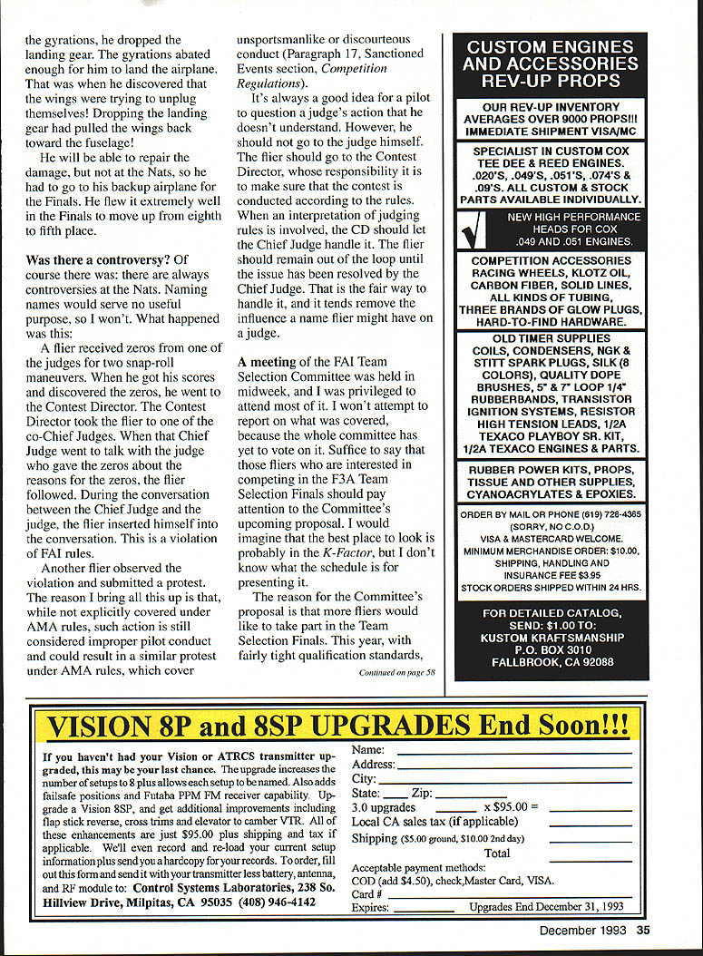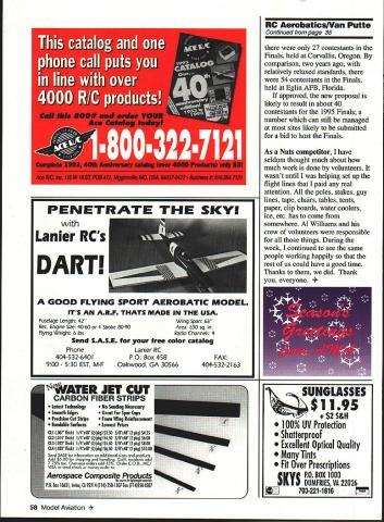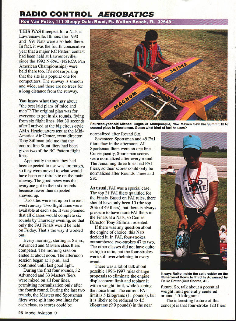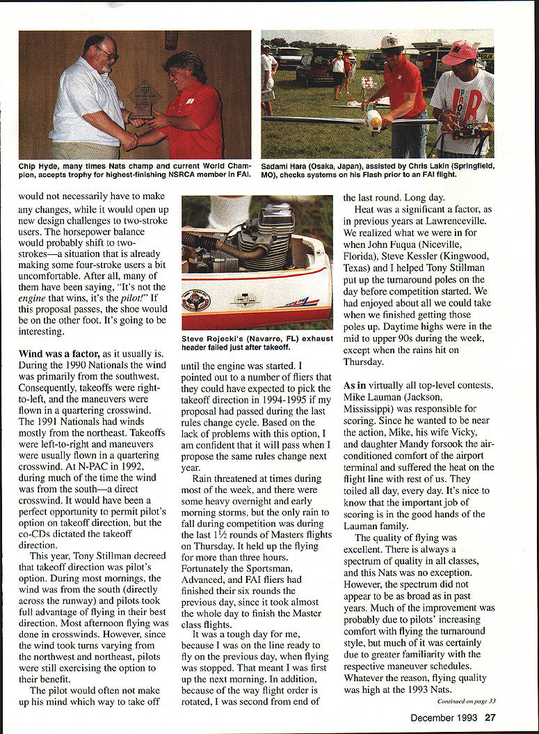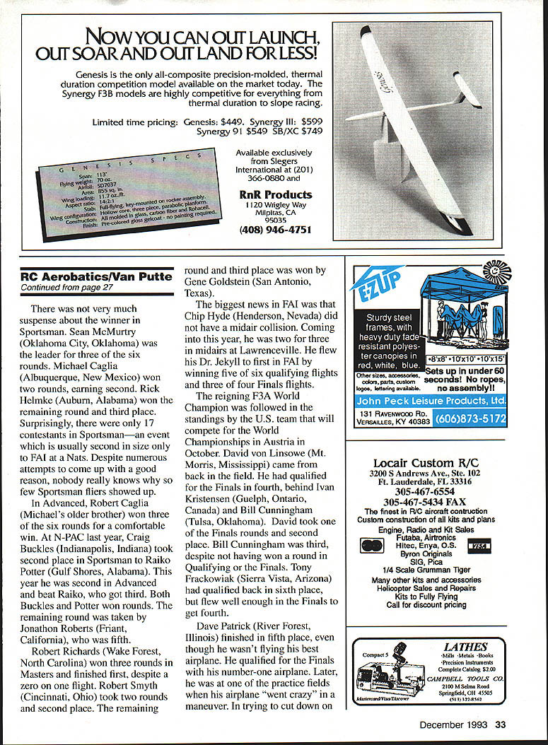 RADIO CONTROL AEROBATICS u I~fr k U S WAS threepeat Nats Lawrenceville Illinois 1990 1991 Nats also held fact fourth consecutive year major RC Pattern contest held Lawrenceville since 1992 N-PAC NSRCA Pan American Championships held too Its surprising site popular competitors runway smooth wide no trees long distance runway know what say about best laid plans mice men original plan everyone get six rounds flying six flight lines 30 seconds after arrived big circus-style AMA Headquarters tent MidAmerica Air Center event director Tony Stillman told control line Stunt fliers given two RC Pattern flight lines Apparently area expected use too rough moved what would have third site main runway good news everyone got six rounds because fewer expected showed up Two sites set up eastwest runway Two flight lines available site planned classes would complete six rounds Thursday evening FAI Finals would held Friday Thats way worked out morning starting 8 am Advanced Masters class fliers competed morning session ended about noon afternoon session began 1 pm continued until last good light During first four rounds 32 Advanced 33 Masters fliers mixed four lines permitting normalization after fourth round During last two rounds Masters Sportsman fliers split two lines class scores could normalized after Round Six Seventeen Sportsman 49 FAI fliers flew afternoon Sportsman fliers line Consequently Sportsman scores normalized after round remaining three lines FAI fliers scores could normalized after Rounds Three Six As usual FAI special case top 21 FAI fliers qualified Finals Based FAI rules should have 10 top 20% 49 fliers always pressure have FAI fliers Finals Nats Contest Director Tony Stillman relented question about engine choice Nats decided FAI four-strokes outnumbered two-strokes 47 two other classes did have quite high ratio four-strokes still overwhelming event lot talk about possible 1996-1997 rules change proposals eliminate engine displacement limit replace weight limit keeping noise limit current FAI limit 5 kilograms 11 pounds likely reduced 45 kilograms 99 pounds near 26 Model Aviation teen-year-old Michael Caglia Albuquerque New Mexico flew Summit Ill second place Sportsman Guess what kind fuel uses says Raiko inside split rudder Runaround flown third Advanced Raiko Patter Gulf Shores AL future So talk about potential weight limit generally centered around 45 kilograms interesting feature concept four-stroke 120 fliers would necessarily have make changes would open up new design challenges two-stroke users horsepower balance would probably shift twostrokesa situation already making some four-stroke users bit uncomfortable After have saying Its engine wins its pilot proposal passes shoe would other foot Its going interesting Wind factor usually During 1990 Nationals wind primarily southwest Consequently takeoffs rightto-left maneuvers flown quartering crosswind 1991 Nationals winds mostly northeast Takeoffs left-to-right maneuvers usually flown quartering crosswind N-PAC 1992 during much time wind southa direct crosswind would have perfect opportunity permit pilots option takeoff direction co-CDs dictated takeoff direction year Tony Stillman decreed takeoff direction pilots option During mornings wind south directly across runway pilots took full advantage flying best direction Most afternoon flying done crosswinds However since wind took turns varying northwest northeast pilots still exercising option benefit pilot would often make up mind way take off until engine started pointed out number fliers could have expected pick takeoff direction 1994-1995 proposal passed during last rules change cycle Based lack problems option am confident will pass propose same rules change next year Rain threatened times during week some heavy overnight early morning storms rain fall during competition during last 1 /2 rounds Masters flights Thursday held up flying three hours Fortunately Sportsman Advanced FAI fliers finished six rounds previous day since took almost whole day finish Master class flights tough day because line ready fly previous day flying stopped meant first up next morning addition because way flight order rotated second end last round Long day Heat significant factor previous years Lawrenceville realized what John Fuqua Niceville Florida Steve Kessler Kingwood Texas helped Tony Stillman put up turnaround poles day before competition started enjoyed about could take finished getting poles up Daytime highs mid upper 90s during week except rains hit Thursday As virtually top-level contests Mike Lauman Jackson Mississippi responsible scoring Since wanted near action Mike wife Vicky daughter Mandy forsook airconditioned comfort airport terminal suffered heat flight line rest us toiled day day Its nice know important job scoring good hands Lauman family quality flying excellent always spectrum quality classes Nats no exception However spectrum did appear broad past years Much improvement probably due pilots increasing comfort flying turnaround style much certainly due greater familiarity respective maneuver schedules Whatever reason flying quality high 1993 Nats Continued page 33 December 1993 27 wI Chip Hyde times Nats champ current World Chain- Sadami Hara Osaka Japan assisted Chris Lakin Springfield pion accepts trophy highest-finishing NSRCA member FAI MO checks systems Flash prior FAI flight Steve Rojeckis Navarre FL exhaust header failed just after takeoff Now ou cAr\1 LAUNCH 01117 SOAR AND 01ff LAND FOR LESS Genesis all-composite precision-molded thermal duration competition model available market today Synergy F3B models highly competitive everything thermal duration slope racing Limited time pricing Genesis $449 Synergy Ill $599 Synergy 91 $549 SB/XC $749 Available exclusively Slegers International 201 366-0880 RnR Products 1120 Wrigley Way Milpitas cA 95035 408 946-4751 very much suspense about winner Sportsman Sean McMurtry Oklahoma City Oklahoma leader three six rounds Michael Cagl