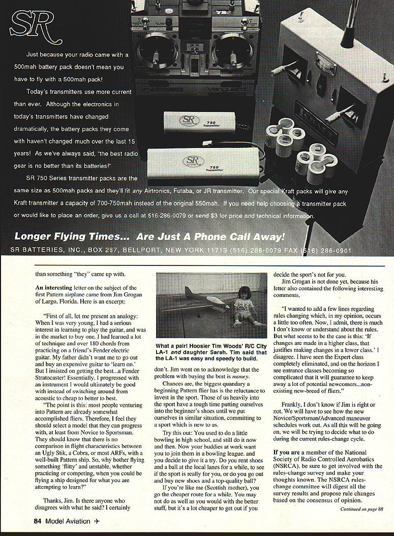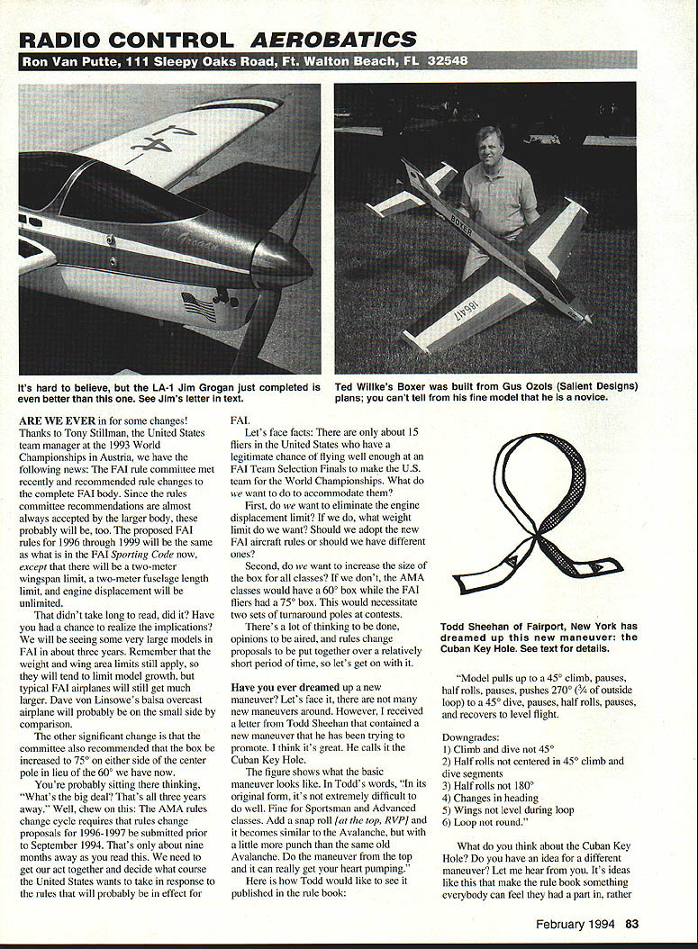 RADIO CONTROL AEROBATICS ARE WE EVER some changes Thanks Tony Stiliman United States team manager 1993 World Championships Austria have following news FAI rule committee met recently recommended rule changes complete FM body Since rules committee recommendations almost always accepted larger body probably will too proposed FAI rules 1996 through 1999 will same what FAI Sporting Code now except will two-meter wingspan limit two-meter fuselage length limit engine displacement will unlimited didnt take long read did Have chance realize implications will seeing some very large models FAI about three years Remember weight wing area limits still apply will tend limit model growth typical FAt airplanes will still get much larger Dave von Linsowe s balsa overcast airplane will probably small side comparison other significant change committee also recommended box increased 750 either side center pole lieu 600 have now Youre probably sitting thinking Whats big deal Thats three years away Well chew AMA rules change cycle requires rules change proposals 1996-1997 submitted prior September 1994 Thats about nine months away read need get act together decide what course United States wants take response rules will probably effect FAt Lets face facts about 15 fliers United States have legitimate chance flying well enough FAI Team Selection Finals make US team World Championships What want to accommodate First want eliminate engine displacement limit what weight limit want Should adopt new FM aircraft rules should have different ones Second want increase size box classes dont AMA classes would have 600 box FM fliers 750 box would necessitate two sets turnaround poles contests Theres lot thinking done opinions aired rules change proposals put together over relatively short period time lets get Have ever dreamed up new maneuver Lets face new maneuvers around However received letter Todd Sheehan contained new maneuver has trying promote think its great calls Cuban Key Hole figure shows what basic maneuver looks like Todds words its original form its extremely difficult well Fine Sportsman Advanced classes Add snap roll [at top RVP] becomes similar Avalanche little punch same old Avalanche maneuver top can really get heart pumping Todd would like see published rule book Todd Sheehan Fairport New York has dreamed up new maneuver Cuban Key Hole See text details Model pulls up 450 climb pauses half rolls pauses pushes 2700 3/4 outside loop 450 dive pauses half rolls pauses recovers level flight Downgrades 1 Climb dive 450 2 Half rolls centered 450 climb dive segments 3 Half rolls 1800 4 Changes heading 5 Wings level during 1oop 6 Loop round What think about Cuban Key Hole have idea different maneuver Let hear Its ideas like make rule book something everybody can feel part rather February 1994 83 Its hard believe LA-i Jim Grogan just completed better See Jims letter text Ted Wilikes Boxer built Gus Ozols Salient Designs plans cant tell fine model novice something came up An interesting letter subject first Pattern airplane came Jim Grogan Largo Florida excerpt First let present analogy very young serious interest learning play guitar market buy learned lot technique over 180 chords practicing friends Fender electric guitar father didnt want go out buy expensive guitar learn insisted getting best. Fender Stratocaster Essentially progressed instrument would ultimately good instead switching around acoustic cheap better best point people venturing Pattern already somewhat accomplished fliers Therefore feel should select model can progress least Novice Sportsman should know no comparison flight characteristics between Ugly Stik Cobra ARFs well-built Pattern ship So bother flying something flitty unstable whether practicing competing could flying ship designed what attempting learn Thanks Jim anyone disagrees what said certainly dont Jim went acknowledge problem buying best money Chances biggest quandary beginning Pattern flier has reluctance invest sport us heavily sport have tough time putting ourselves beginners shoes until put ourselves similar situation committing sport new us Try out used little bowling high school still now Now buddies work want join bowling league decide give try rent shoes ball local lanes see sport really you go out buy new shoes top-quality ball youre like Scottish mother go cheaper route may well would better stuff its lot cheaper get out decide sports Jim Grogan done yet because letter also contained following interesting comments wanted add few lines regarding rules changing opinion occurs little too often Now admit much dont know understand about rules what seems case changes made higher class justifies making changes lower class disagree have seen Expert class completely eliminated horizon see entrance classes becoming complicated will guarantee keep away lot potential newcomers. nonexisting new-breed fliers~ Frankly dont know Jim right will have see new Novice/Sportsman/Advanced maneuver schedules work out As will going will trying decide what during current rules-change cycle yon member National Society Radio Controlled Aerobatics NSRCA sure get involved rules-change survey make thoughts known NSRCA ruleschange committee will digest survey results propose rule changes based consensus opinion Continued page 88 84 Model Aviation pair Hoosier Tim Woods R/C City LA-i daughter Sarah Tim said LA-i easy speedy build SitelMunninghoff Continued page 82 paved 57600 square feet runways taxiways parking ramps After coordinating County Roads Department installed large culvert under entry public highway Since weve added gate half mile five-strand barbed-wire fence private gates rancher still has access remainder land keep cattle off runways bleachers shed lockable storage flagpoles protected pilots boxes organized parking area other niceties date weve spent about $35000 just about clubs treasury Weve hosted couple Scale Masters Qualifiers plan run half-a-dozen contests year work worth can tell pi