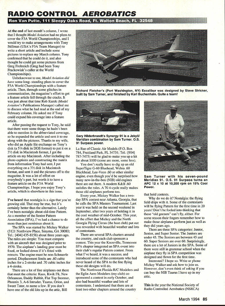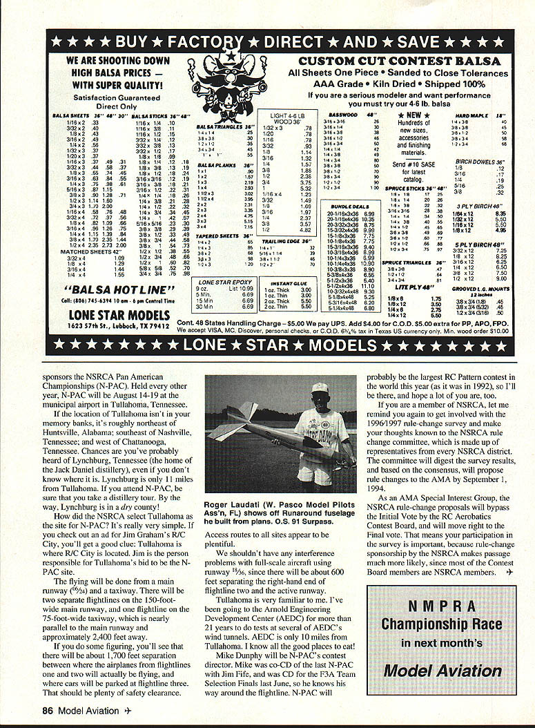 RADIO CONTROL AEROBATICS end last months column wrote thought Model Aviation no plans cover F3A World Championships would try make arrangements Tony Stiliman USAs F3A Team Manager write short article include some pictures replace March column Tony confirmed could also thought could get some pictures Greg Frohreich Greg Tony Frackowiak s caller World Championships Unbeknownst Model Aviation did have some long- standing plans cover F3A World Championships feature article through some glitches communication magazines effort get feature article fell through cracks just about time Rob Kurek Model Aviations Publications Manager called discuss what read end February column asked Tony could expand coverage feature article After passing request Tony said some things hadnt able mention abbreviated coverage expanded article sent along pictures Thanks wife did Apple file exchange Tonys disk 5 disk DOS format put 31/2 disk Macintosh format got article Macintosh After including photo captions constructing matrix information Tony sent put everything 31/2 disk Macintosh format sent pictures off magazine lot effort everybodys part worth have feature article F3A World Championships hope enjoy Tonys article elsewhere issue Ive heard nostalgia sign youre growing old may true its certainly better alternative Lately Ive nostalgic about old-time Pattern As member Senior Pattern Association SPA Ive chance just reminisce about SPA started Mickey Walker 3121 Northview Place Smyrna GA 30080 Tel [404] 435-8158 about three years ago rules simple must compete aircraft designed prior 1970 airplanes landing gear must fixed locked down its fitted retracts engine must non-Schnuerle ported Displacement limits 60 cubic inches 2-stroke 70 cubic inches 4-stroke lot fine airplanes out meet criteria Kaos Kwik Fli New Orleanean Daddy Rabbit Flat Top Stormer Phoenix 3 A-6 Intruder Taurus Orion Sweet Tator name few dont have old kits up attic Bill La Rue Classic Air Models PO Box 784 Fruitland Park FL 34731 Tel [904] 787-7475 will glad make up kit for about $100 some some less dont really have dig up old SuperTigre G-60 Bluehead Webra 60 Blackhead Lee-Veco 60 other similar engine though youd surprised new-in-the-box NIB old engines Out modem K&B 60 satisfies rules 70 4-cycle really makes old airplanes perform too year Mickey Walker has twoday SPA contest near Atlanta Georgia calls SPA Masters Tournament Last year held second weekend September after two years holding cool weather mid-October year effort Mickey North Georgia Flying Circus host club put out rewarded beautiful weather lots contestants several SPA charters around country club sponsors contest year Knoxville Tennessee SPA chapter integrated SPA event clubs regular Pattern contest what Ive heard success introduced some contestants never heard SPA fine flying old designs will Northwest Florida RIC Modelers Eglin Aero Modelers club co sponsored contest early October also beautiful weather lots contestants understand least two other chapters around country hold contests Nostalgia flying field drips Some contestants will flying Pattern first time 20 years Dont fooled thinking old geezers cant fly either some reason fingers remember make airplanes perform just well did years ago three SPA categories Junior Senior Super Senior Juniors under 45 Seniors between 45 60 Super Seniors over 60 Surprisingly lot Juniors SPA Some still grammar school airplane fly SPA competition designed flown first time Interested hope Write phone Mickey Walker ask join us However dont think asking can buy NIB Taurus have up attic year National Society Radio Controlled Aerobatics NSRCA March 1994 85 Richard Fletchers Port Washington NY Excalibur designed Steve Stricker built Sam Turner finished Karl Buchenhain Quite team Gary Hilderbrandts Synergy 91 Jekyll/ Meridian combination Sam Turner OS 91 Surpass power Sam Turner seven-pound Meridian 91 05 91 Surpass turns APC 12 x 10 10200 rpm 15% Cool Power 3A WE ARE SHOOTING DOWN HIGH BALSA PRICES WITH SUPER QUALITY Satisfaction Guaranteed Direct Only ULSA SHEETS 36 48 30 *ALU SlICKS 36 48 1/16x233 3/32s240 1/8243 3/16249 1/4s256 1/32337 1/20x337 1/163374931 3/32 x 3445837 1/8x3557445 3/16x3638455 1/4x3759861 5/16s387115 3/8x39012871 1/23114160 3/43110200 1/16x4587648 3/32 4729758 1/848210966 3/16x49612675 1/4x411513984 3/84170235144 1/24235273200 MATCHED SHEETS 42 3/324109 1/8 s4129 3/16s4144 1/4 s4155 1/161/410 1/163/811 1/161/215 3/321/412 3/32x3/813 3/32x1/217 1/8x1/809 1/8x1/412 1/Ba3/813 1/8x1/218 3/16x3/1612 3/16x3/818 3/16x1/222 1/4X1/418 1/43/821 1/4x1/222 1/4x3/434 1/4142 5/165/1623 3/8x3/829 3/81/233 3/8a3/444 3/8a184 1/21/238 1/2a3/448 1/2x160 5/8x5/852 3/43/475 BALSA HOT LINE Ciii 506 745 6394 10. 6pm Ceitrel Tm. w MLU TRIANGLES 36 41425 383830 121239 34 34 45 155 SALU PLANKS36 11190 12157 13218 1,4283 11/213382 11/24398 22231 23335 24478 33515 34718 TAPERED SHEETS 38 142 88 143 88 382 68 383 94 123 120 CUSTOM CUT CONTEST BALSA Sheets Piece ed Close Tolerances AAA Grade Dried ped 100% serious modeler want performance must try 4-6 lb balsa L/GHT 4-6 LB WOOD 36 1/32x378 1/2078 1/1678 3/3293 1/8114 3/16132 1/4157 3/8188 1/2238 3/4375 1532 11654123 3/32149 1/8169 3/16197 1/4237 3/8357 1/2482 18 19 24 19 21 31 26 28 32 4S 57 30 39 49 ______________________ 587RAILDNO EDGE36 7314132 55 6651611439 823811246 7012270 98 LONESTAR EPOXY INSTAmGLUE 9 ozUs 10991 02 Thick300 5 Miti6691 oz Thin300 15 Mm6692oz Thick550 30 Mm6692oz Thin550 aasSwoeo48 31631628 3161430 3163838 3161246 31163460 141442 143849 143480 383860 341230 383490 121340 1234100 SUNOLE DEALS 20-1/16x3a36699 20-1/1 6x4x361035 20-3/32s3a36875 1 5-3/32436999 15-1 /8a3x36775 10-1/8436775 15-3/1 6s3a36940 10-3/16436899 10-1/4336699 10-1/44361090 10-3/8336890 5-3/84x36655 5-1 /2a3a36540 5-1/2x4a361110 O-1/32a4x48930 51/8x4a48525 5-3/1 6x4a48620 5-1/4s4x48680 * NEW * Hundreds new sizes accessories finishing materials Send #10 SASE latest catalog SPRUCE SlICKS 36 48 18 181725 14 142026 18 362232 31631